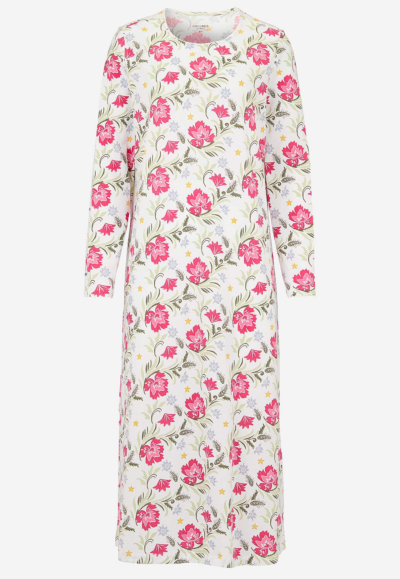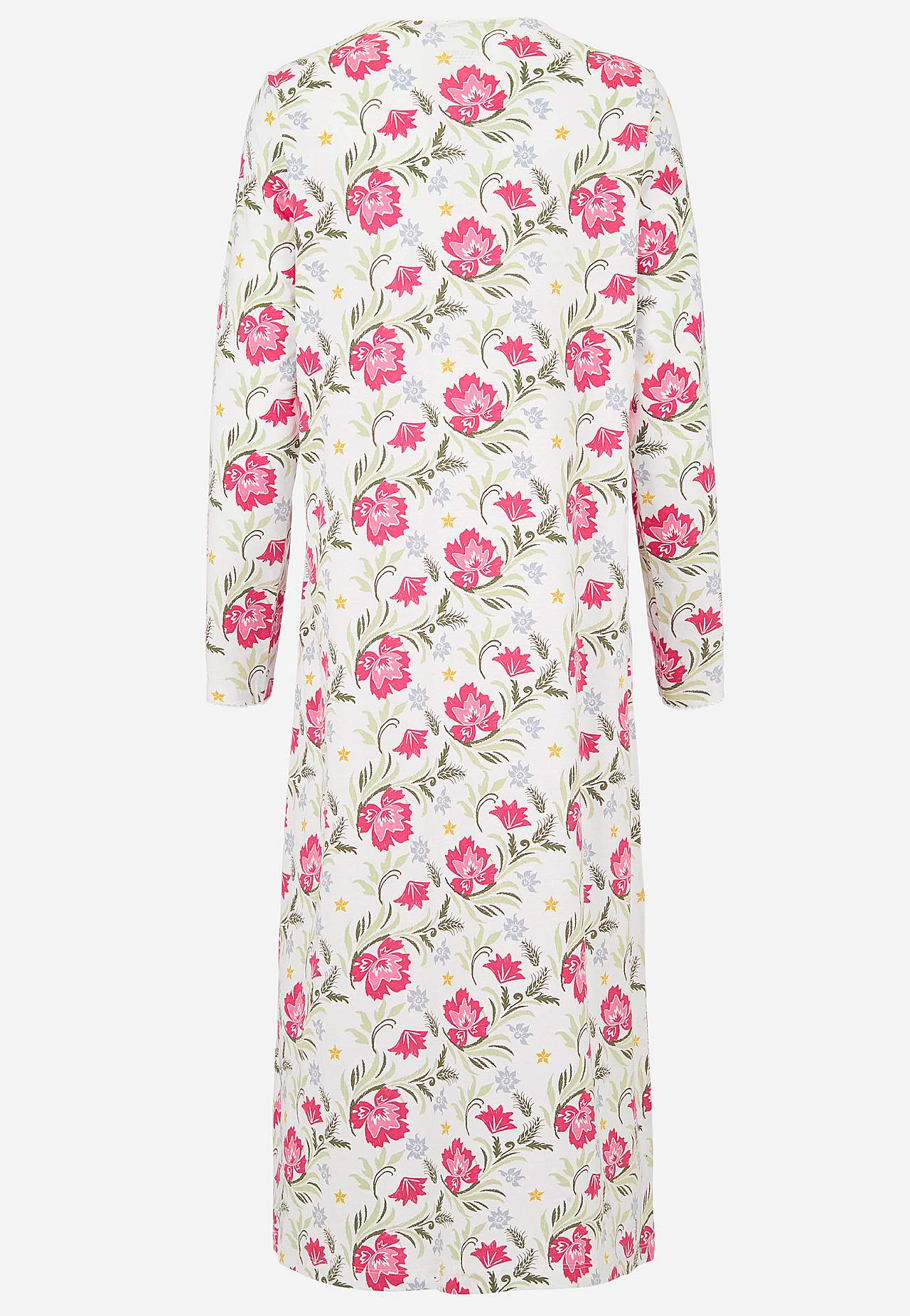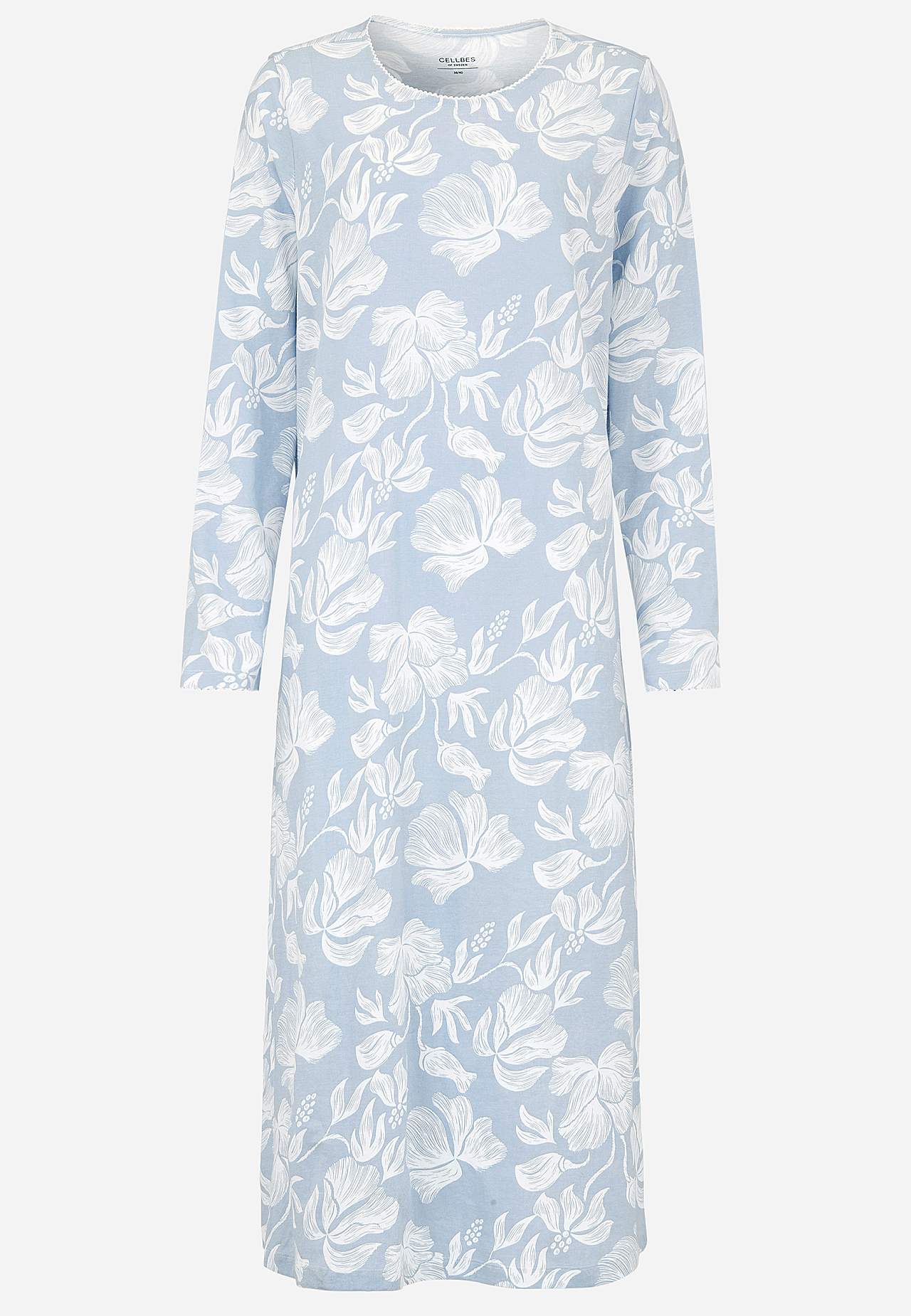 Apaļš kakla izgriezums ar skaistu mežģīņu apmalīti. Garas piedurknes ar mežģīņu apmalīti galā. Taisna apakšmala. Garums no pleciem visiem izmēriem aptuveni 123 cm.