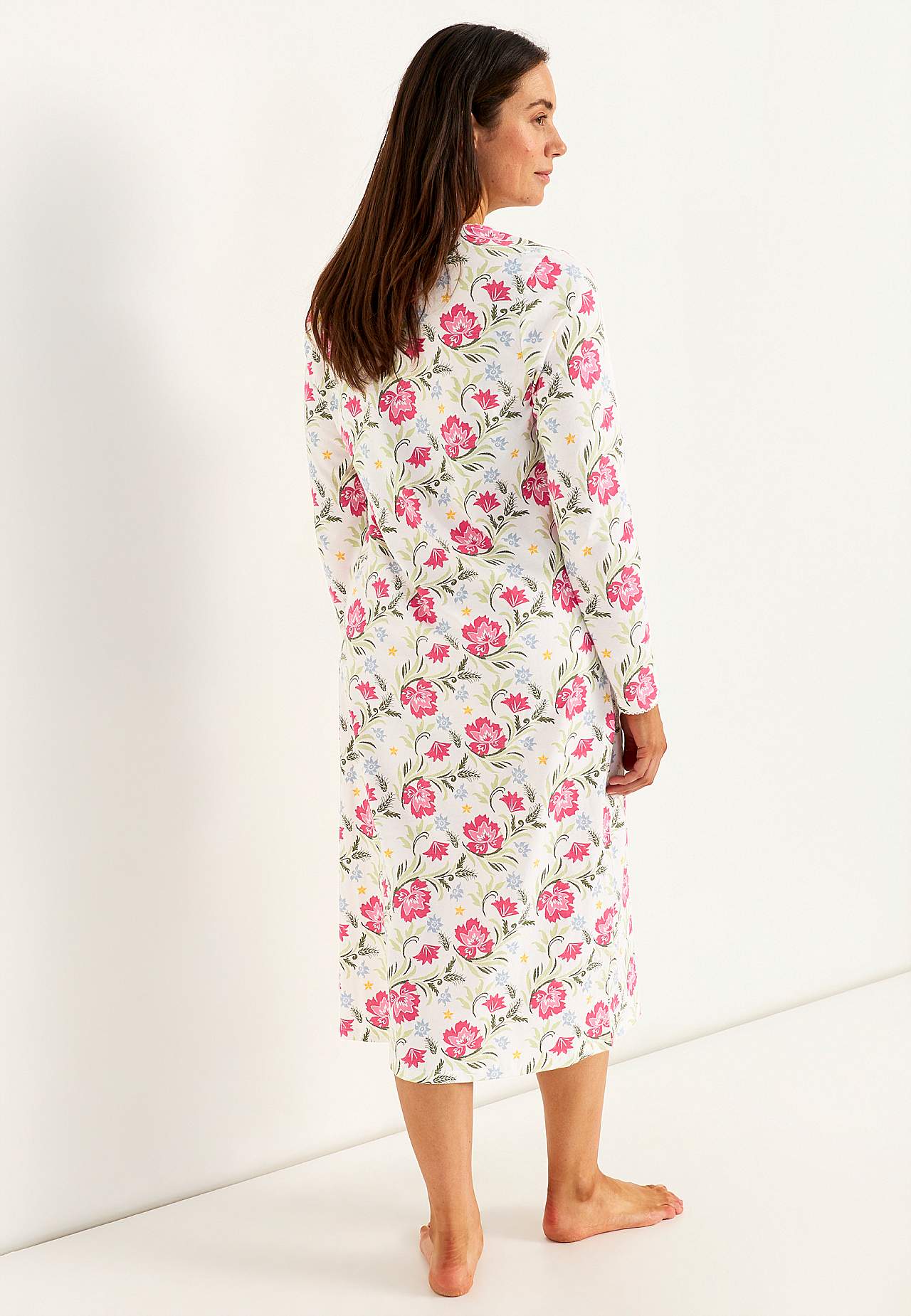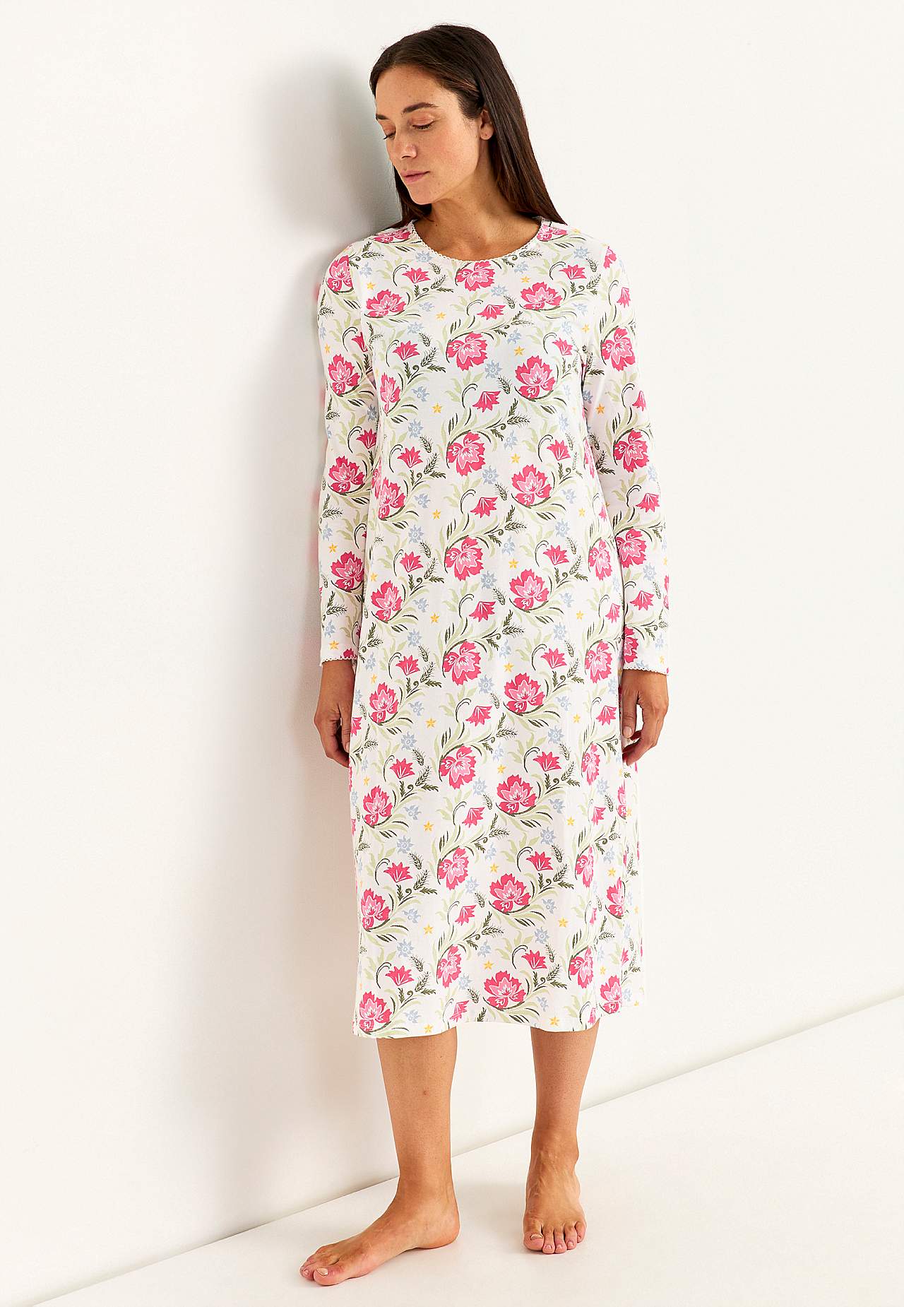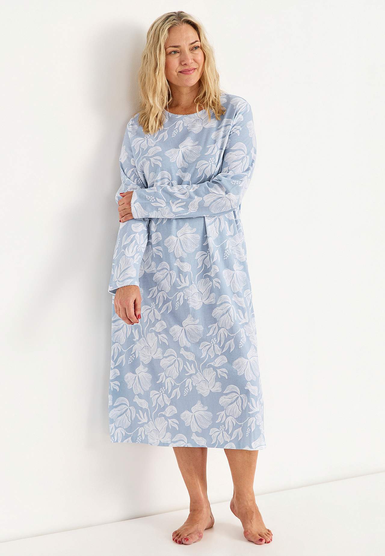 Apaļš kakla izgriezums ar skaistu mežģīņu apmalīti. Garas piedurknes ar mežģīņu apmalīti galā. Taisna apakšmala. Garums no pleciem visiem izmēriem aptuveni 123 cm.