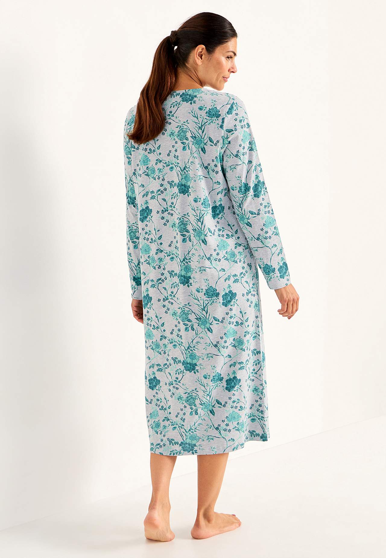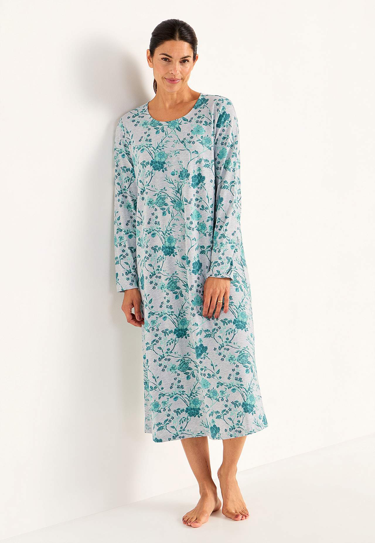 Mīksts organiskās kokvilnas naktskrekls. Taisns piegriezums. Apaļš kakla izgriezums. Garas piedurknes. Taisna apakšmala. Garš modelis ar ziedu raksta apdruku. Garums no pleciem apm. 119 cm visiem izmēriem.