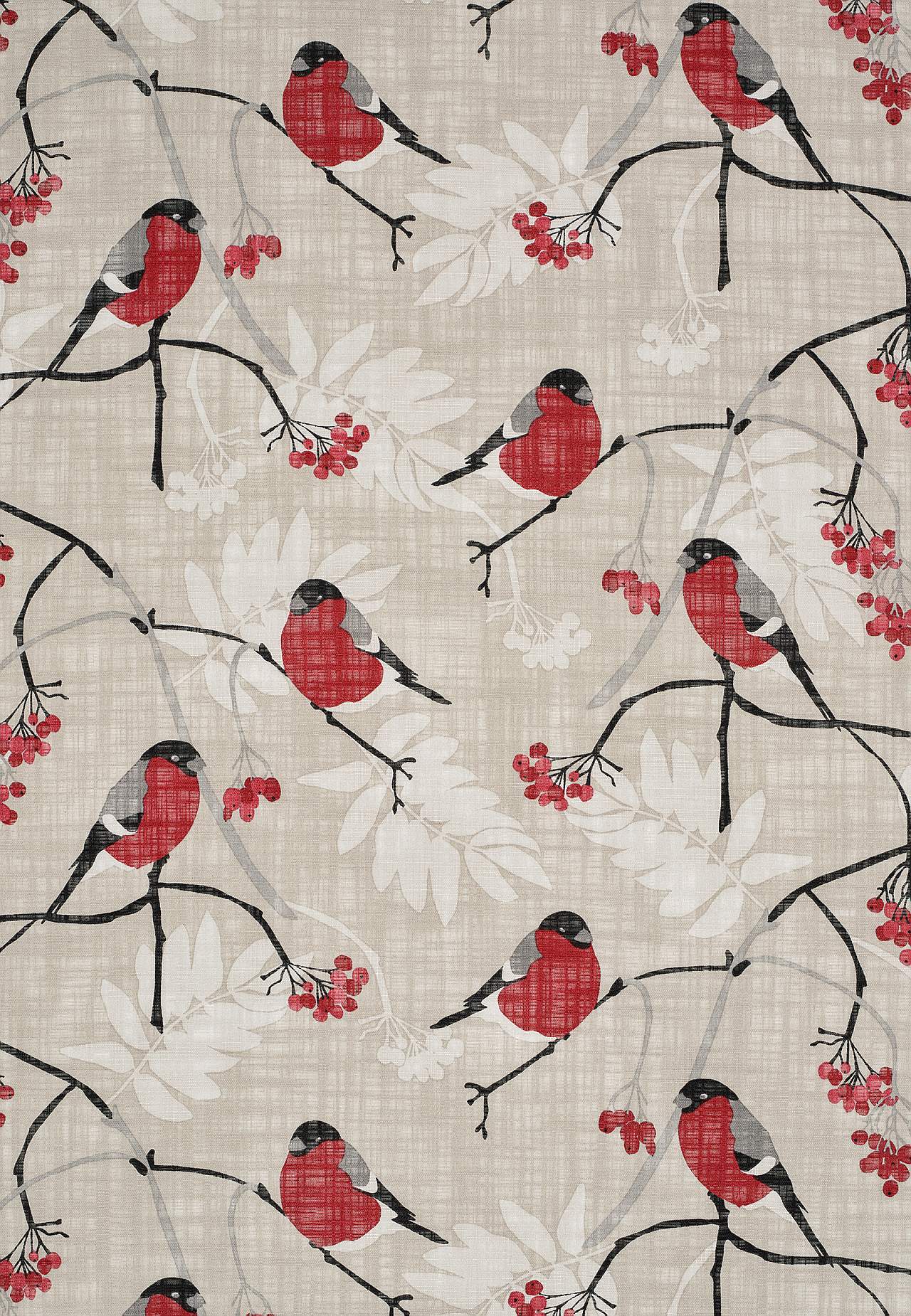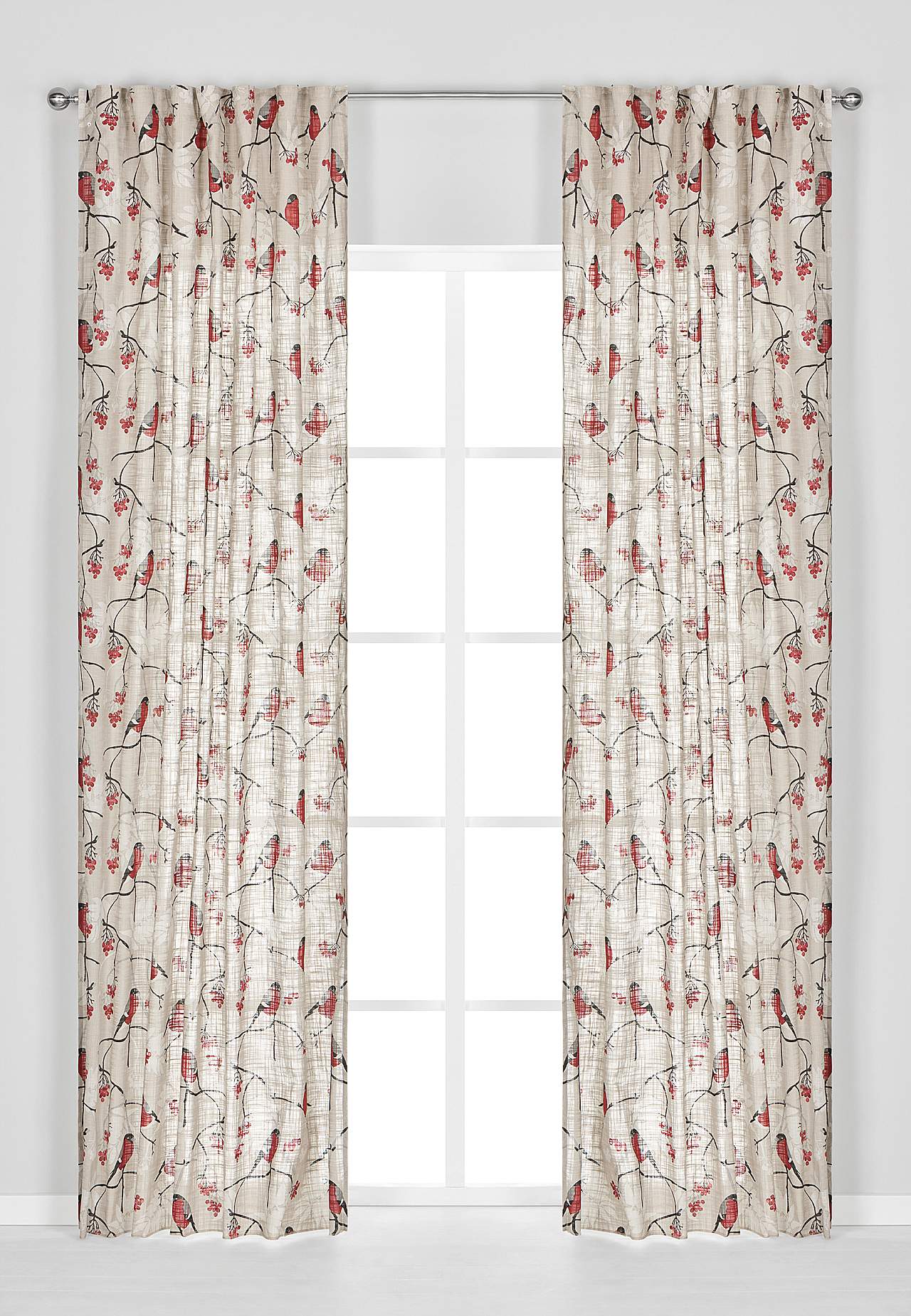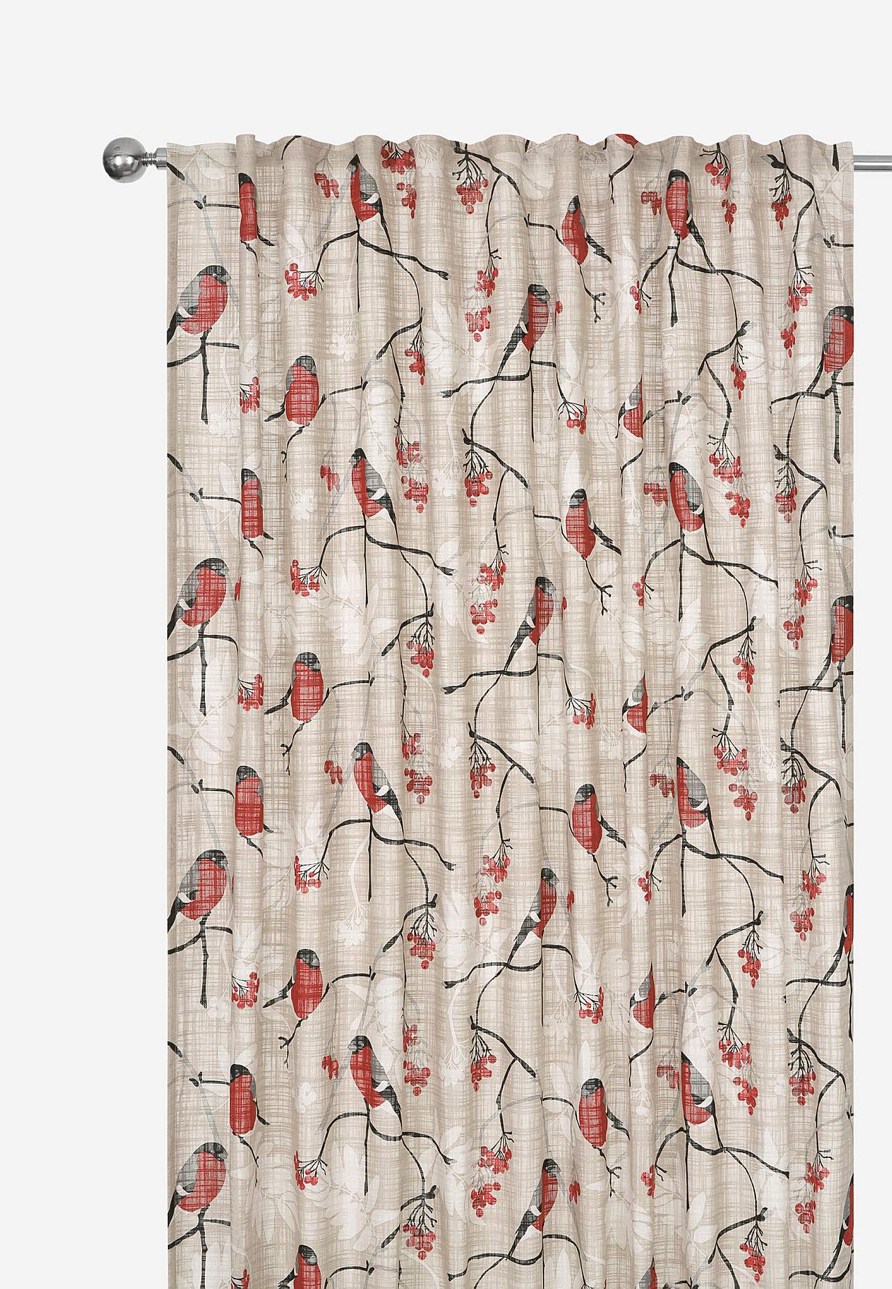Aizkari ar mīlīgu sarkankrūtīšu, lapu un sarkanu ogu apdruku. Ieausti biezāki pavedieni piešķir audumam jauku tekstūru. Laba gaismas caurlaidība. Apdruka ir skaidri redzama arī mugrpusē. Overloka apdare gar apakšmalu.