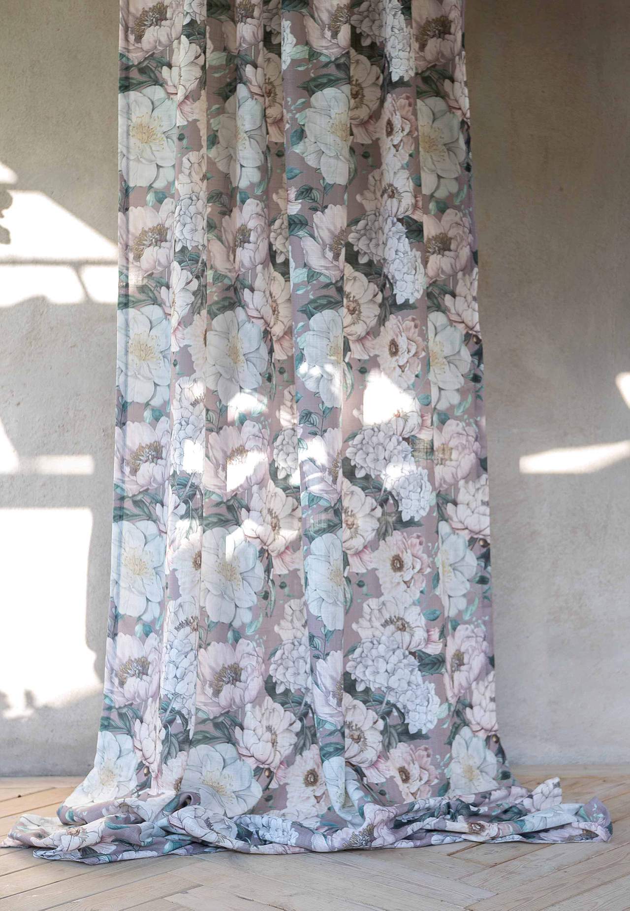 Aizkari ar skaistām peonijām. Materiāls ar jauku kritumu. Ieausti biezāki pavedieni veido jauku tekstūru. Laba gaismas caurlaidība. Apdruka ir skaidri redzama mugurpusē.