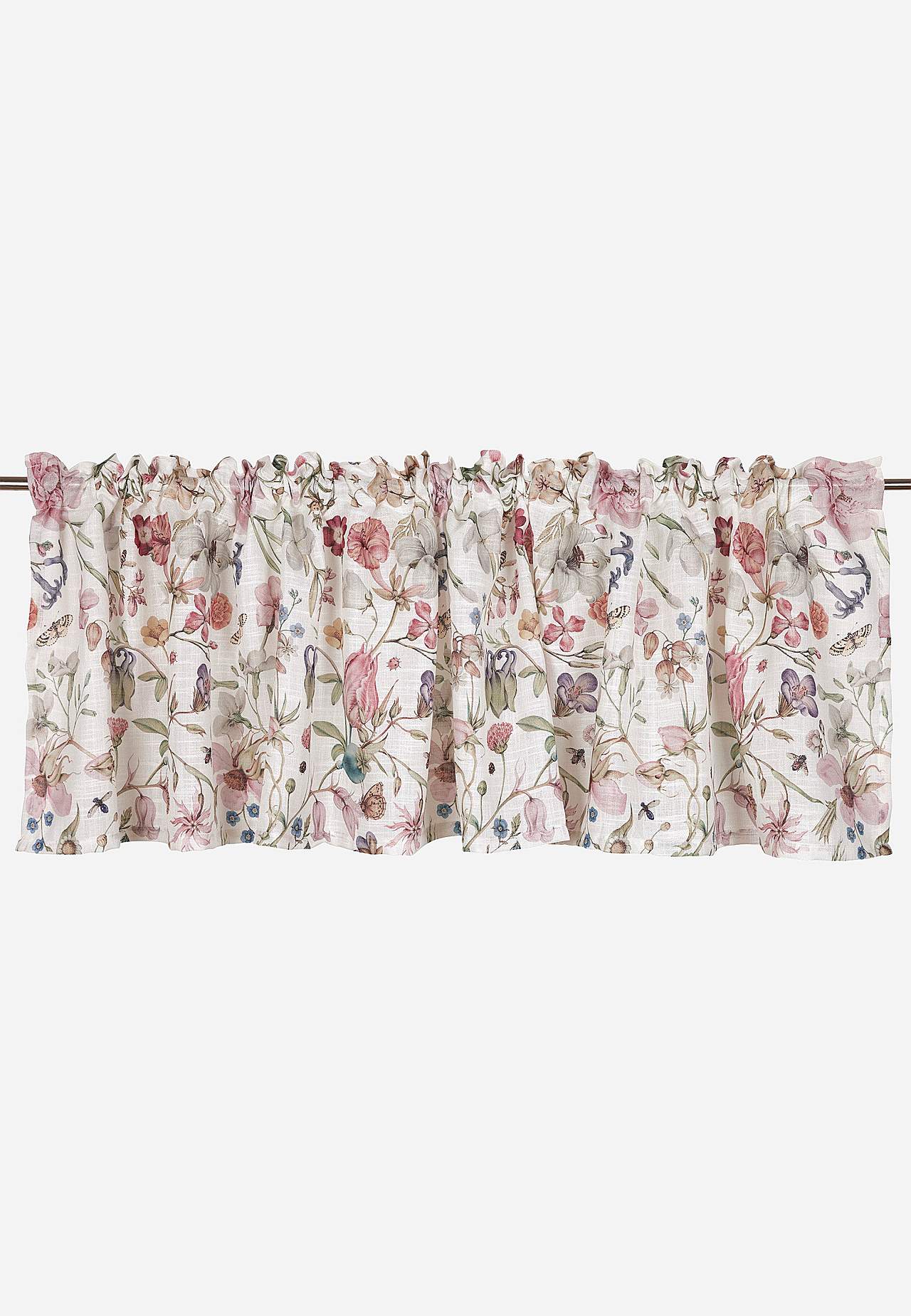 Lambrekens ar ziedu un tauriņu apdruku. Materiāls ar glītu kritumu. Raupjāki ieausti pavedieni veido jauku tekstūru. Laba gaismas caurlaidība. Apdruka ir skaidri redzama arī mugurpusē.
