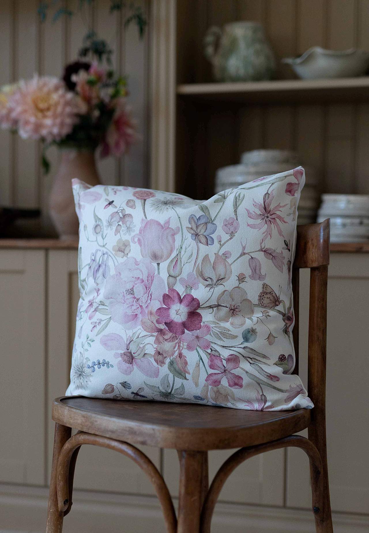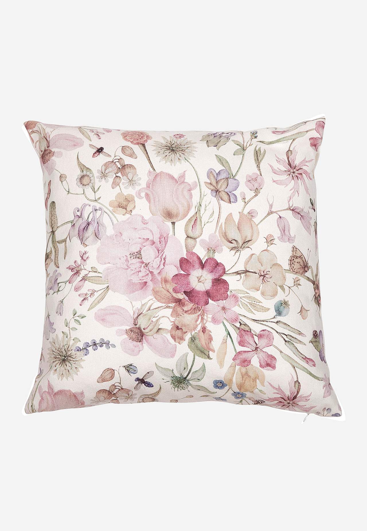 Spilvena pārvalks ar ziediem un tauriņiem. Samtains materiāls ar matētu virsmu. Vienkrāsaina mugurpuse. Rāvējslēdzējs sānos. Izmērs: 48x48 cm.