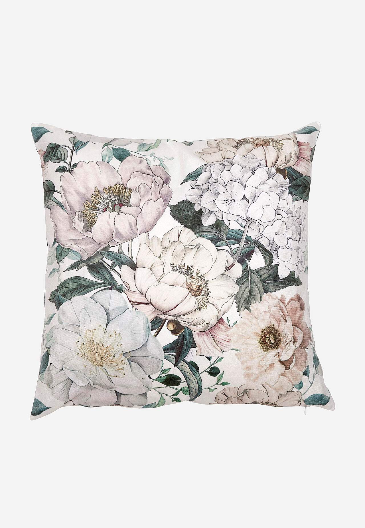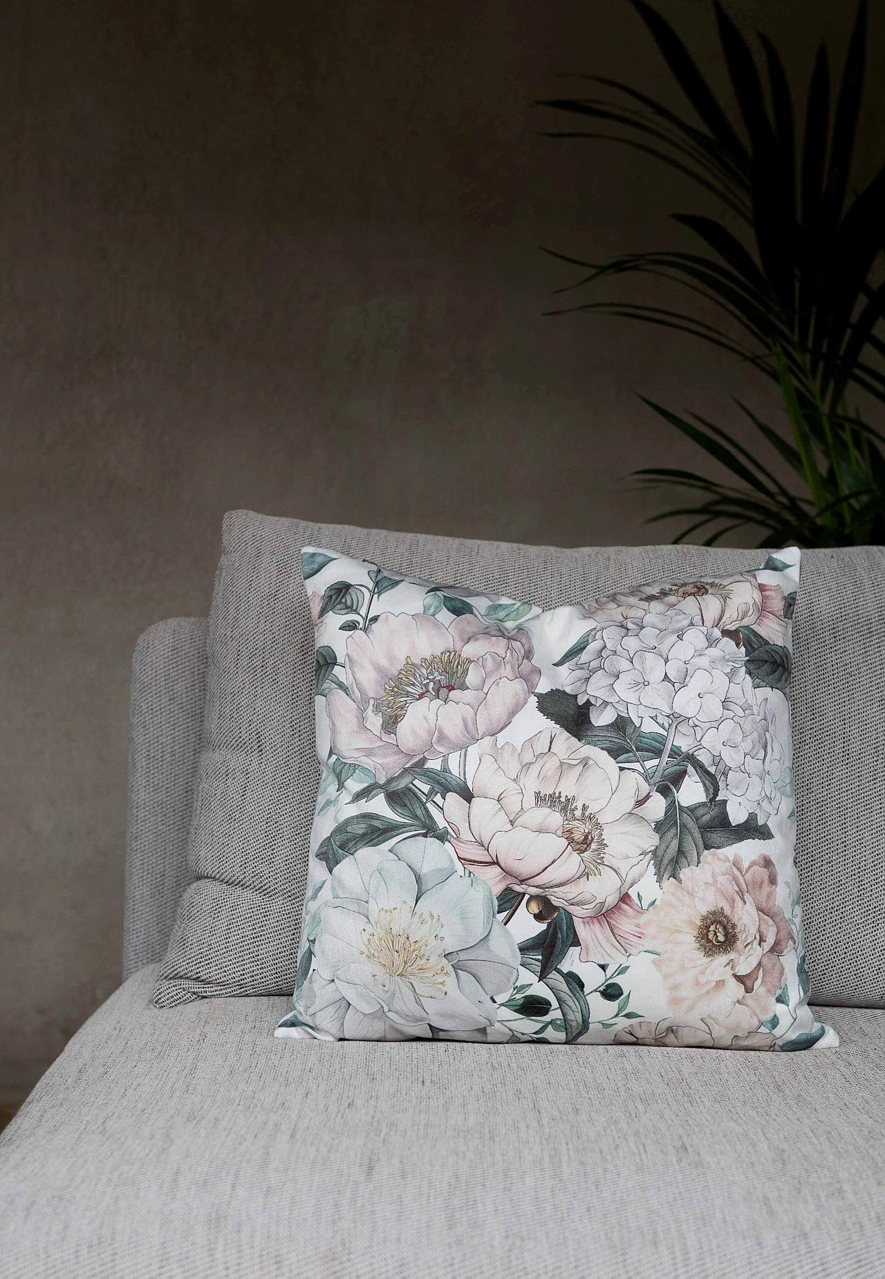 Spilvena pārvalks ar skaistām peonijām un hortenzijām. Mīksts poliestera samta audums. Vienāds raksts priekšpusē un mugurpusē. Rāvējslēdzējs sānos. Izmērs: 45x45 cm.
