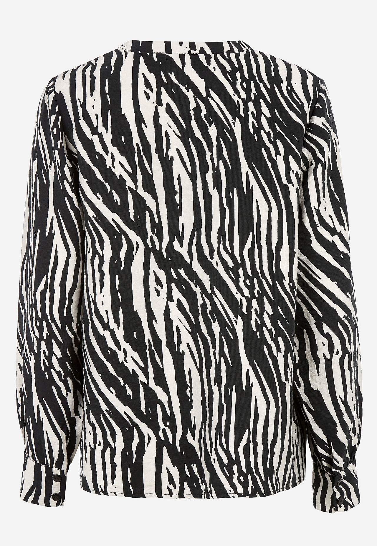 Viļņaini teksturēta auduma blūze ar jauku spīdumu. Nedaudz gludāka tekstūra vienkrāsainajai melnajai blūzei. Viegla A silueta modelis ar pogām. V veida kakla izgriezums. Krūšu iešuves. Noapaļota apakšmala, mugurpusē nedaudz garāka. Garums no pleca atbilstoši izmēram apmēram 65-80 cm.