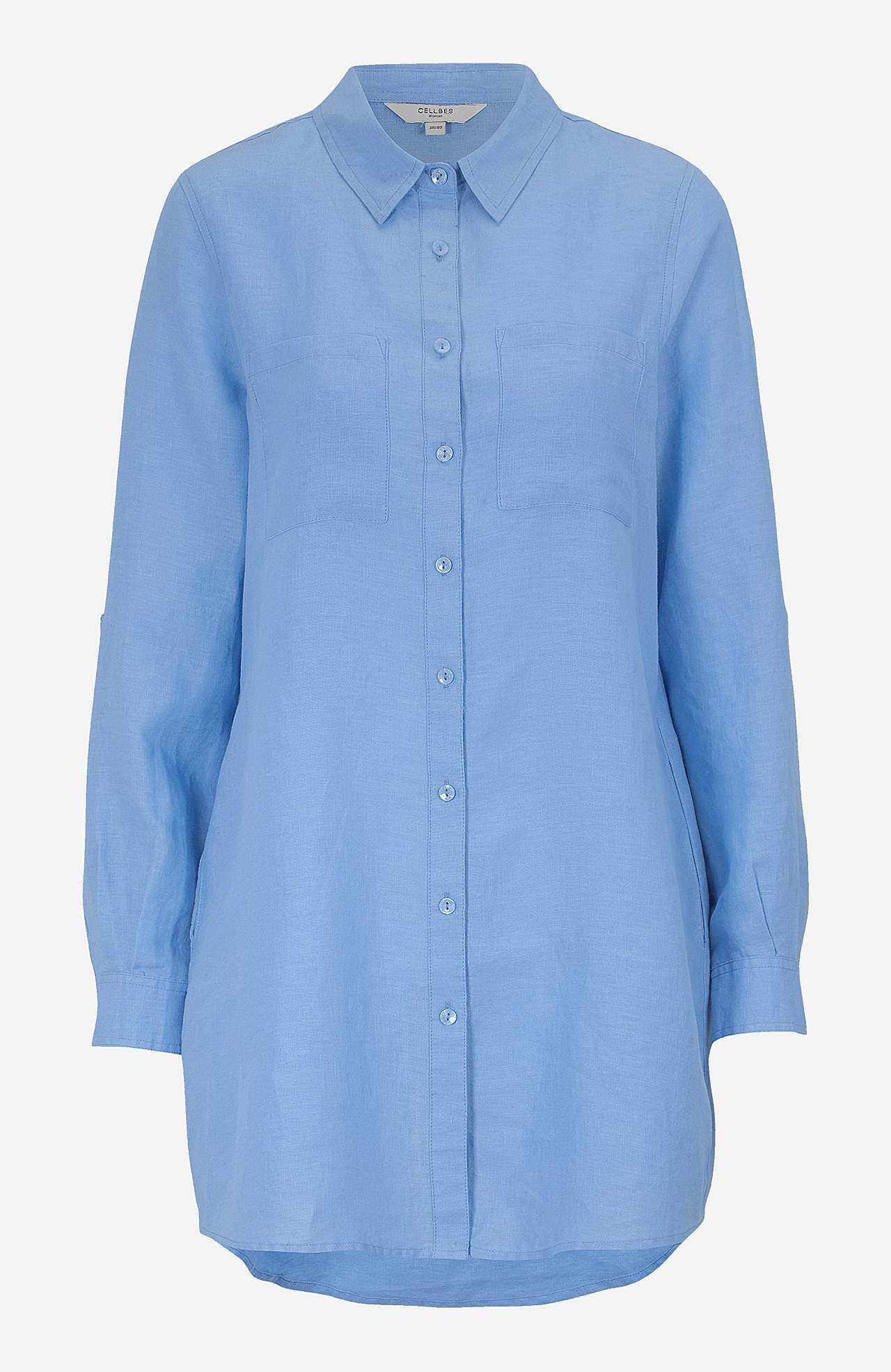 Kvalitatīvs 100% lins. Garš lina krekls ar apkakli. Modelis ar pogu aizdari. Divas krūšu kabatas. Mugurpusē atdaļa un ieloce. Slēptas sānu kabatas. Noapaļota apakšmala. Garums mugurpusē no pleca atkarībā no izmēra apm. 84-96 cm.