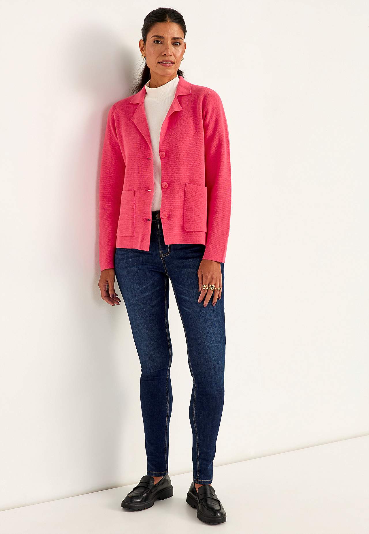 Smalka adījuma jaka, kas izgatavota no biezāka, mīksta, kvalitatīva materiāla. Augumam viegli pieguļošs modelis. Stilīgs dizains, kas lieliski piemērots valkāšanai visu gadu. Trīs lielas pogas. Priekšpusē kabatas. Garas piedurknes. Garums no pleca atbilstoši izmēram apmēram 61-70 cm.