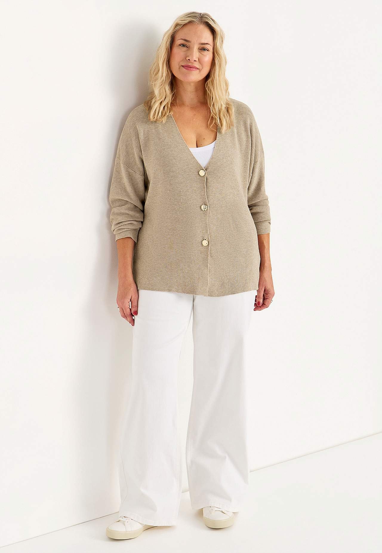 Mīksta, elastīga jaka ar pogām. Viegli pieguļošs piegriezums. Padziļš V veida kakla izgriezums. Dekoratīvas pogas. Nedaudz pazemināta plecu līnija. Garas, taisnas piedurknes. Lieliski piemērota valkāšanai virs topa vai krekliņa. Garums no pleca atbilstīgi izmēram aptuveni 65-73 cm.