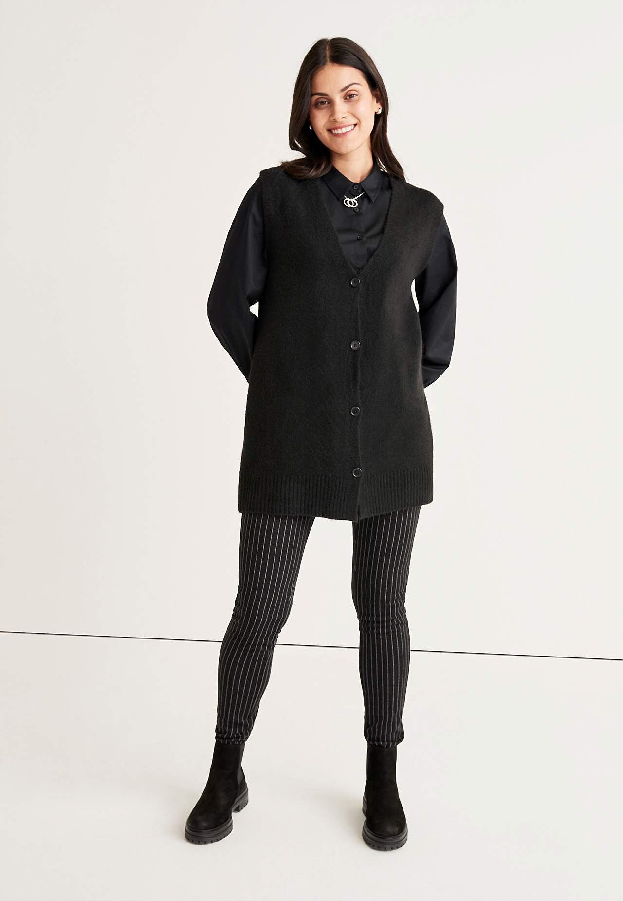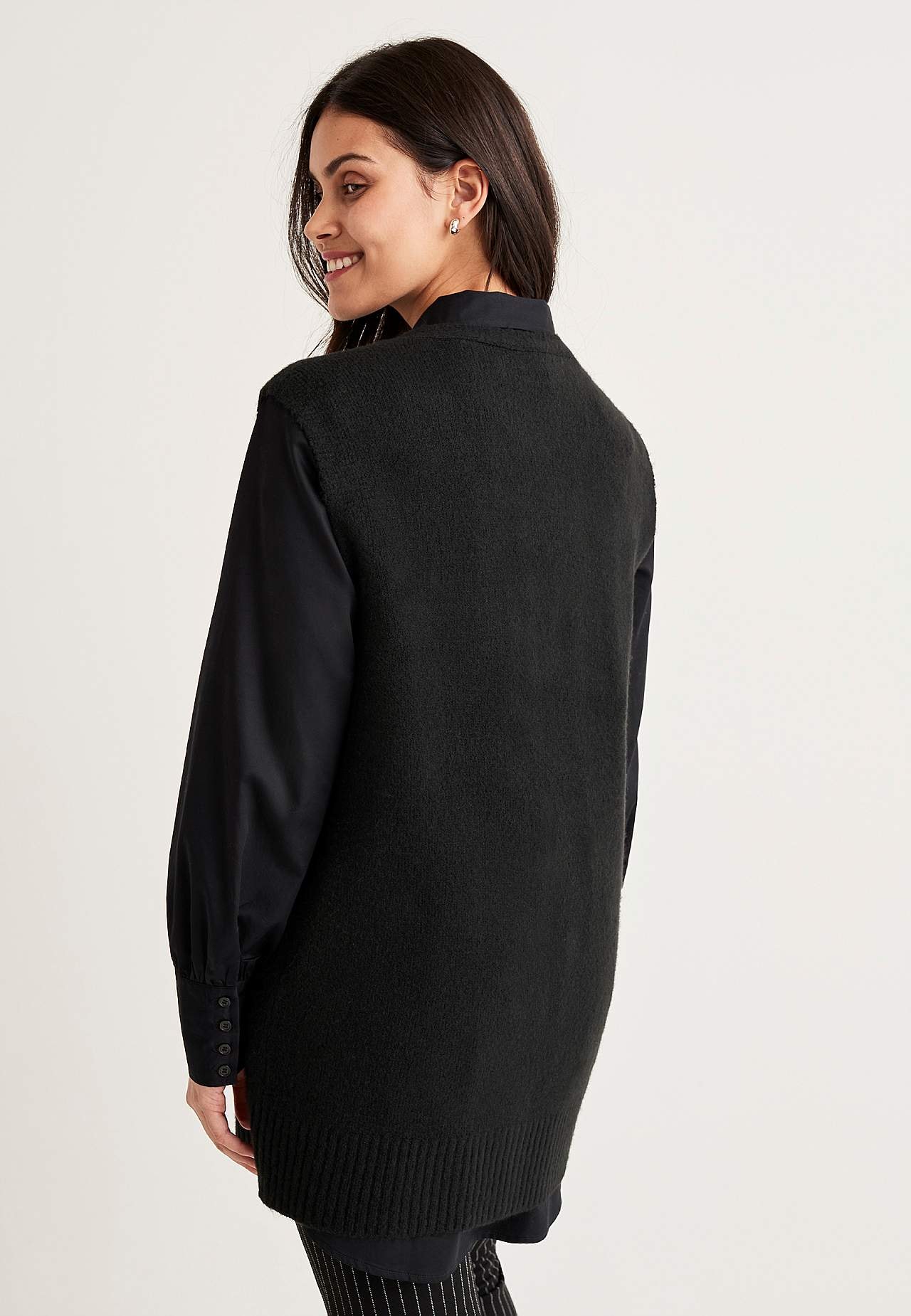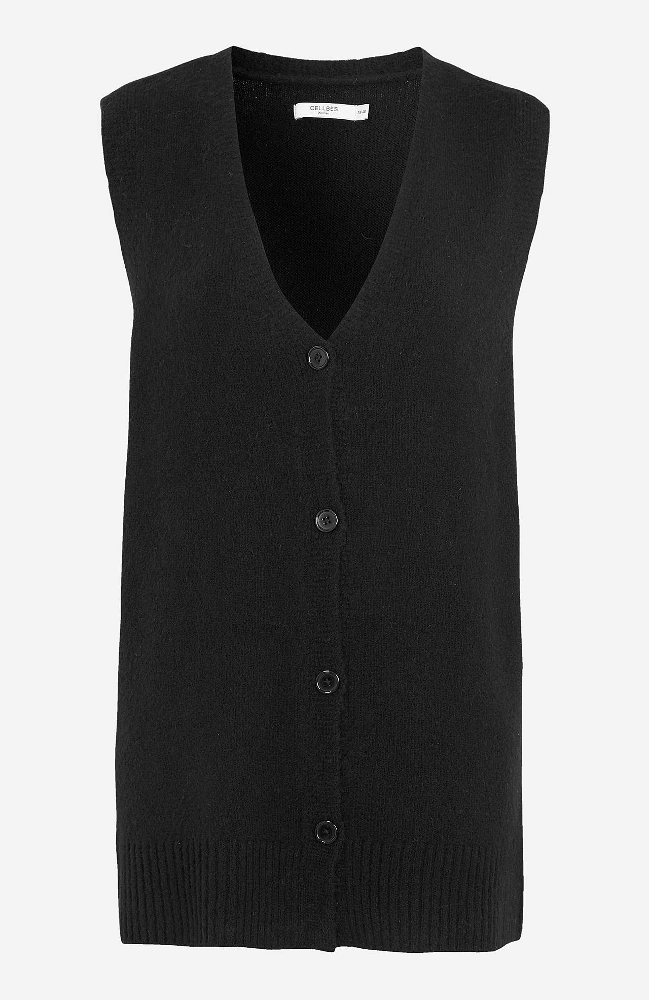 Gara adīta veste ar pogām. Taisna piegriezuma modelis ar rievotu V veida kakla izgriezumu un apakšmalu. Garums no pleca mugurpusē atbilstoši izmēram apmēram 75-82 cm.