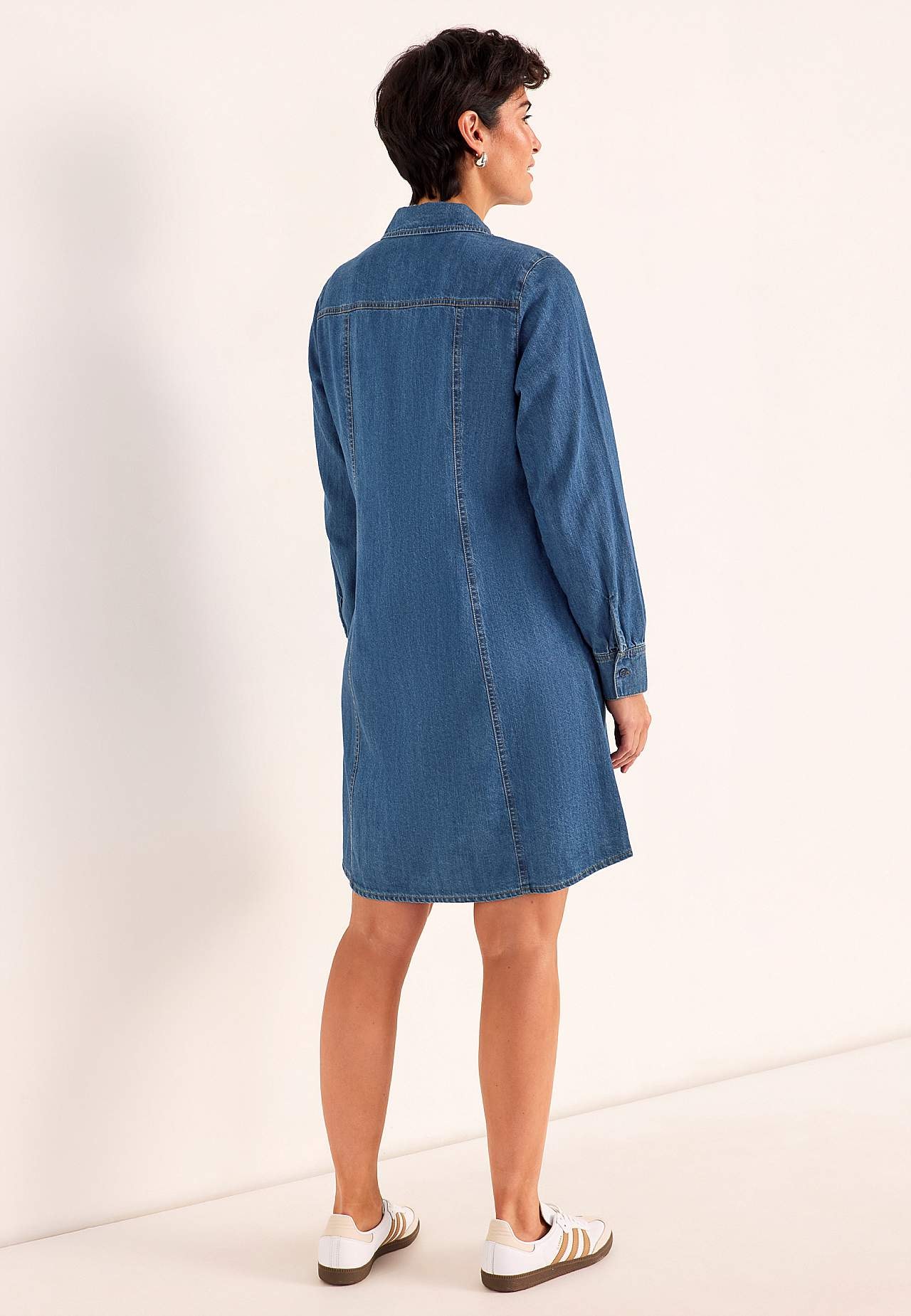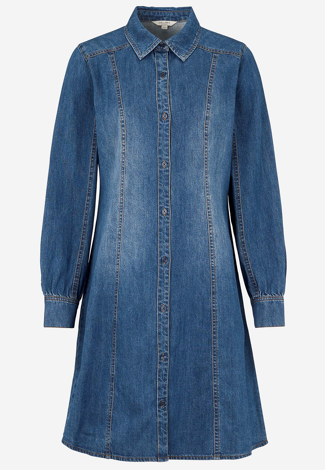 Mīksta, pabieza, padevīga džinsa auduma kleita. Standarta piegriezums. Pogājams modelis ar klasisku apkakli. Garas piedurknes ar aproci un pogu. Vizuāli slaidinošas dekoratīvas vīles priekšpusē un mugurpusē. Atdaļa mugurpusē. Noapaļota apakšmala, nedaudz garāka mugurpusē. Garums no pleca atbilstīgi izmēram aptuveni 96-110 c... Lasīt vairāk