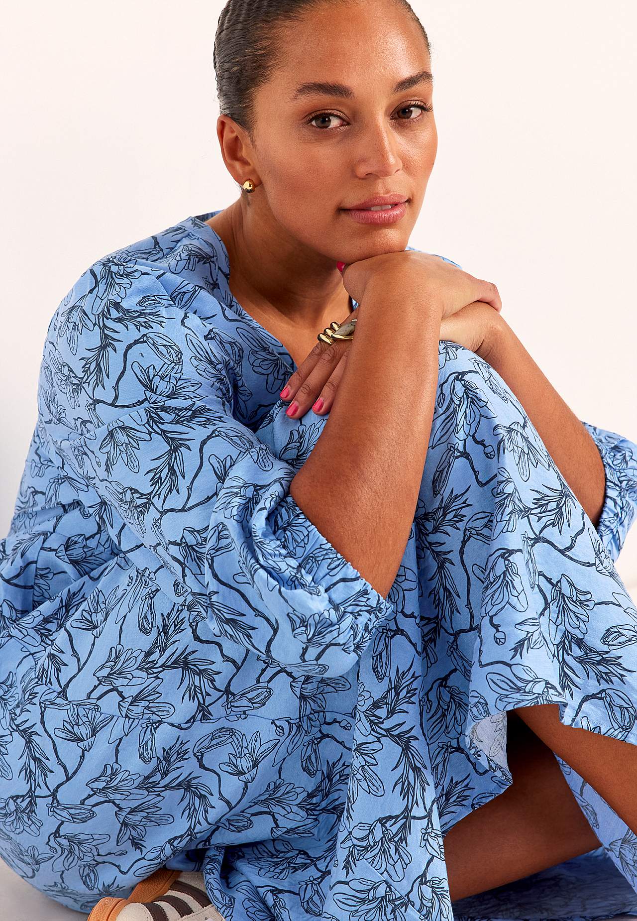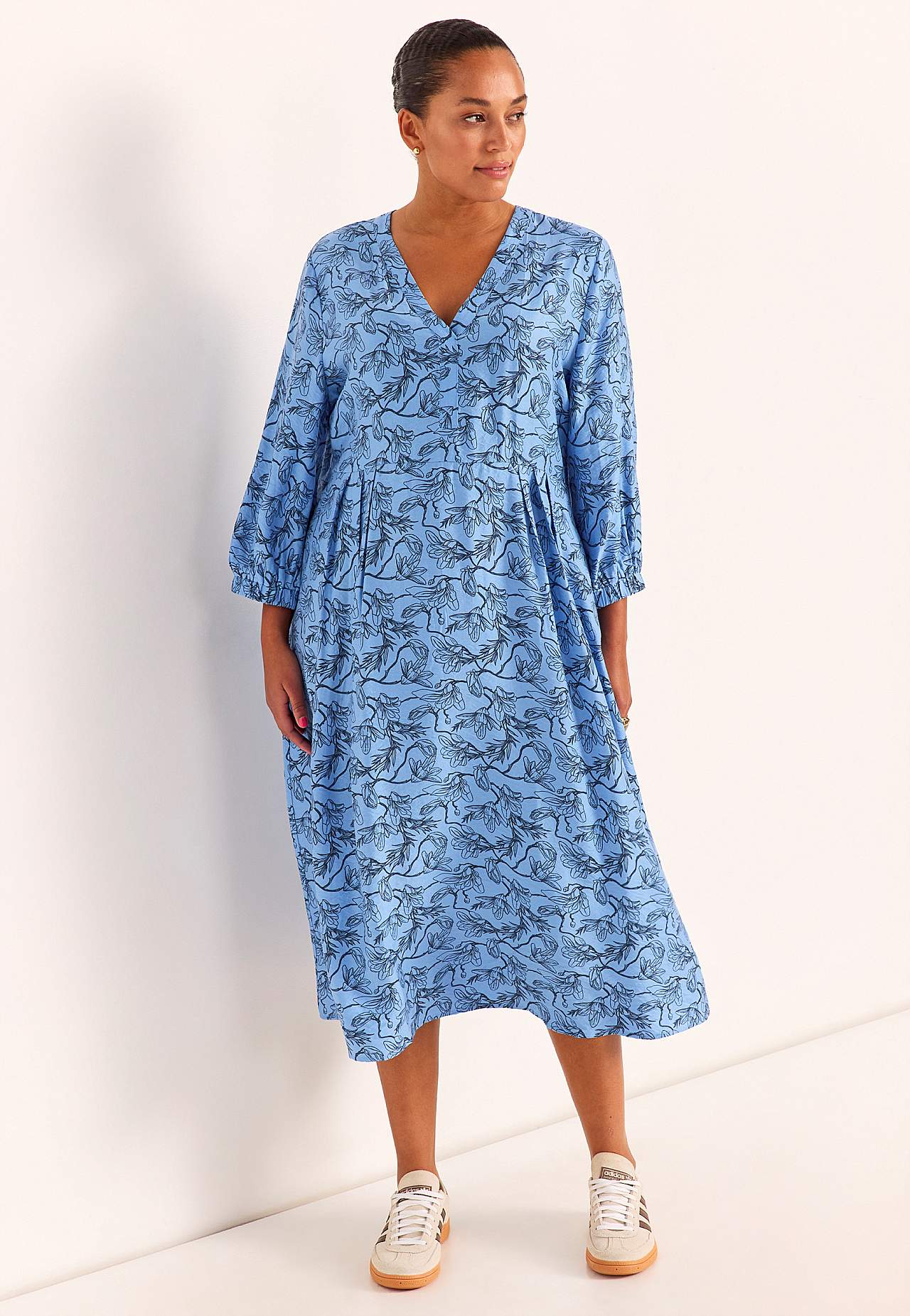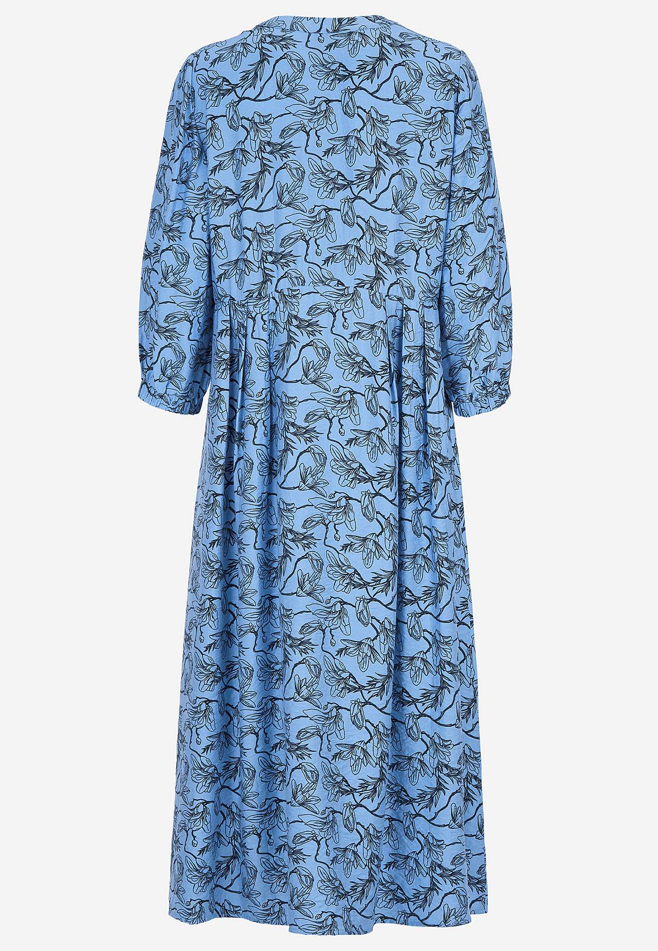 Viskozes kleita ar vieglu tekstūru un nelielu spīdumu. Jauks kritums un atvēsinoša sajūta. Nedaudz pieguļošs piegriezums, akcentēts viduklis un plata apakšdaļa. Muguras garums visiem izmēriem aptuveni 125 cm.