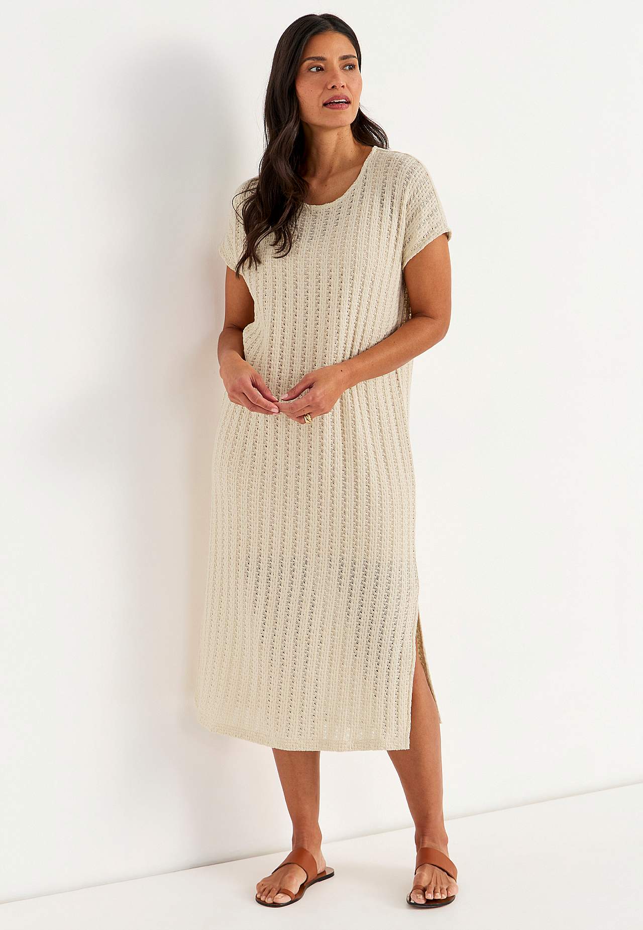 Adīta gaisīgas trikotāžas kleita ar izteiksmīgu caurumiņu rakstu. Mīksts, stingrs kokvilnas maisījums. Garš kaftāna stila modelis bez oderes. Iesakām valkāt virs krekliņa un baltiem džinsiem. Brīvs piegriezums. Apaļš kakla izgriezums. Īsas pagarinātas plecu līnijas piedurknes. Viegli noapaļota apakšmala ar šķēlumu sānos. Ga... Lasīt vairāk