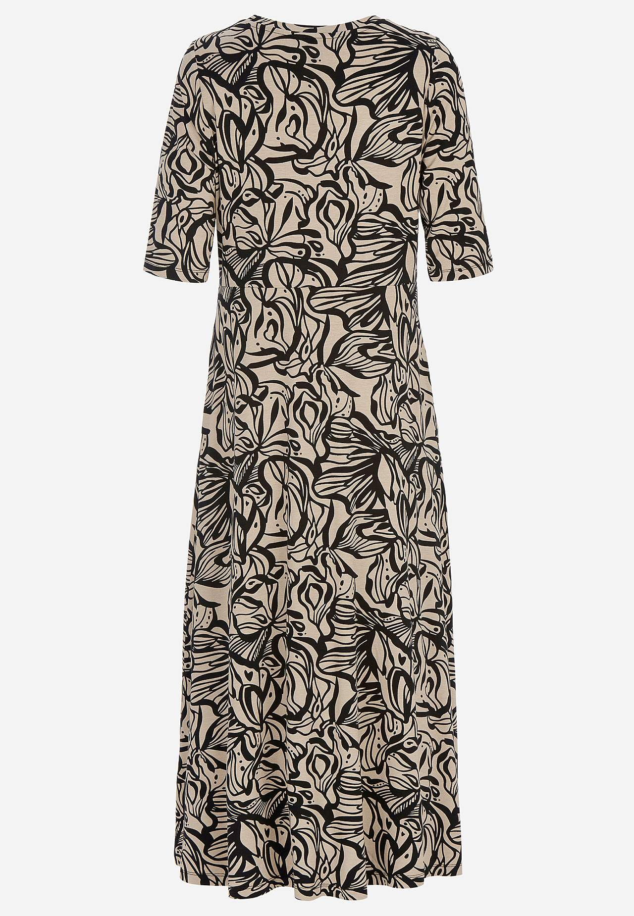 Kleita no krītošas, brīnišķīgi mīkstas viskozes trikotāžas. Materiālam smags, elegants kritums. Standarta piegriezums. Brīvāka apjoma piegriezums apakšdaļā. V veida kakla izgriezums. Šauras, 3/4 garuma piedurknes. Jostas vietā griezuma līnija. Kabatas sānos. Muguras garums visiem izmēriem aptuveni 125 cm.