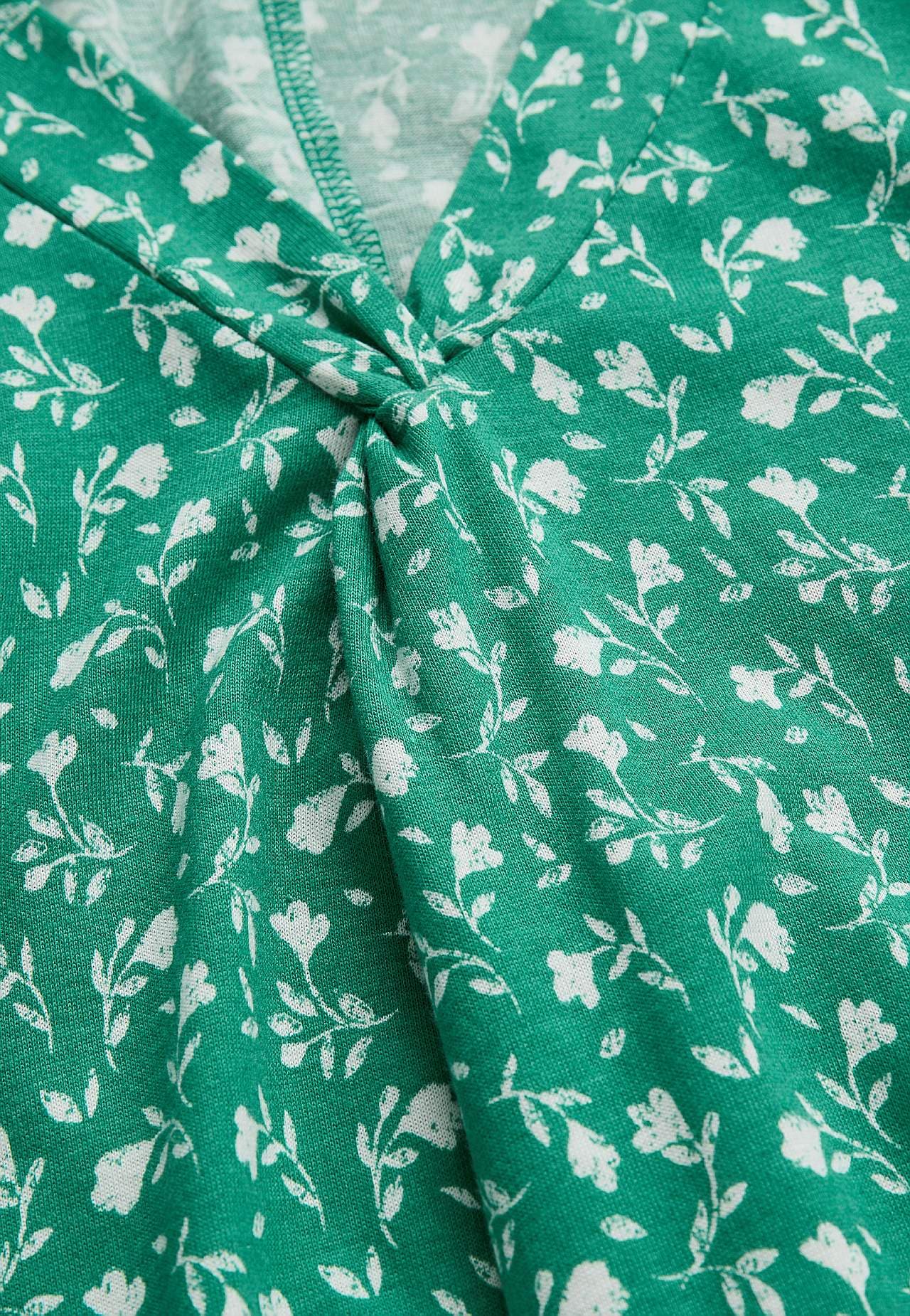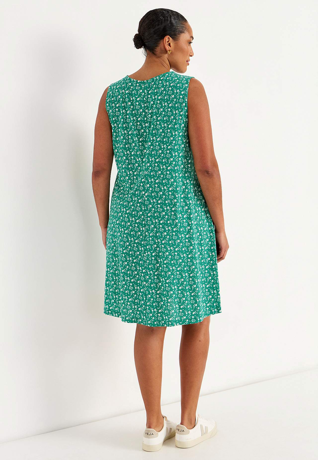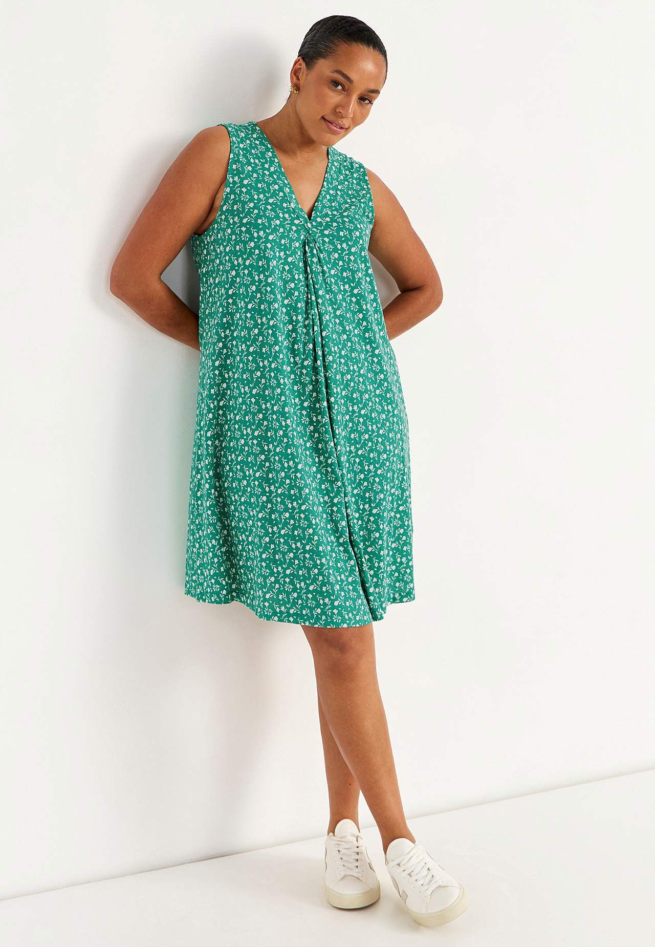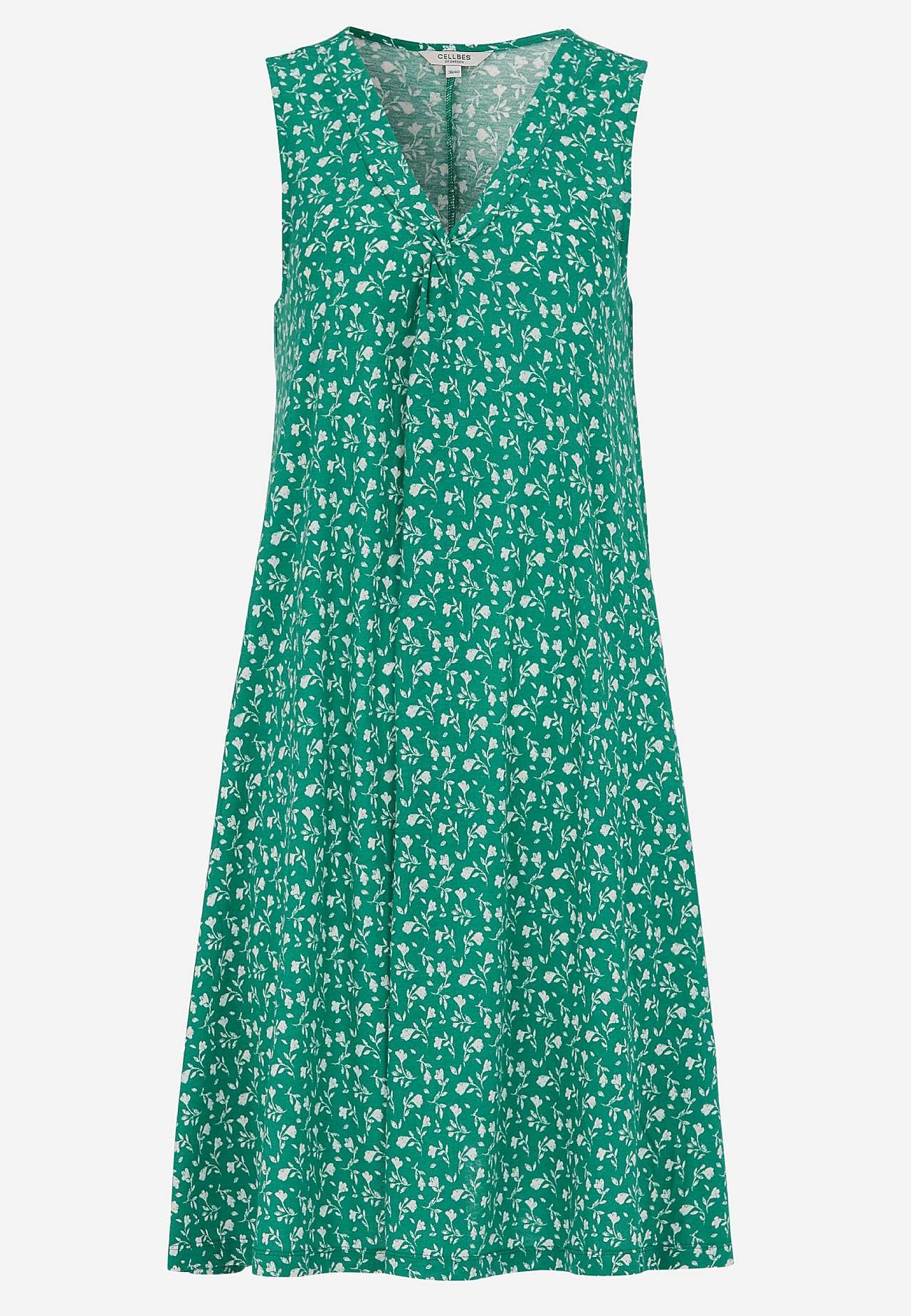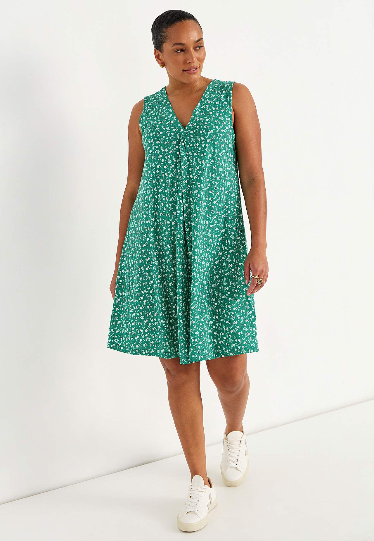 Trikotāžas kleita bez piedurknēm. Gaisīgs modelis no burvīgi mīksta kokvilnas un viskozes maisījuma. Plats viegla A silueta piegriezums. Garums no pleca mugurpusē atbilstīgi izmēram apmēram 95-106 cm.