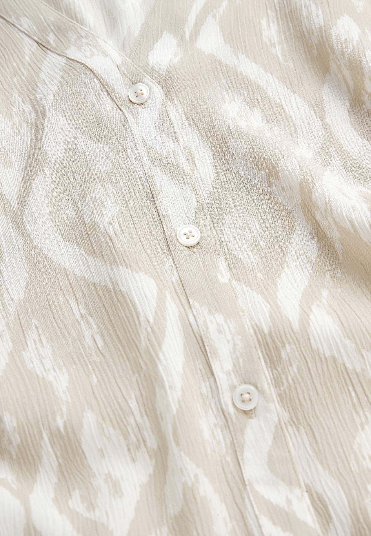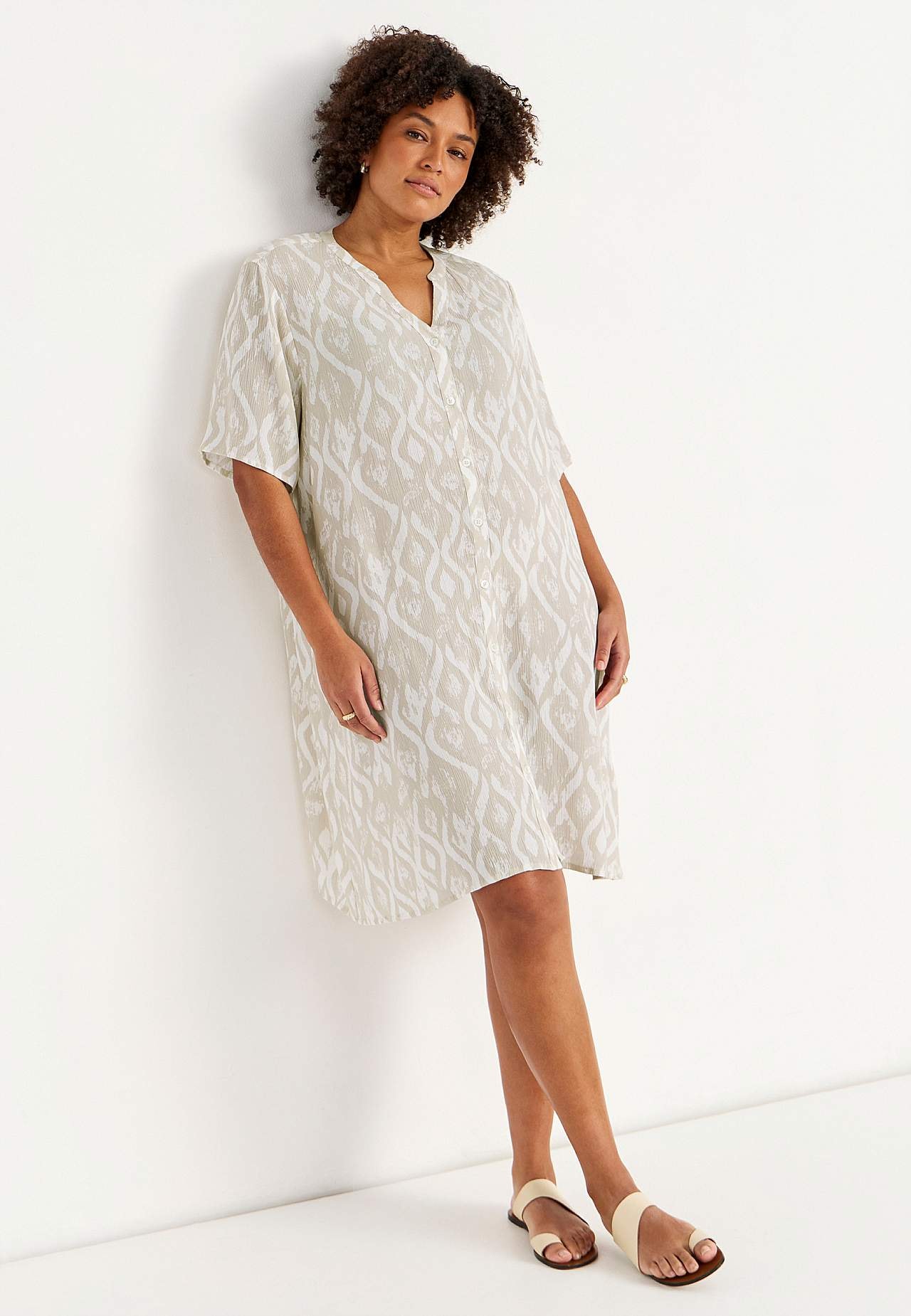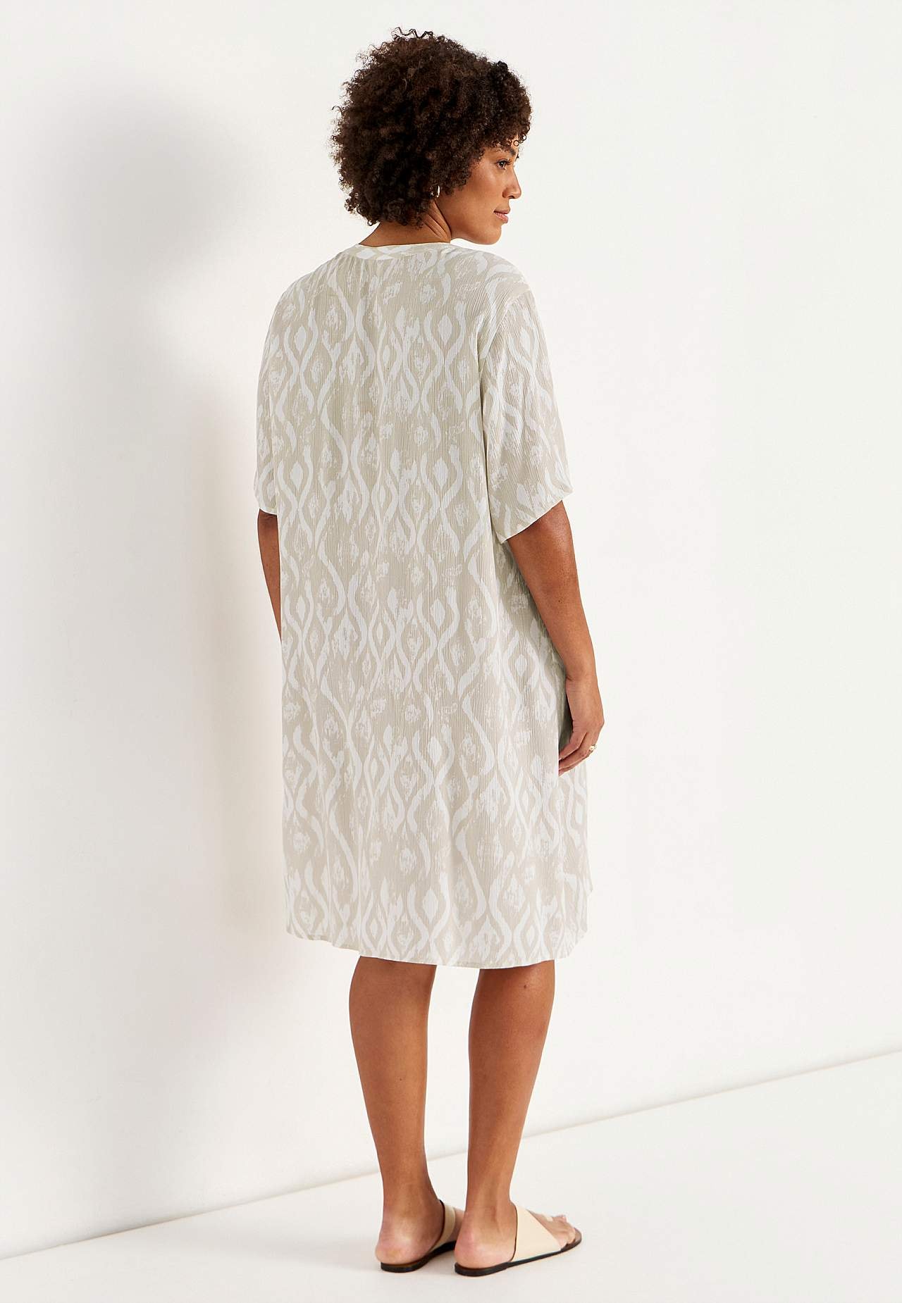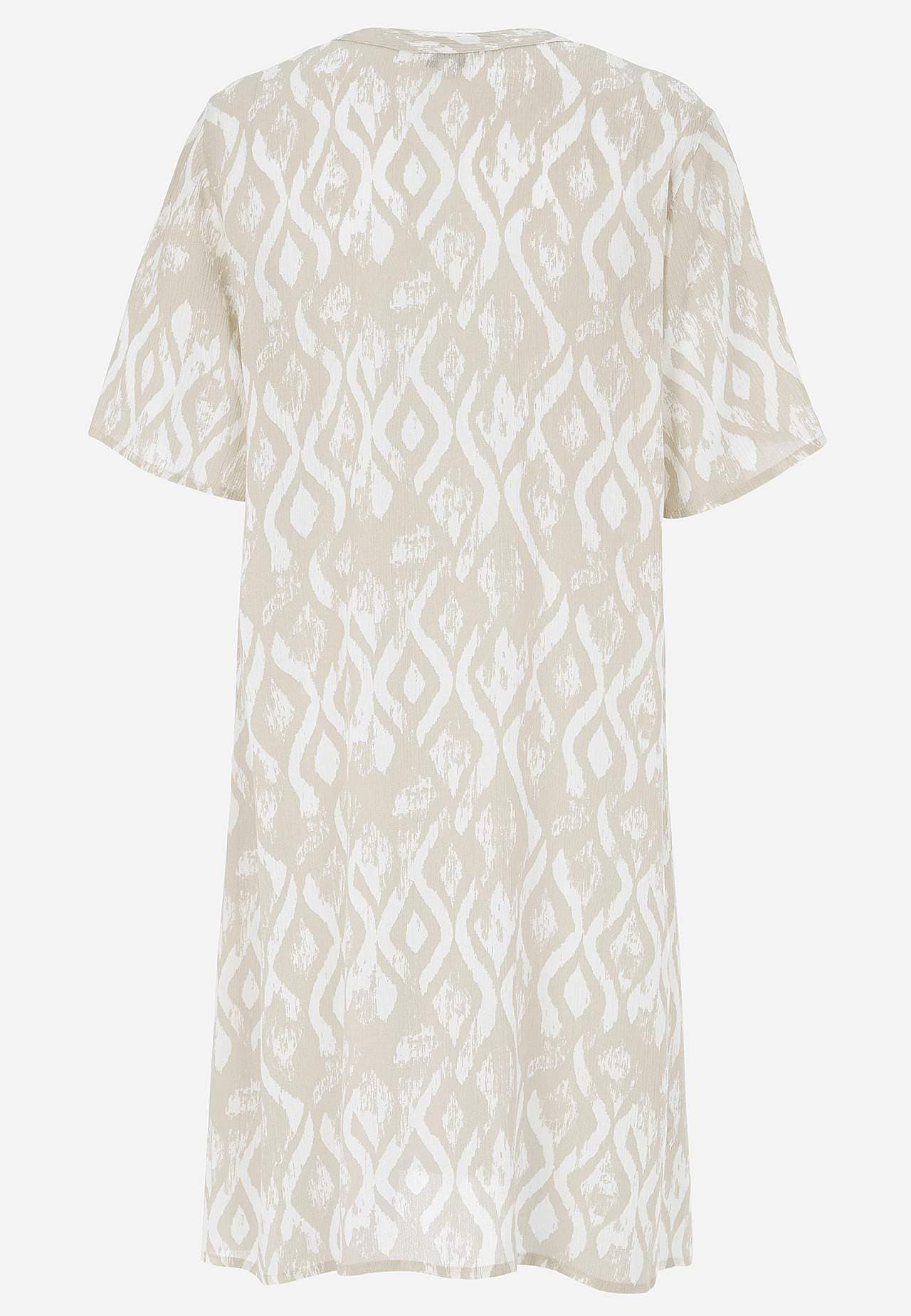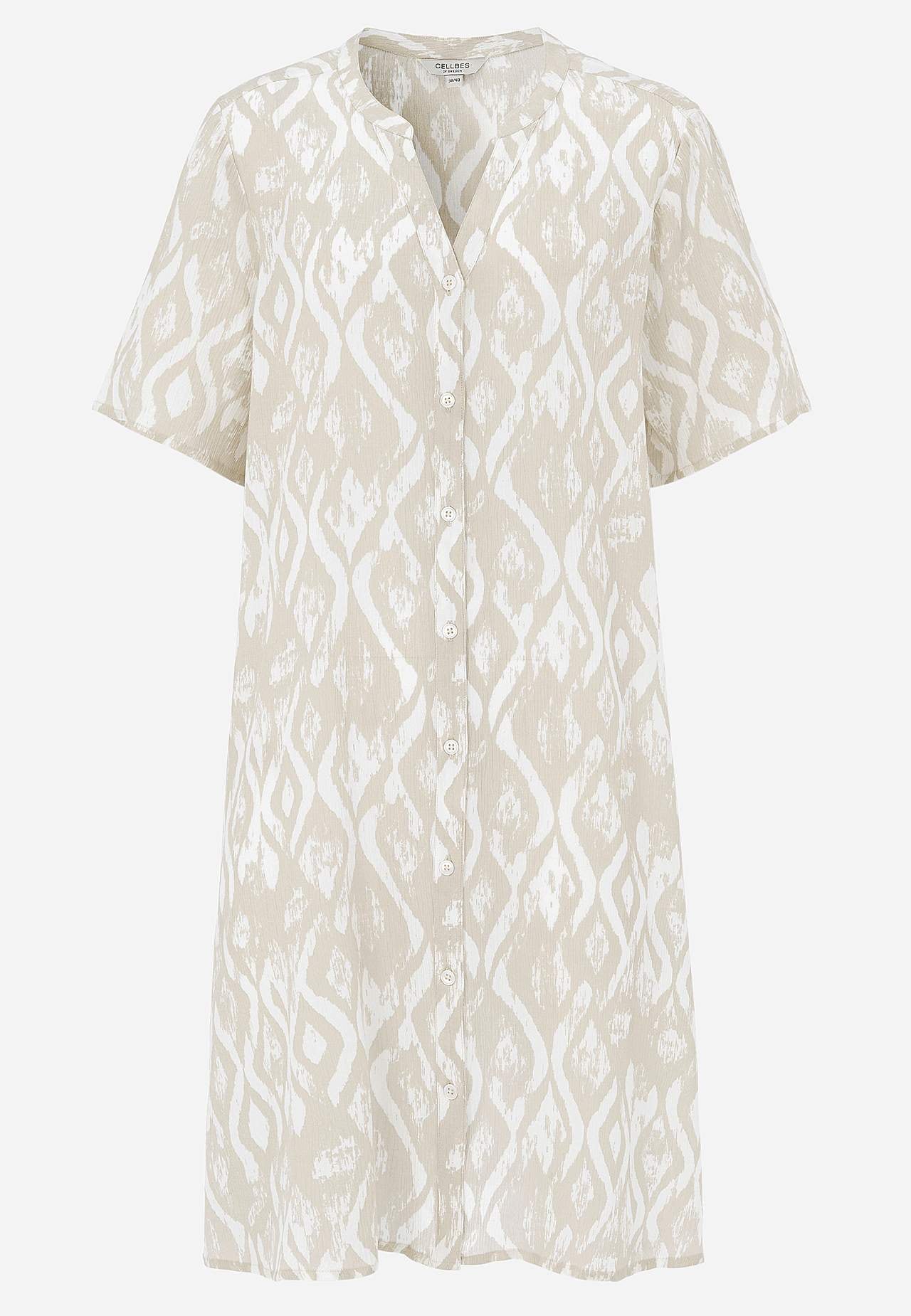 Gaisīgs, atvēsinošs materiāls ar matētu virsmu un smalku tekstūru. Pabrīvs A silueta piegriezums. Pogu aizdare priekšpusē. Īsas piedurknes. Garums mugurpusē atbilstīgi izmēram aptuveni 97-105 cm.
