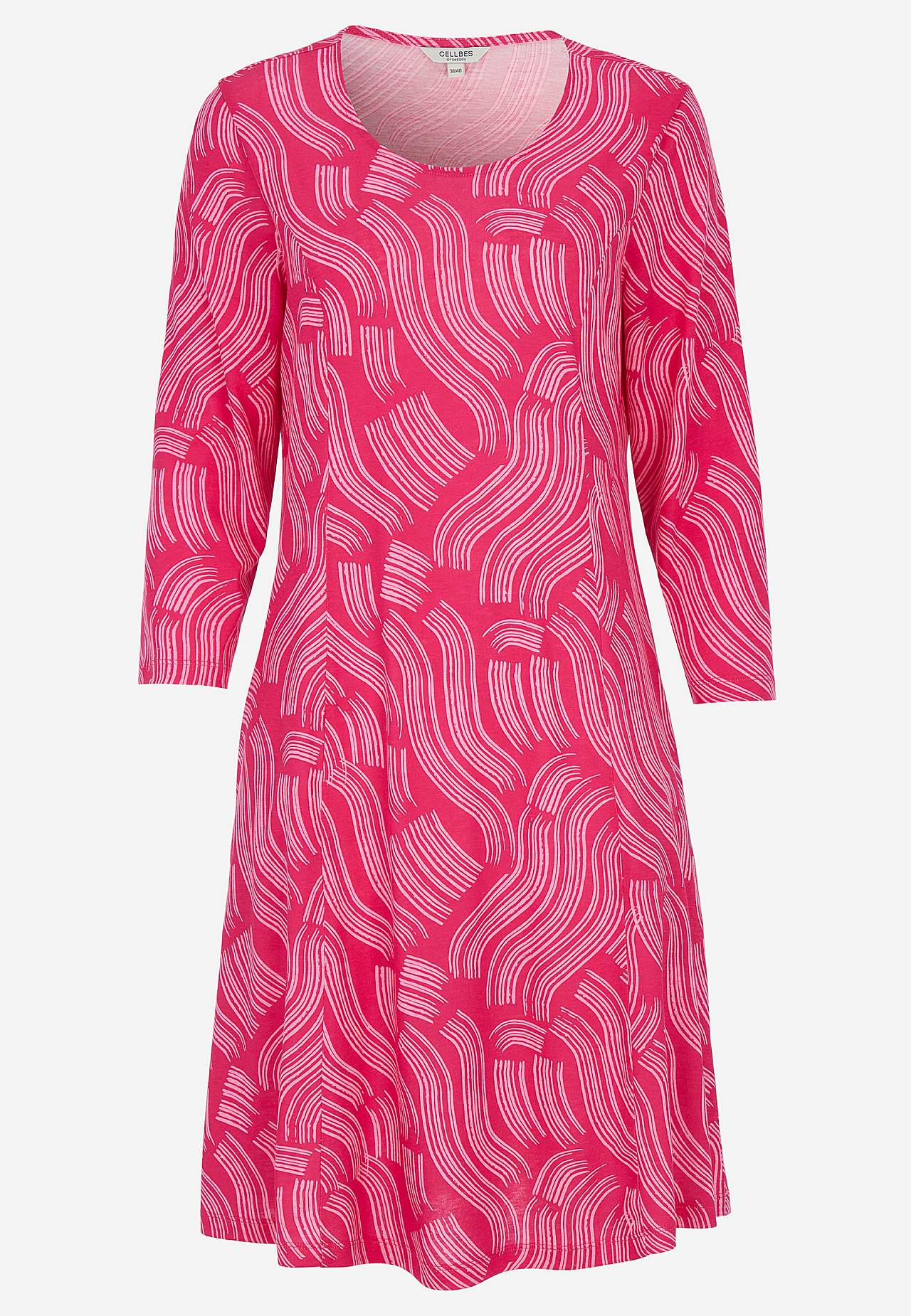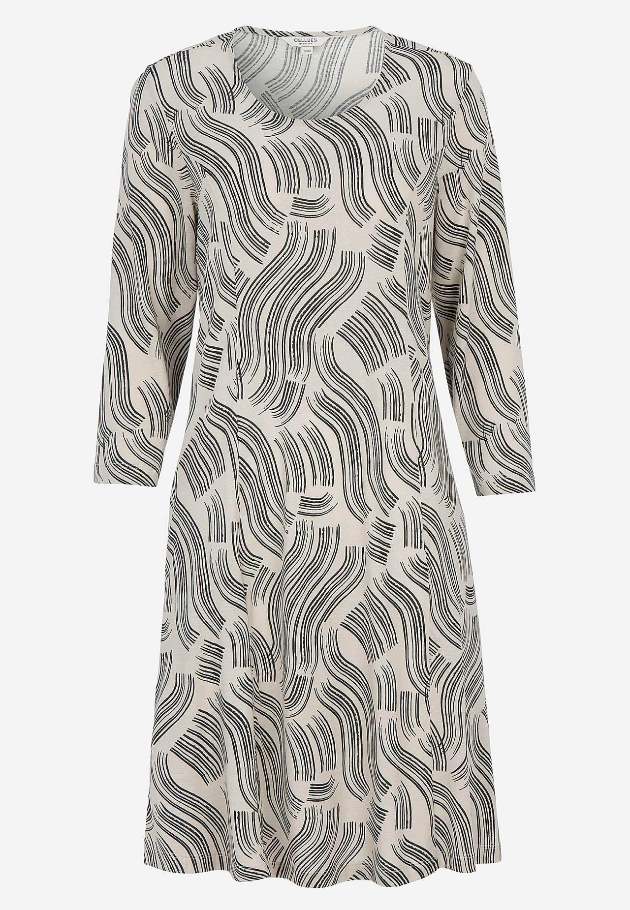 Mīksta, ērta kokvilnas un viskozes maisījuma kleita. Pieguļošs piegriezums krūšu daļā. Paplatināts modelis ar figūru akcentējošām vīlēm gan priekšpusē, gan mugurpusē. Apaļš kakla izgriezums. Ērtas kabatas sānos. Taisnas 3/4 garuma piedurknes. Garums no pleca atbilstīgi izmēram aptuveni 96-108 cm.