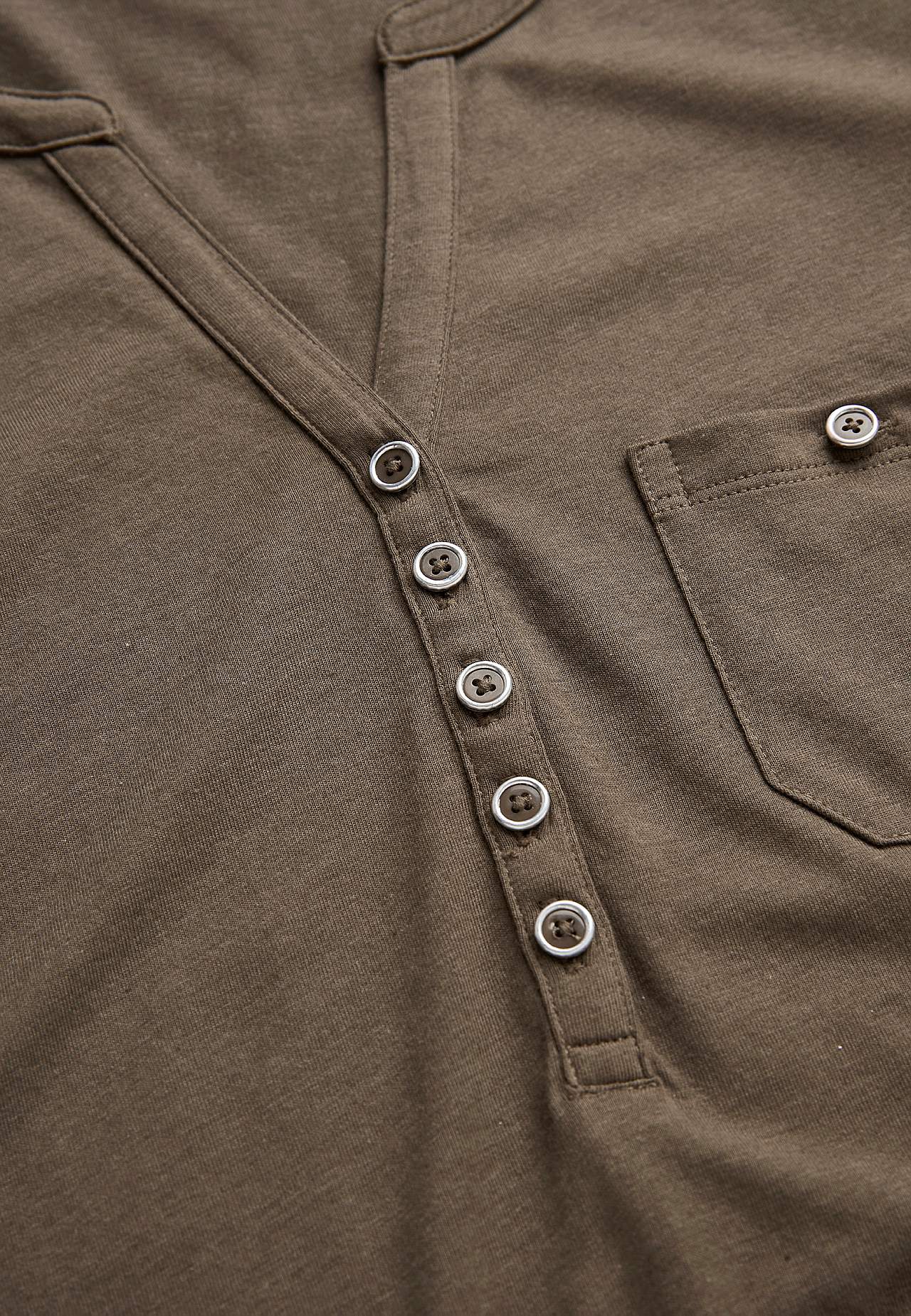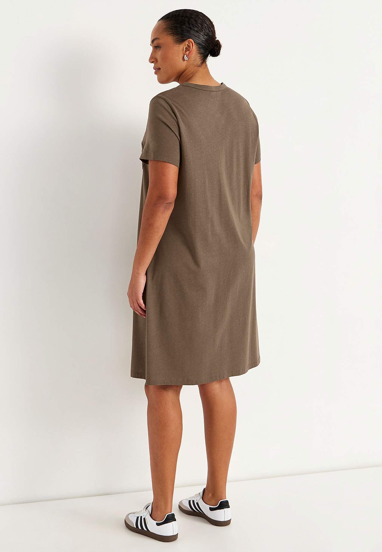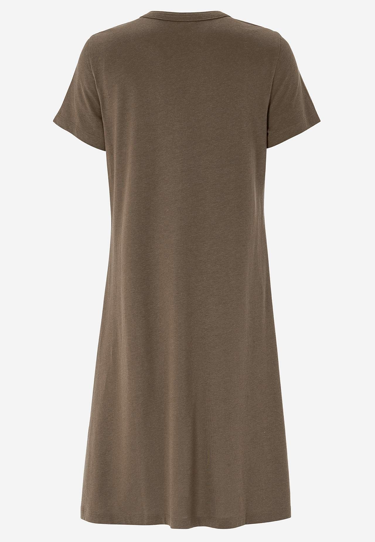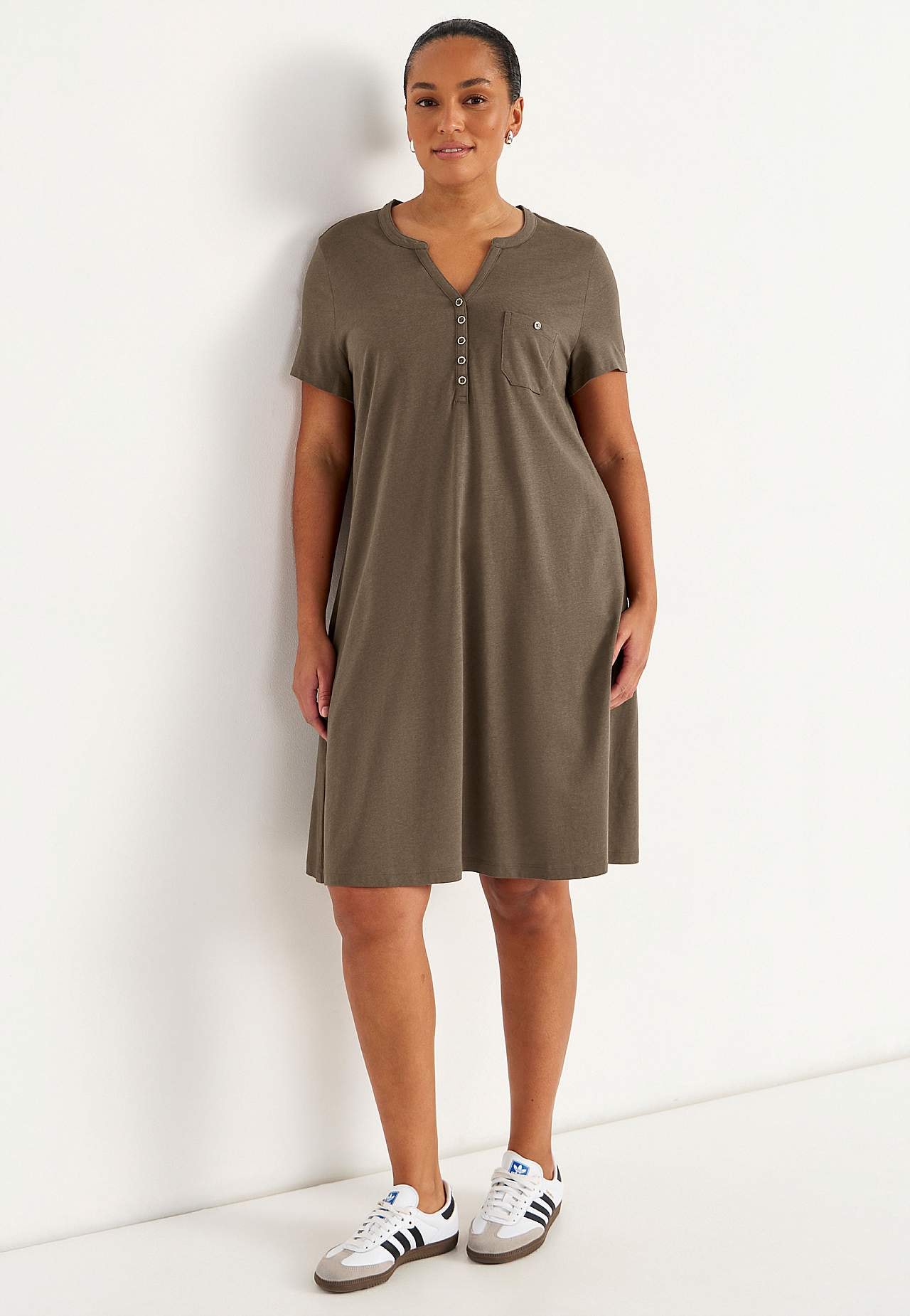 A silueta kleita ar īsām piedurknēm. Lieliska mīkstas organiskās kokvilnas un modāla trikotāža. Apaļš kakla izgriezums ar V veida šķēlumu un pogām. Neliela krūšu kabata ar pogu. Krūšu iešuves. Nedaudz noapaļota apakšmala. Garums no pleca atbilstīgi izmēram apmēram 97-114 cm.
