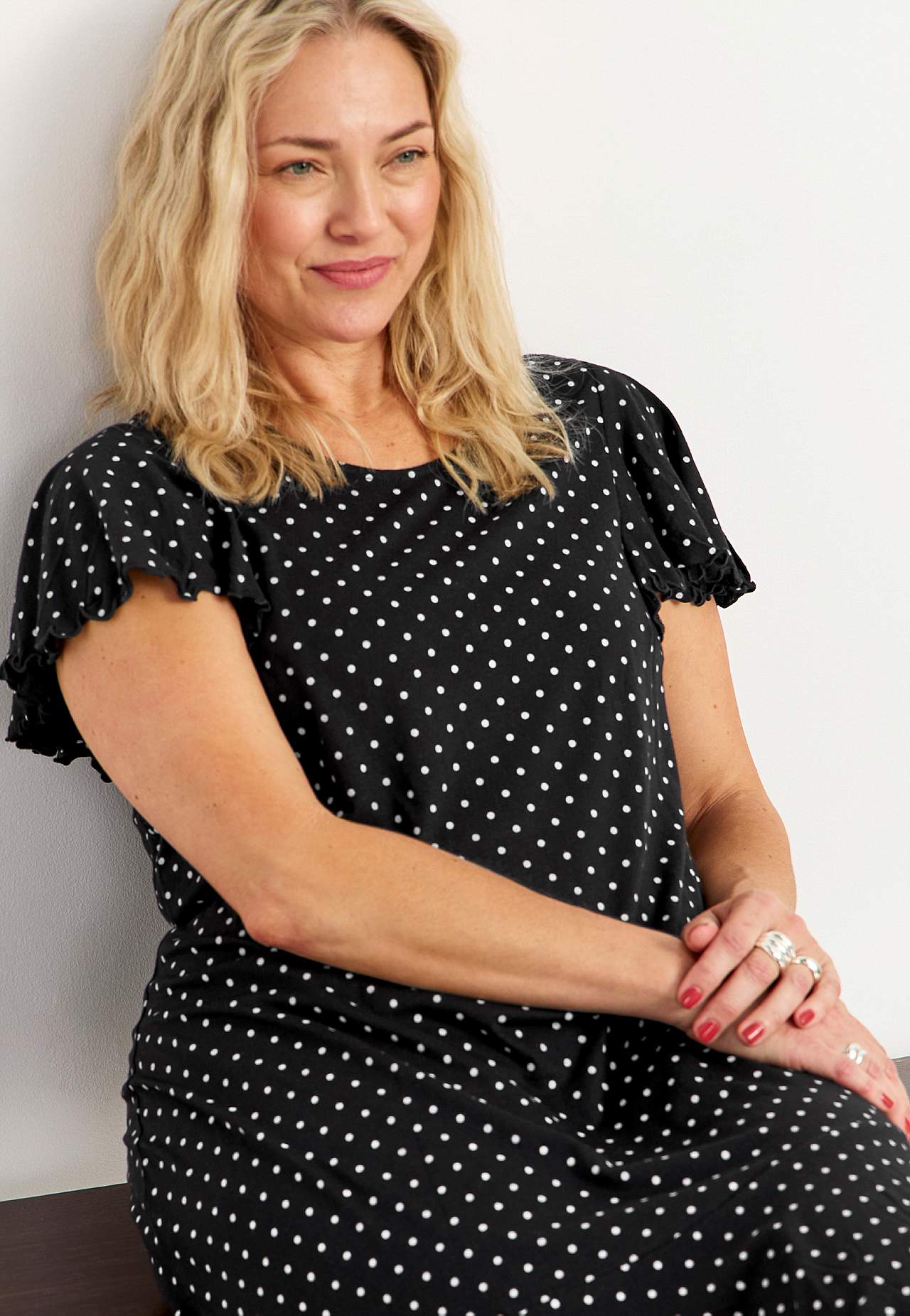 Kleita ar asimetrisku vīli un dubultu volānu apakšdaļā. Mīksta kokvilnas un viskozes maisījuma trikotāža. Pieguļošs piegriezums ar paplatinātu svārku daļu. Apaļš kakla izgriezums. Īsas tauriņveida piedurknes ar viļņotu overloka apdari galā. Krūšu iešuves. Volāni ar viļņotu overloka apdari apakšdaļā. Garums mugurpusē atbilst... Lasīt vairāk