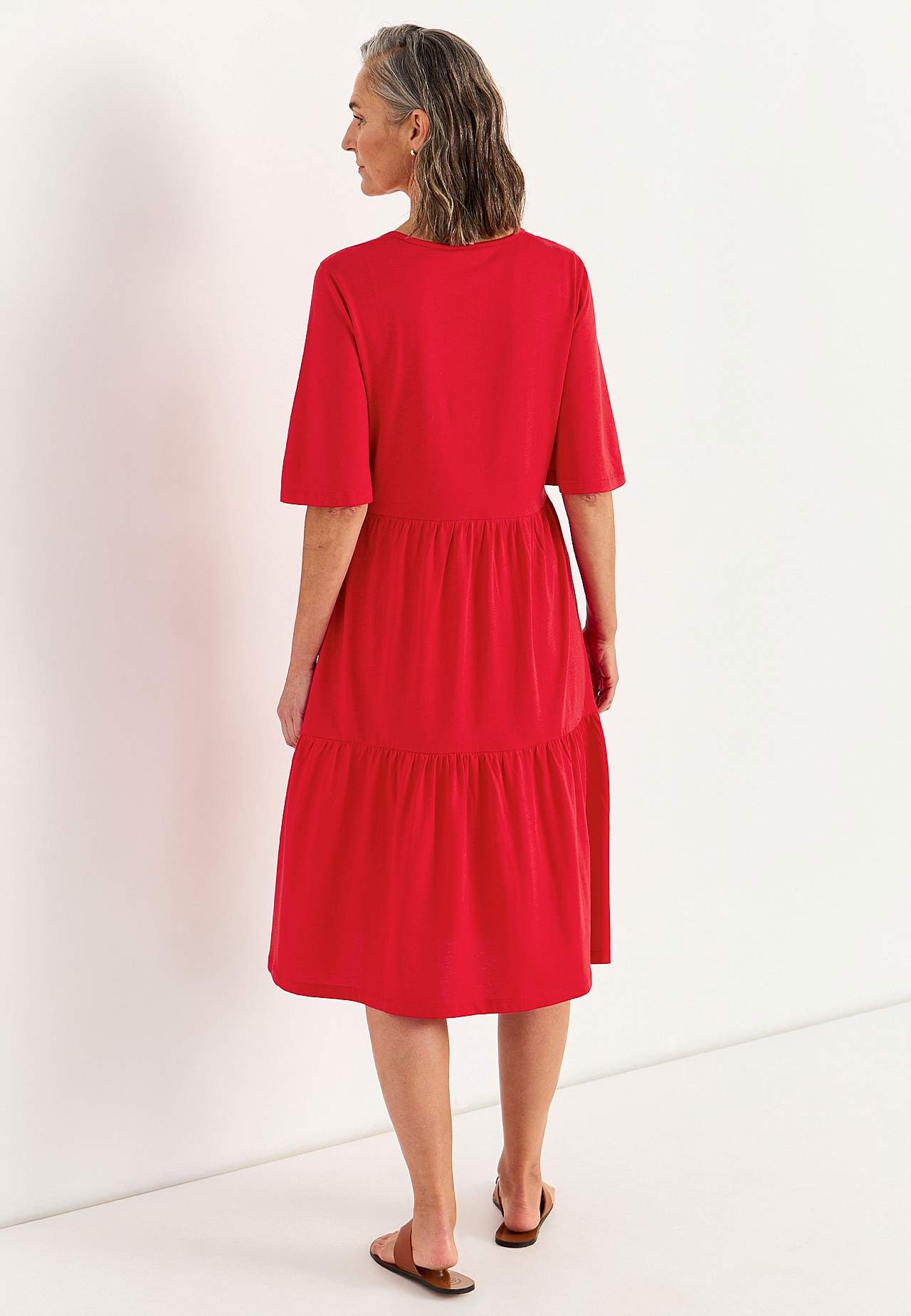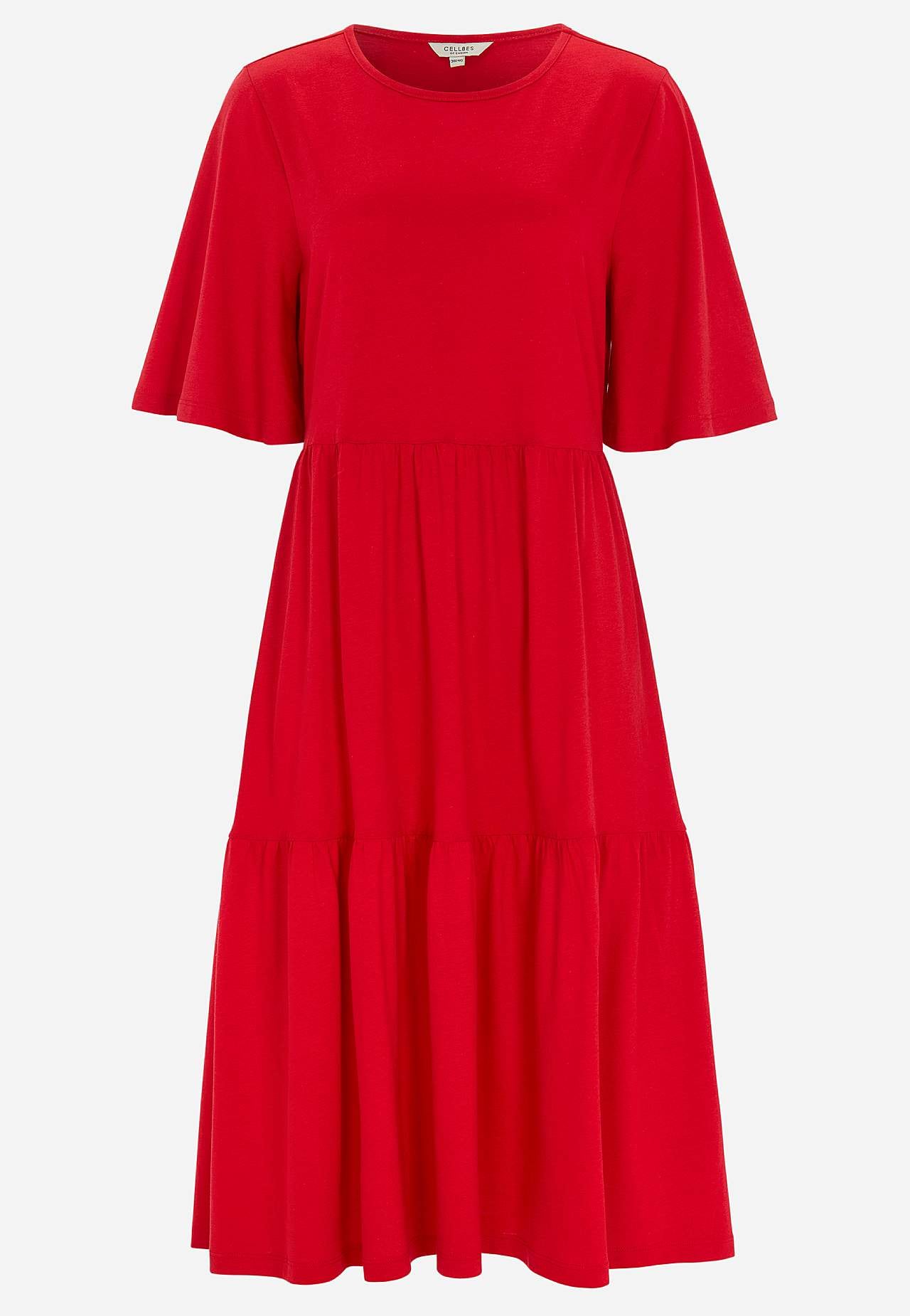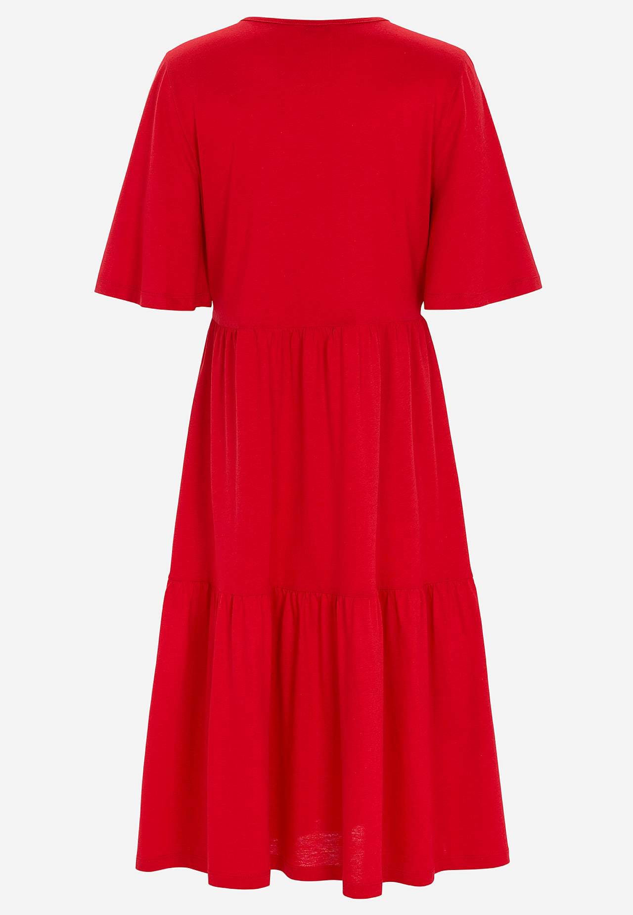 Brīvs A silueta piegriezums. Apaļš kakla izgriezums. Griezuma līnija zem krūtīm. Svārku daļa ar volāniem. Nedaudz noapaļota apakšmala. Garums mugurpusē aptuveni 108 cm visiem izmēriem.