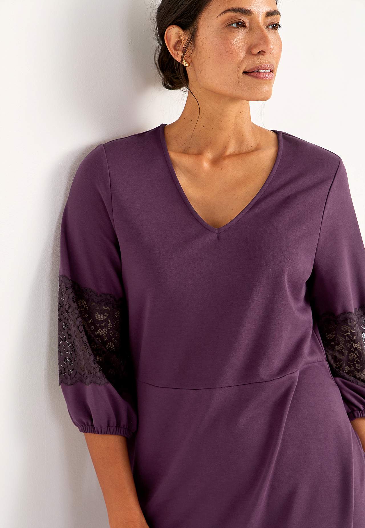 Mīksta padevīgas viskozes trikotāžas kleita. Brīvs piegriezums, paplatināta apakšdaļa. Griezuma līnija jostasvietā. V veida kakla izgriezums. 3/4 garuma piedurknes ar mežģīņu detaļām un gumiju galā. Nedaudz noapaļota apakšmala. Muguras garums apm. 98 cm visiem izmēriem.
