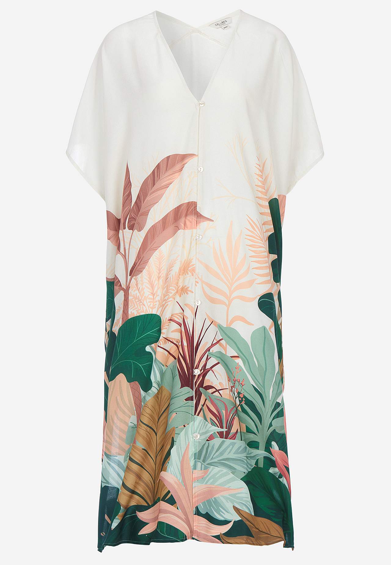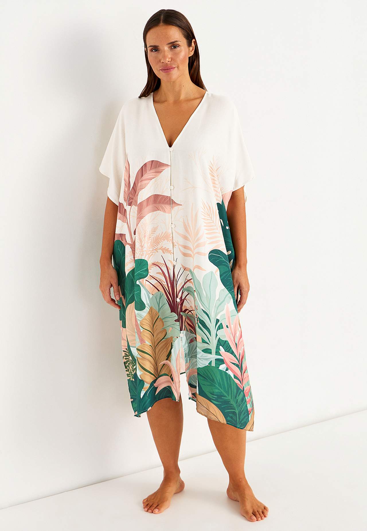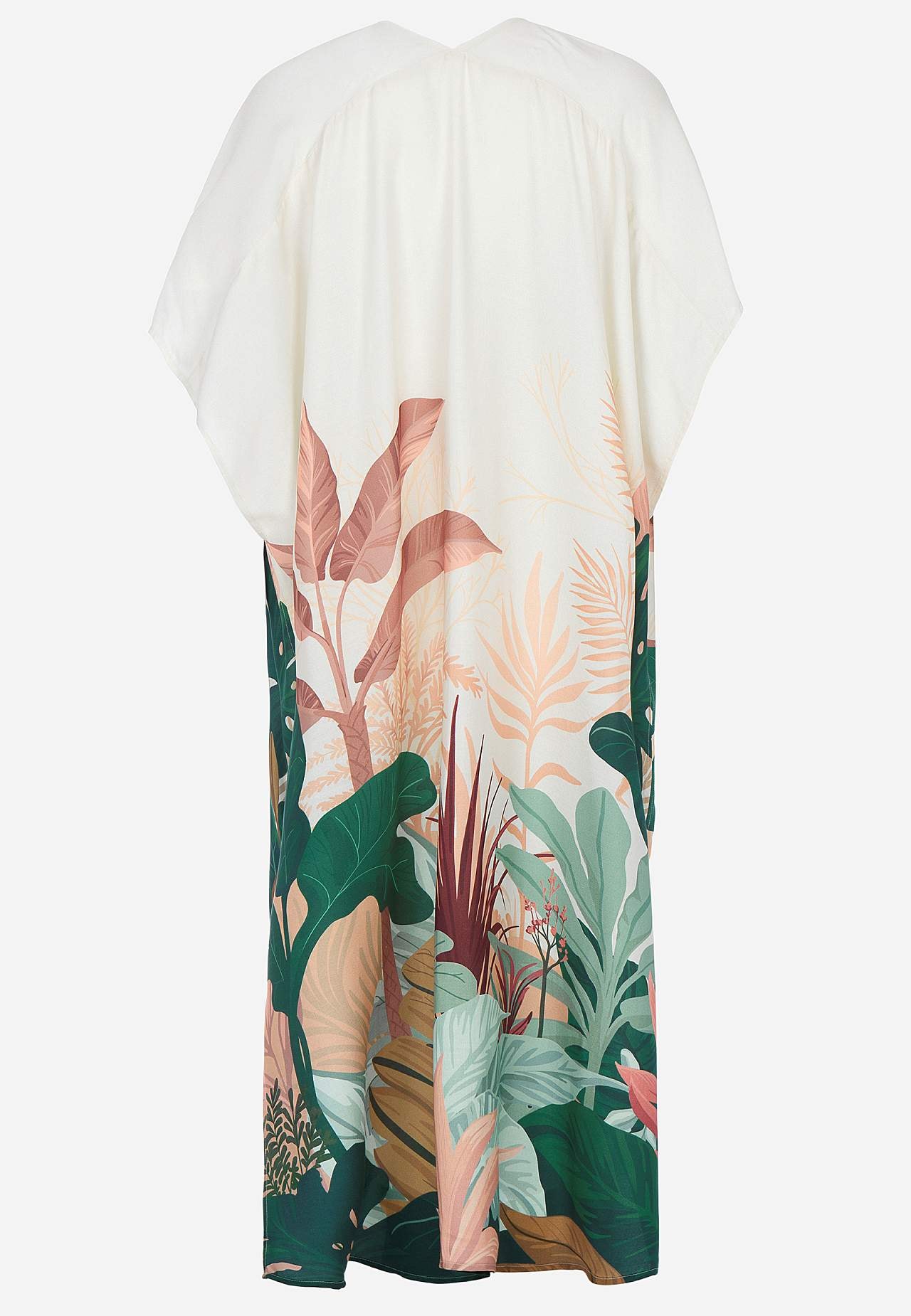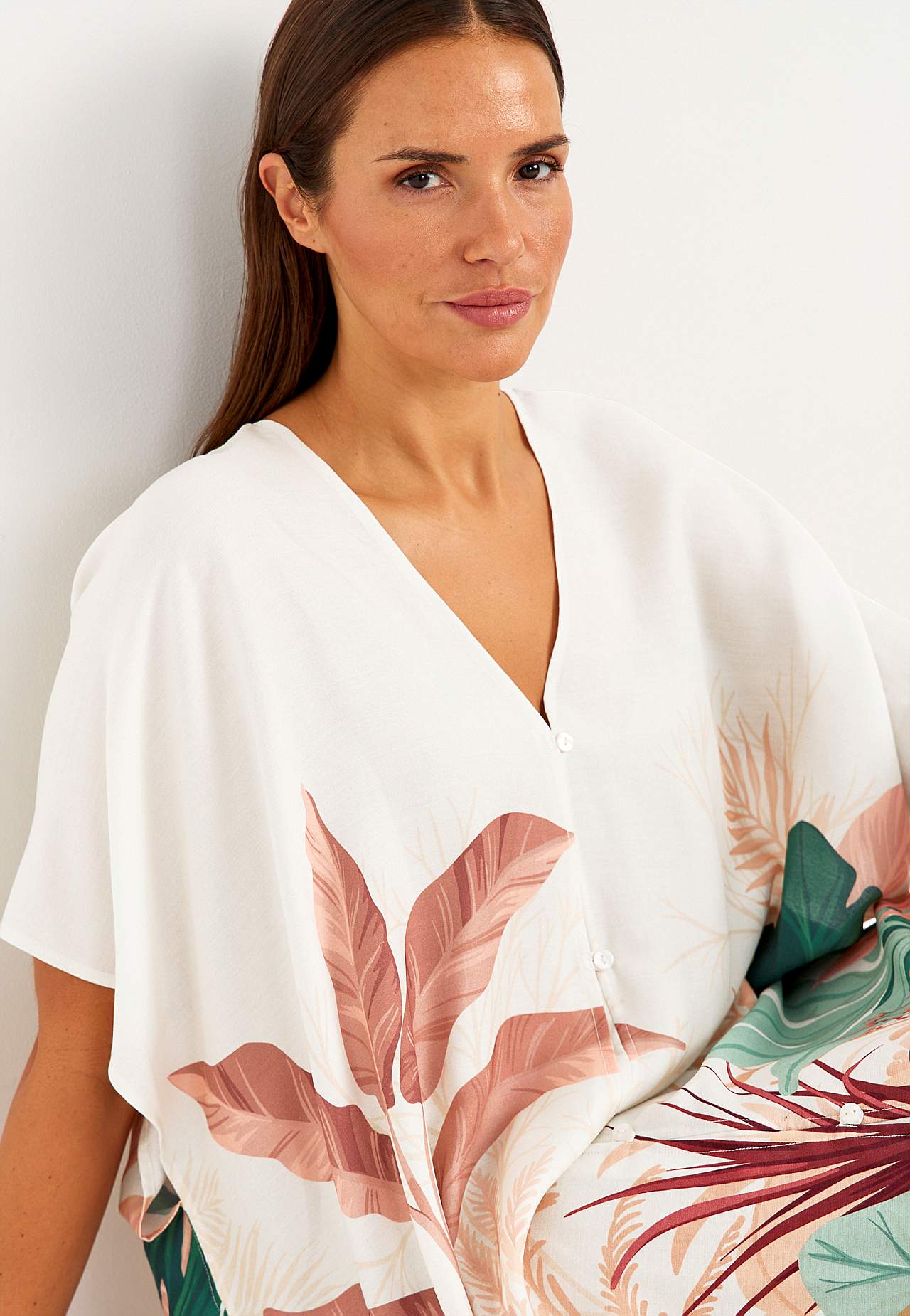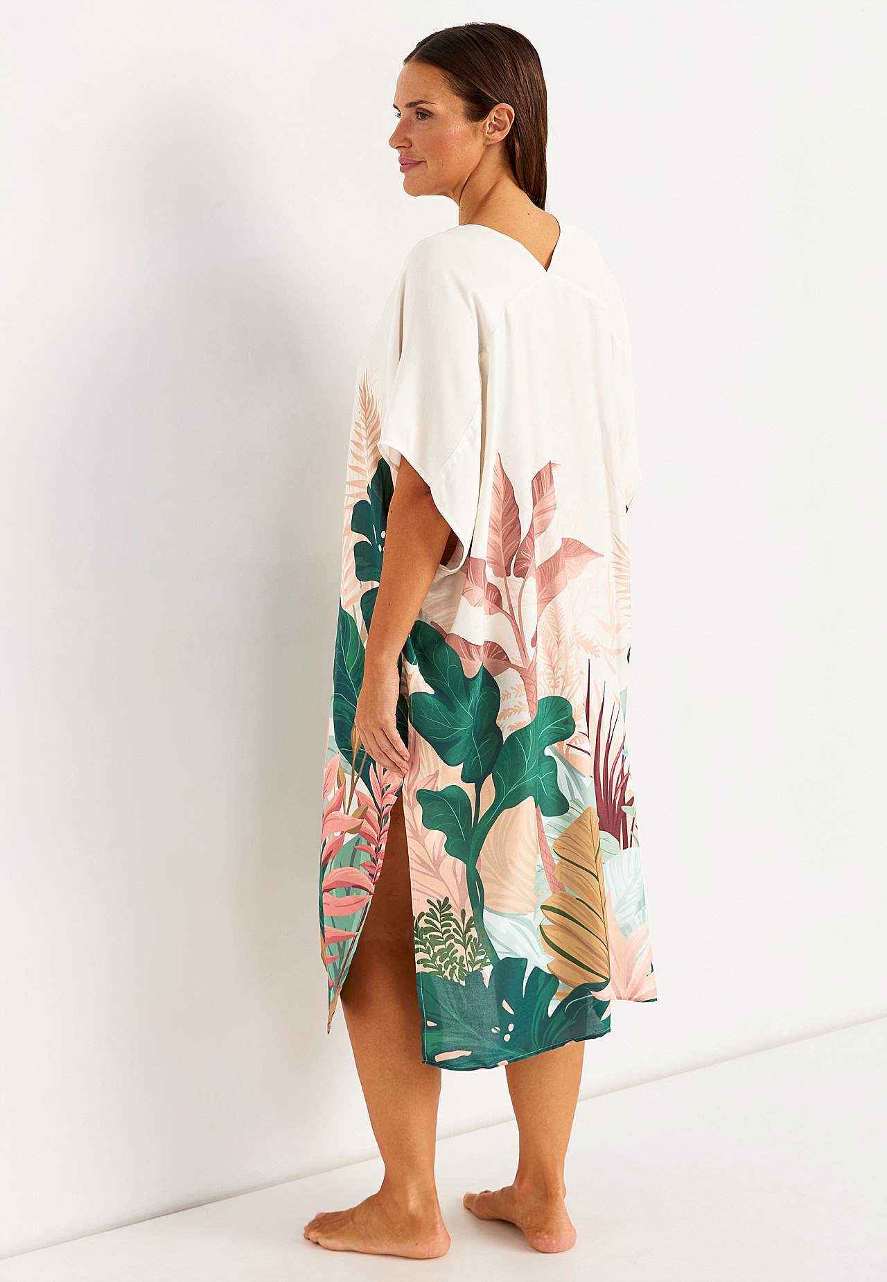 Patīkami gaisīgs, mīksts kaftāns. Brīva piegriezuma modelis ar skaistu kritumu. Šķēlumi sānos. Garums no pleciem visiem izmēriem aptuveni 115 cm.