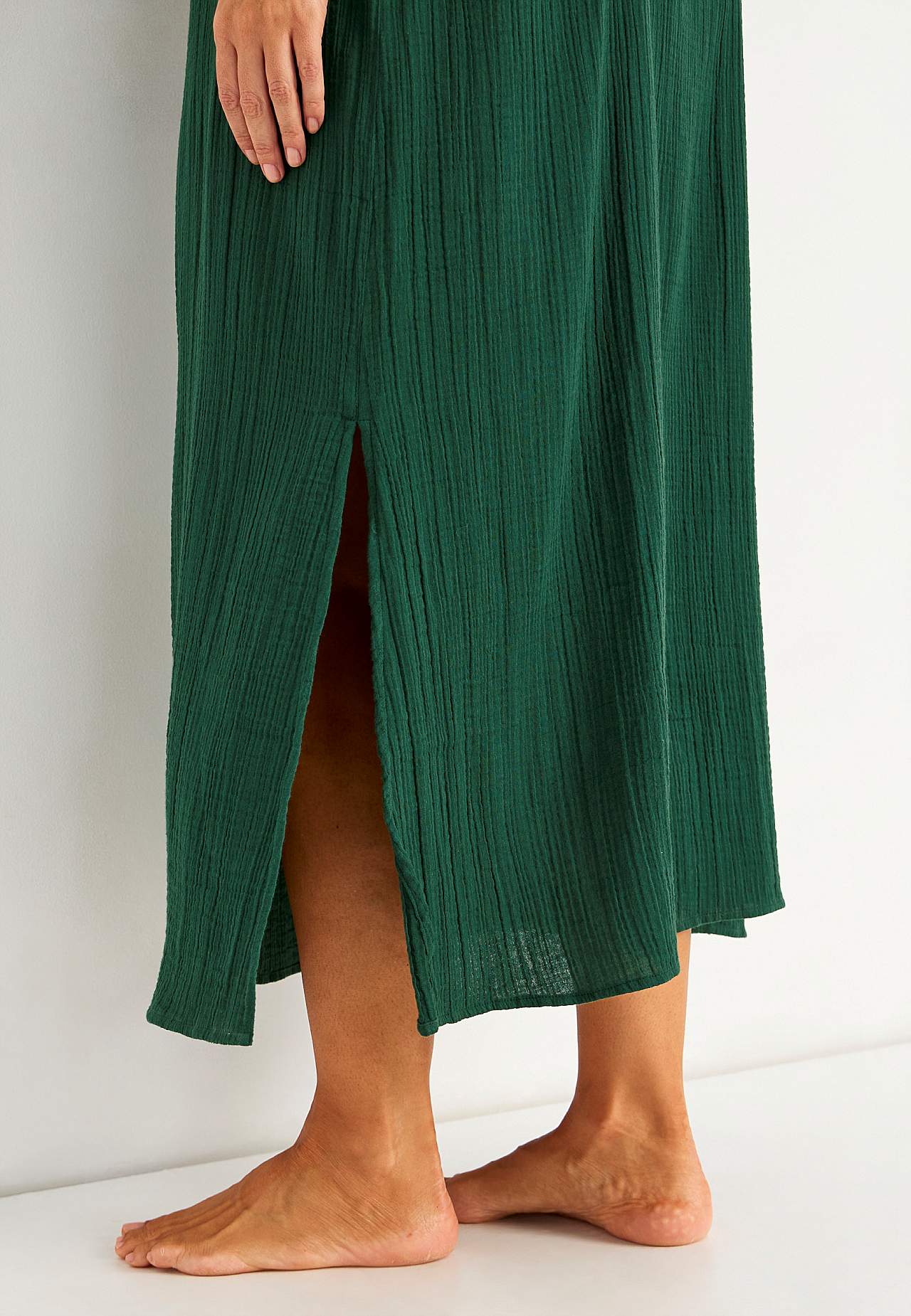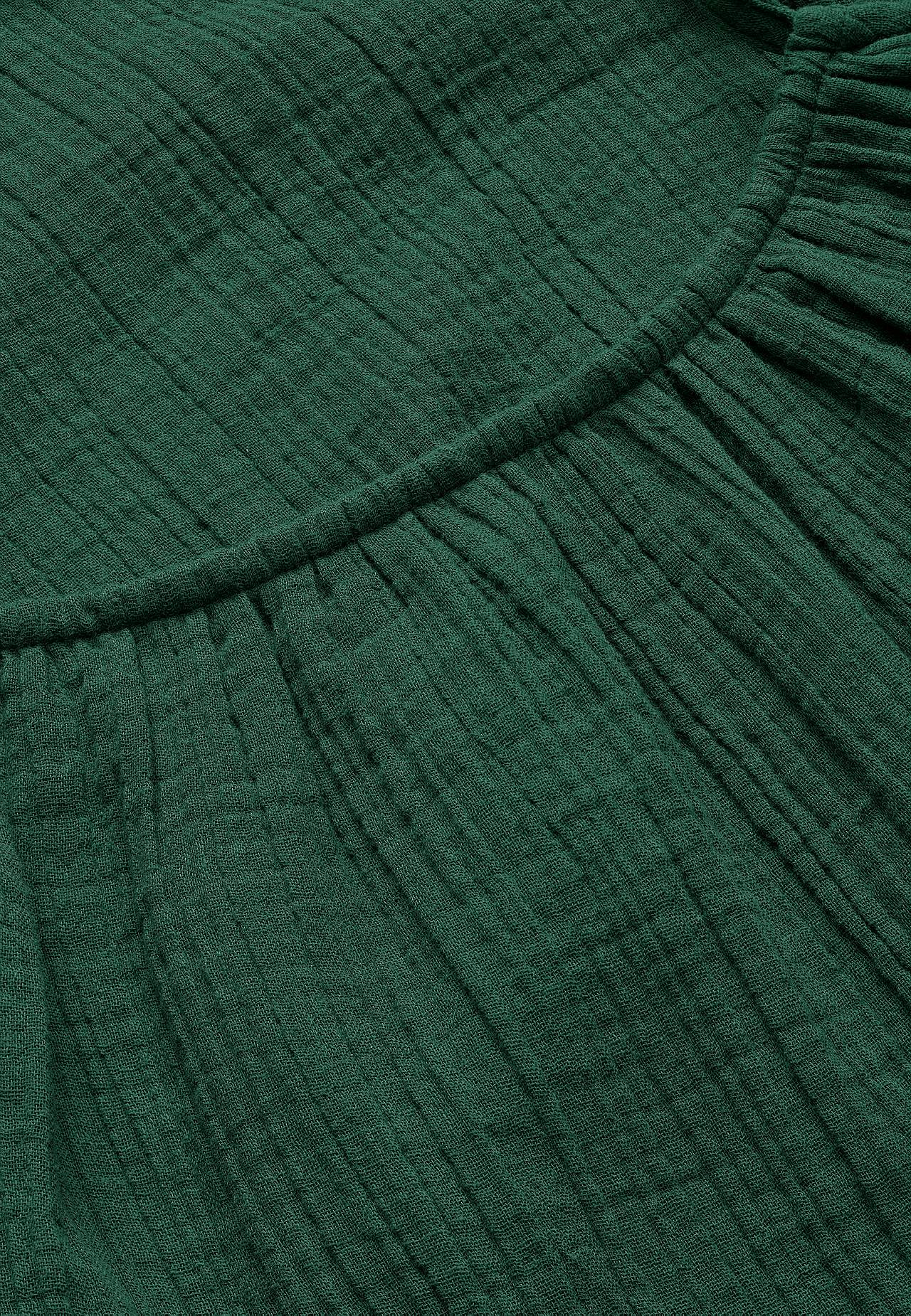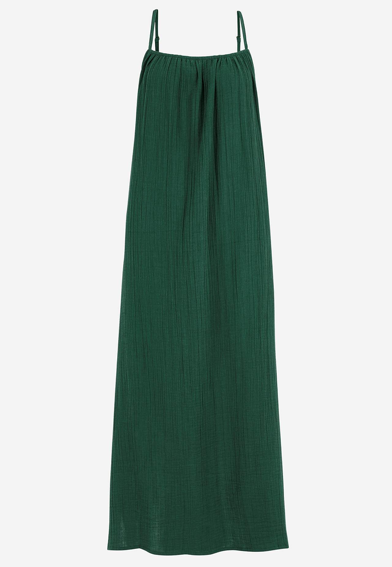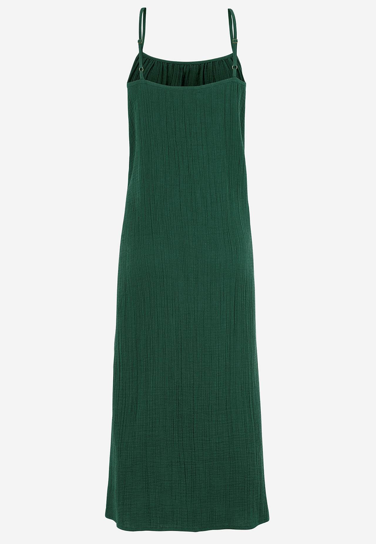 Viskozes krepauduma kleita ar skaistu tekstūru. Gaisīgs, mīksts materiāls. Brīvs piegriezums, ērts platums. Regulējamas plecu lencītes. Garums priekšpuses vidū atbilstīgi izmēram aptuveni 114-121 cm.