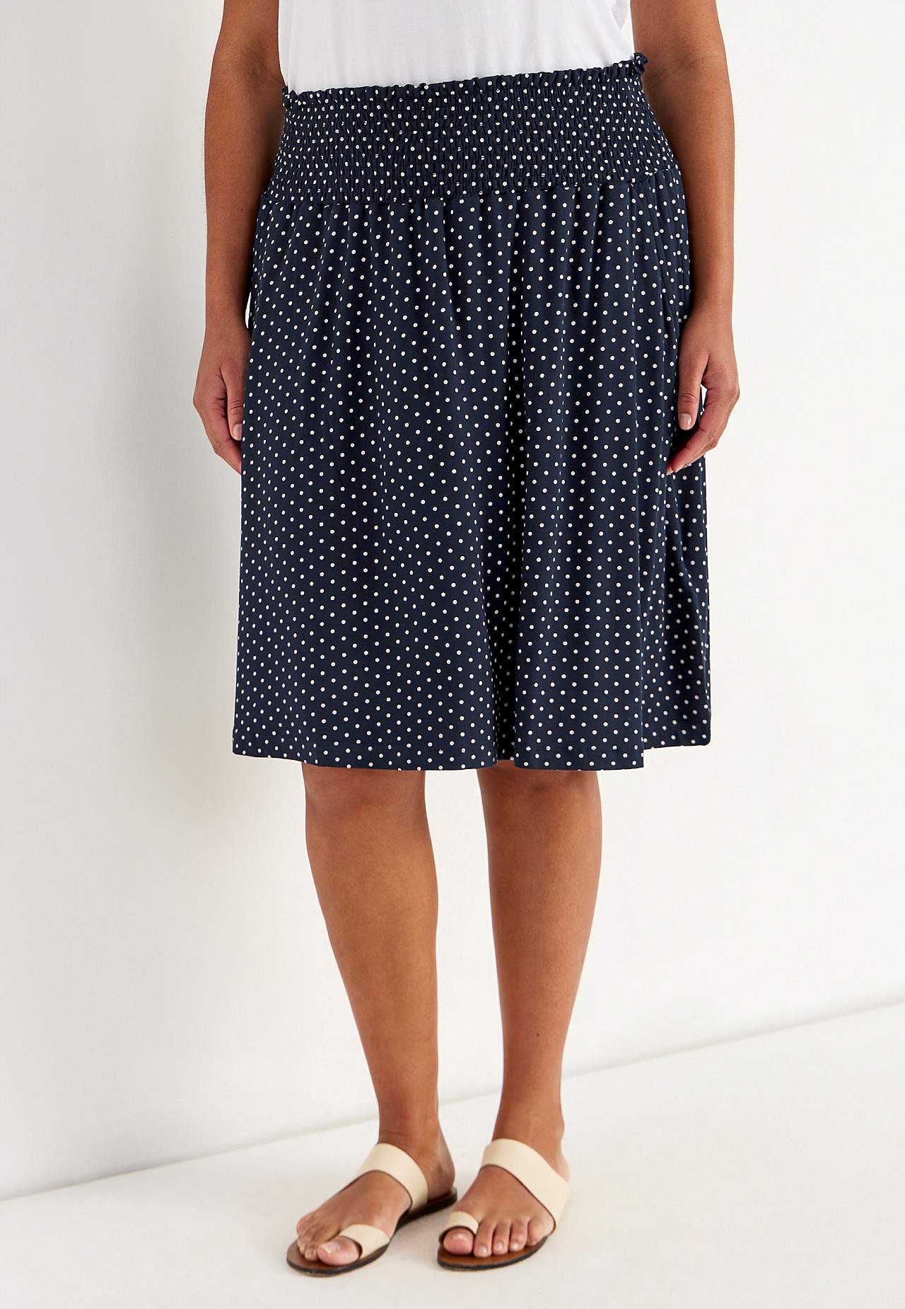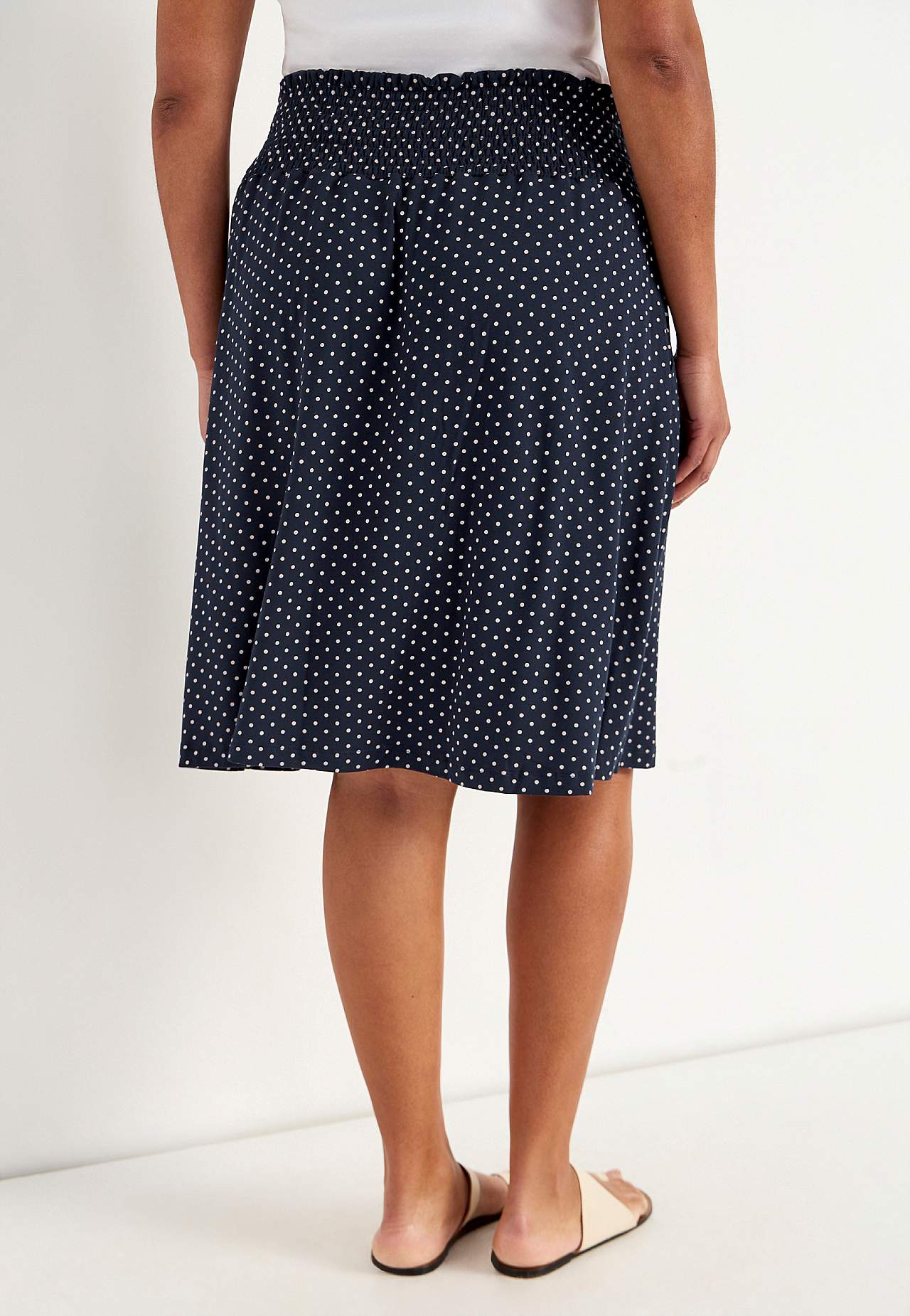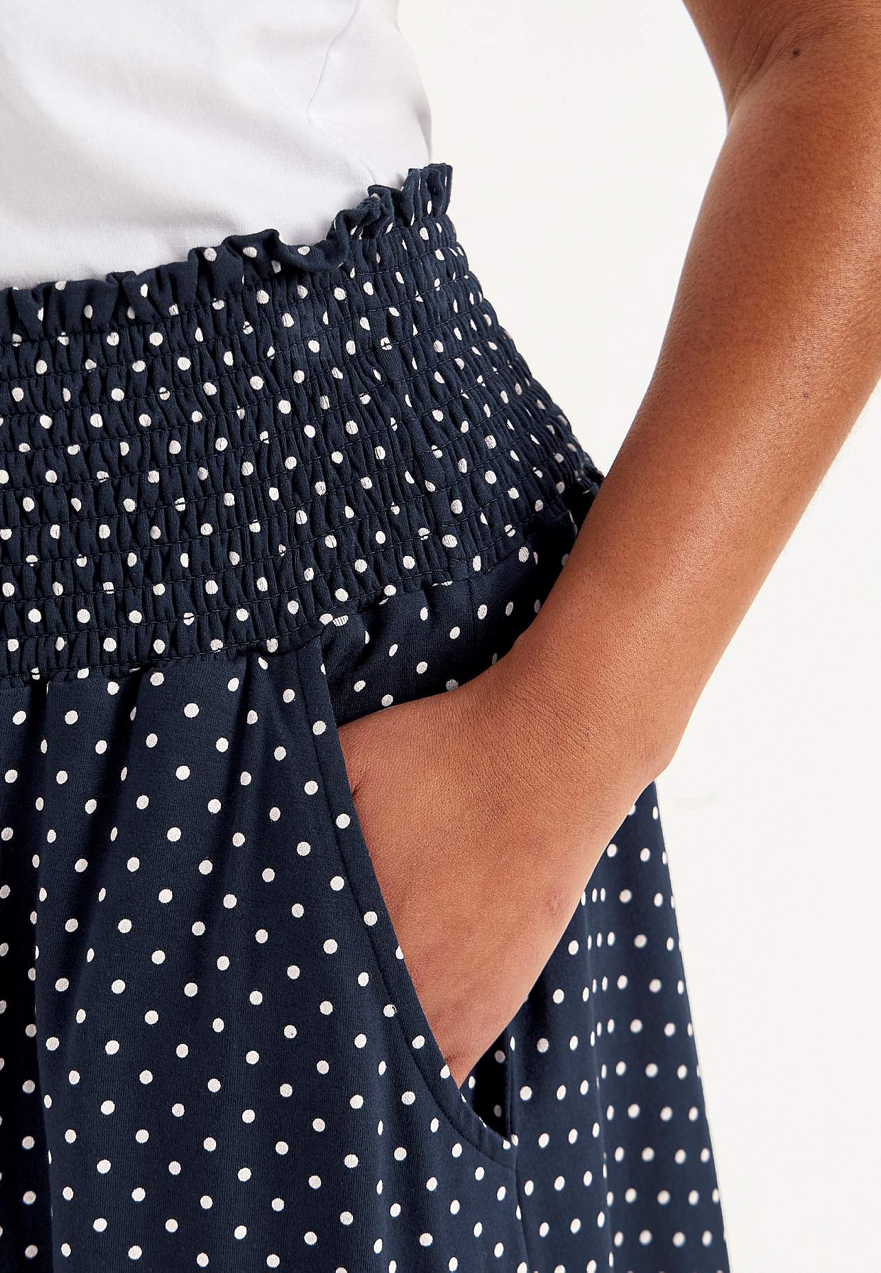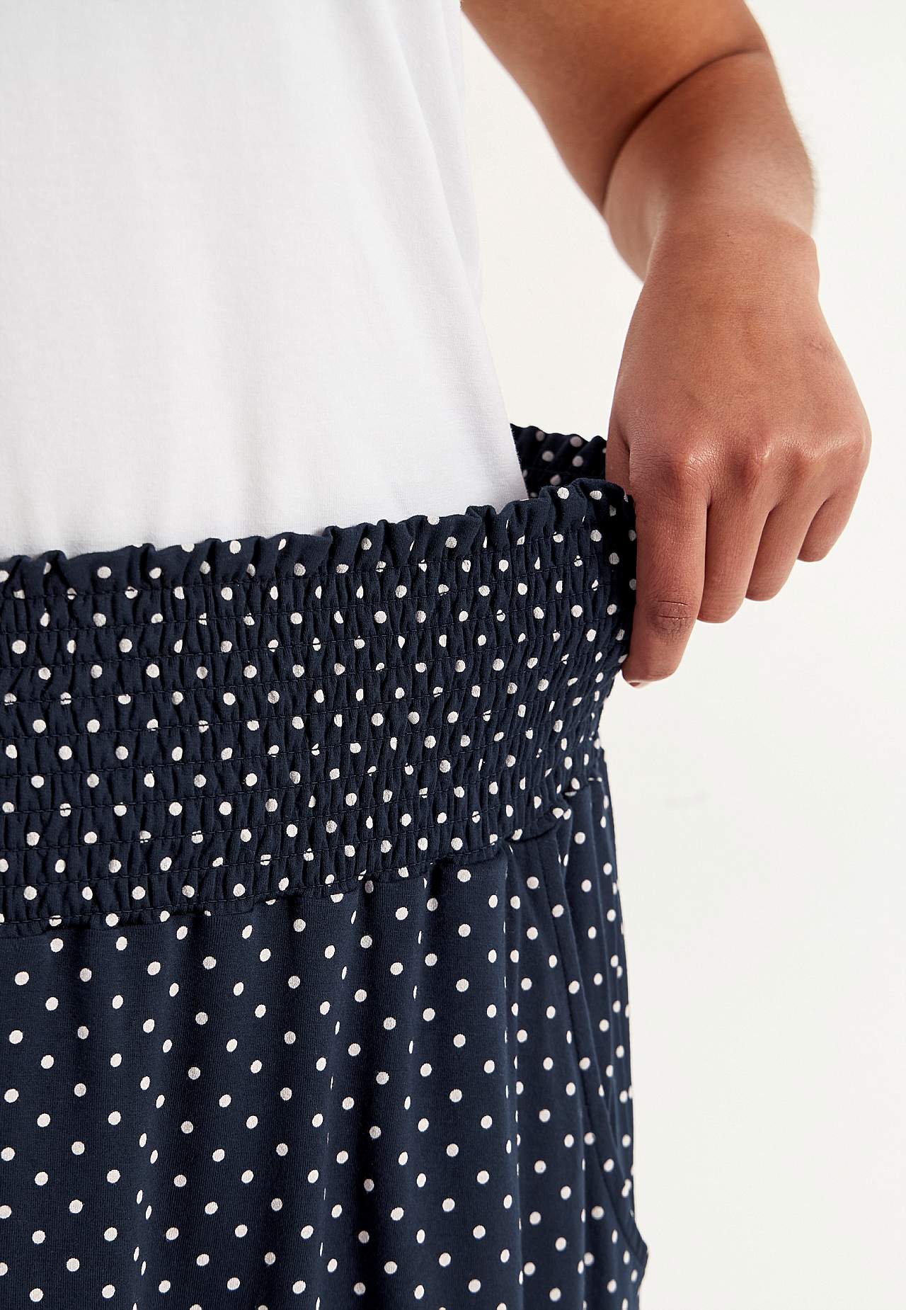 Paplatināti mīkstas, padevīgas trikotāžas svārki. Plats piegriezums. Plats, ērts savilkums jostasvietā. Sānos kabatas. Taisna apakšmala. Garums atbilstīgi izmēram aptuveni 60-62 cm.