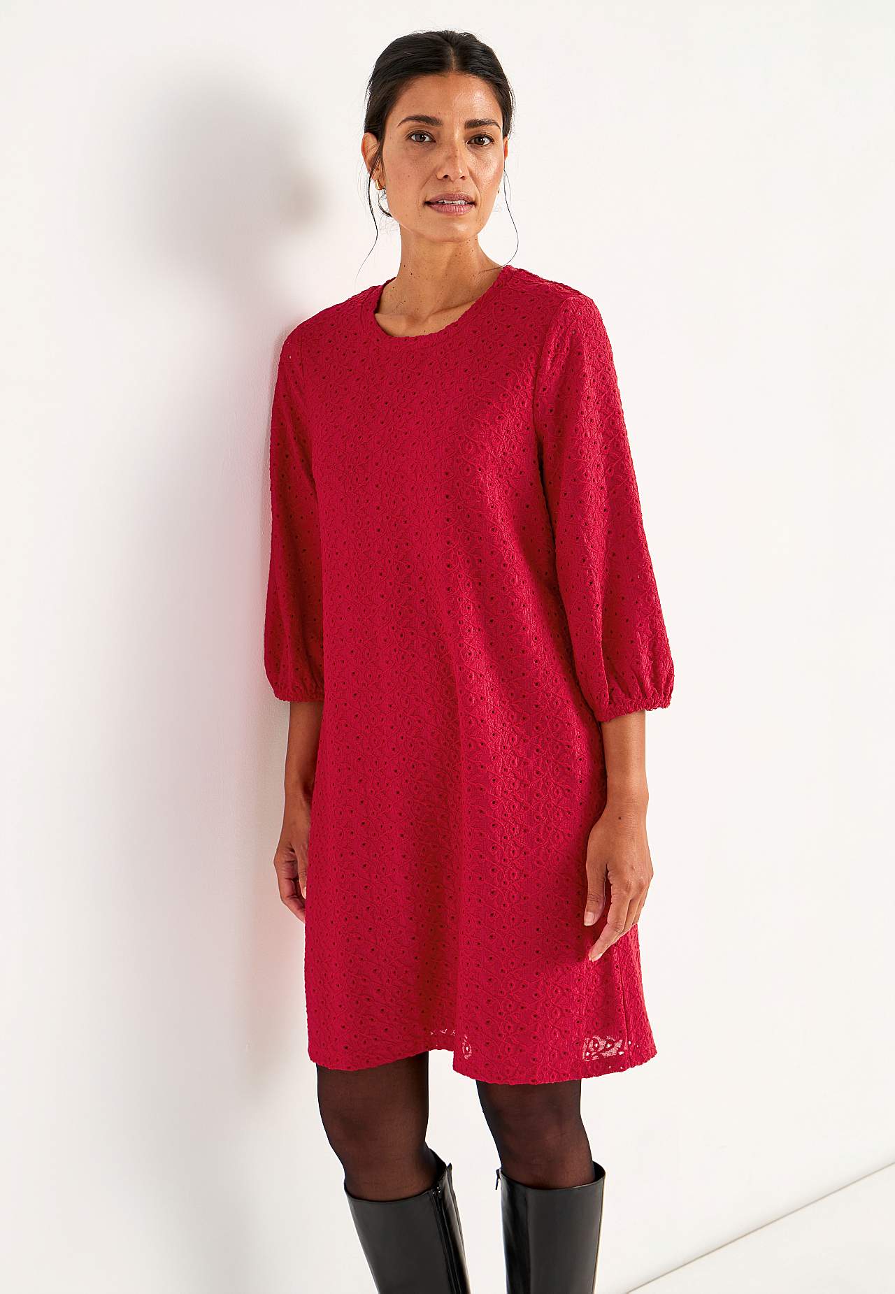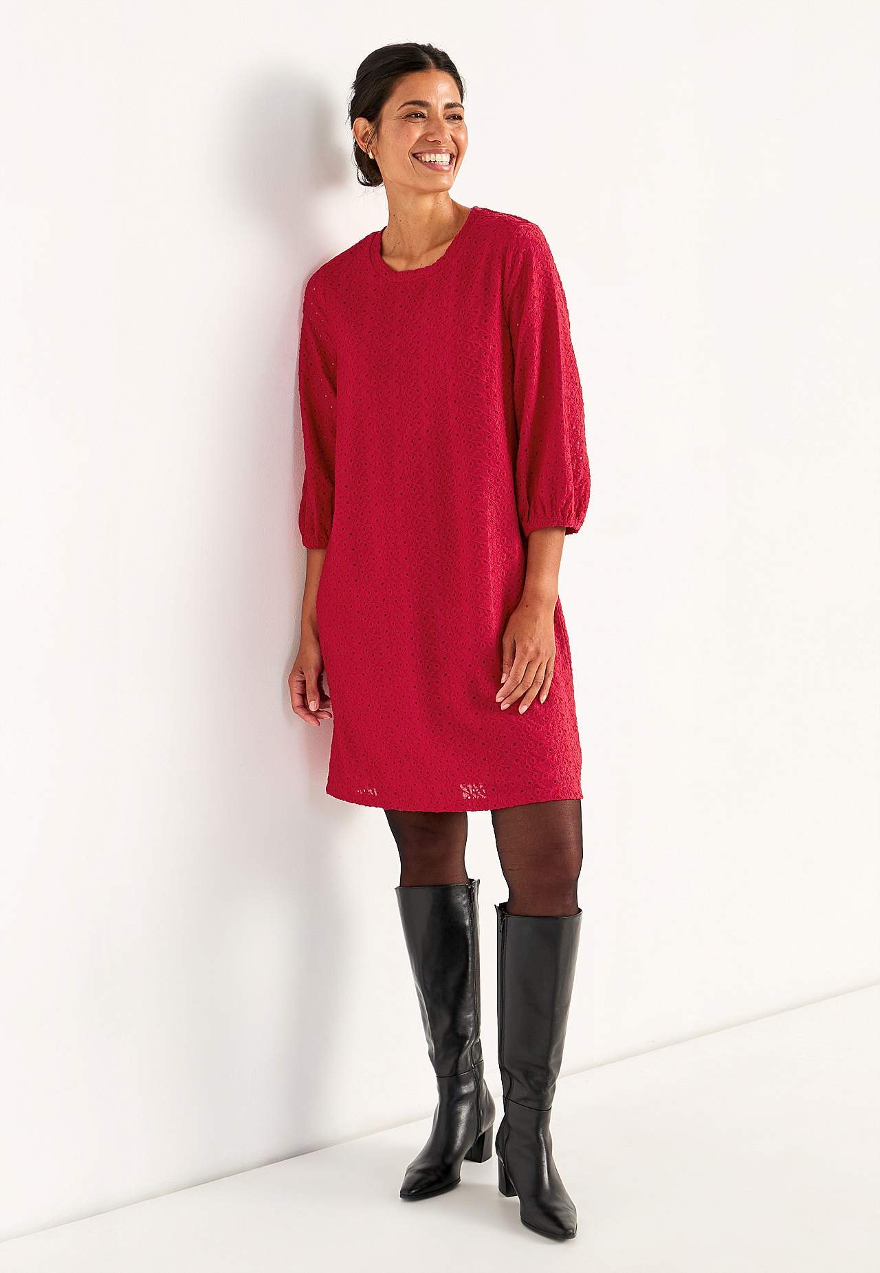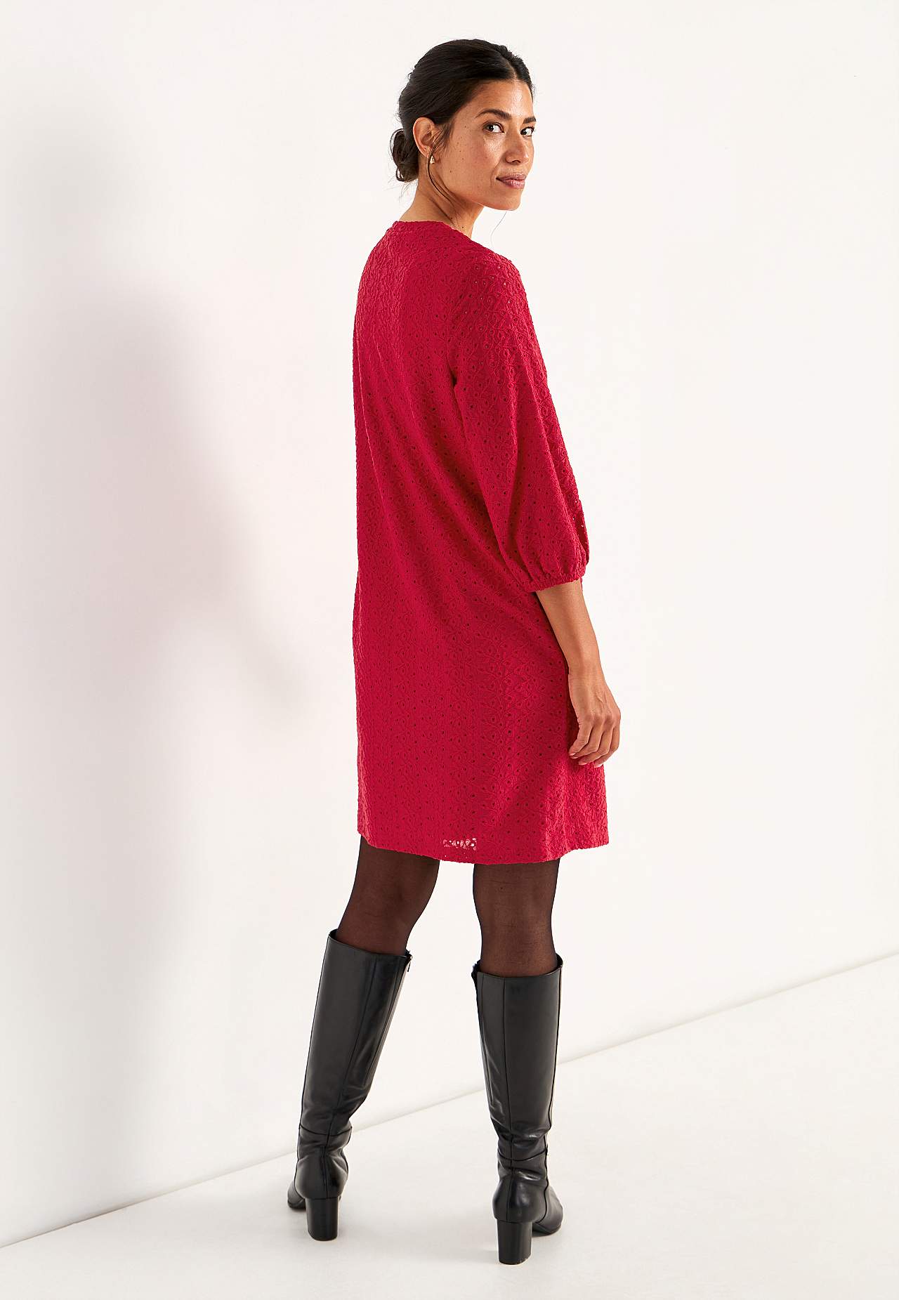 Jauka kleita ar caurumiņu rakstu. Viegls A silueta piegriezums. Apaļš kakla izgriezums. Kuplas 3/4 garuma piedurknes ar gumiju galā. Piešūta elastīga materiāla apakškleita. Taisna apakšmala. Garums no pleca atbilstīgi izmēram aptuveni 95-107 cm.