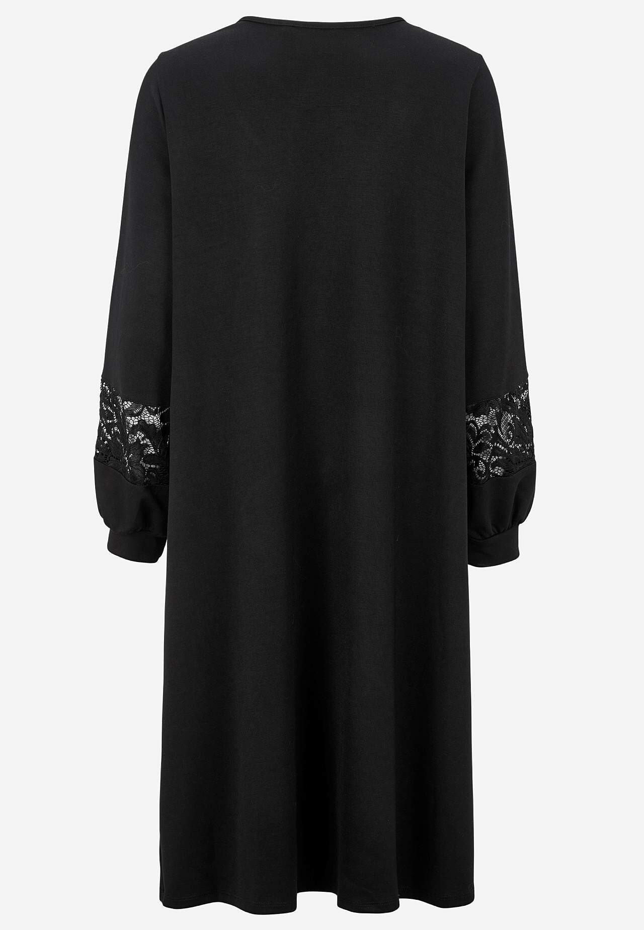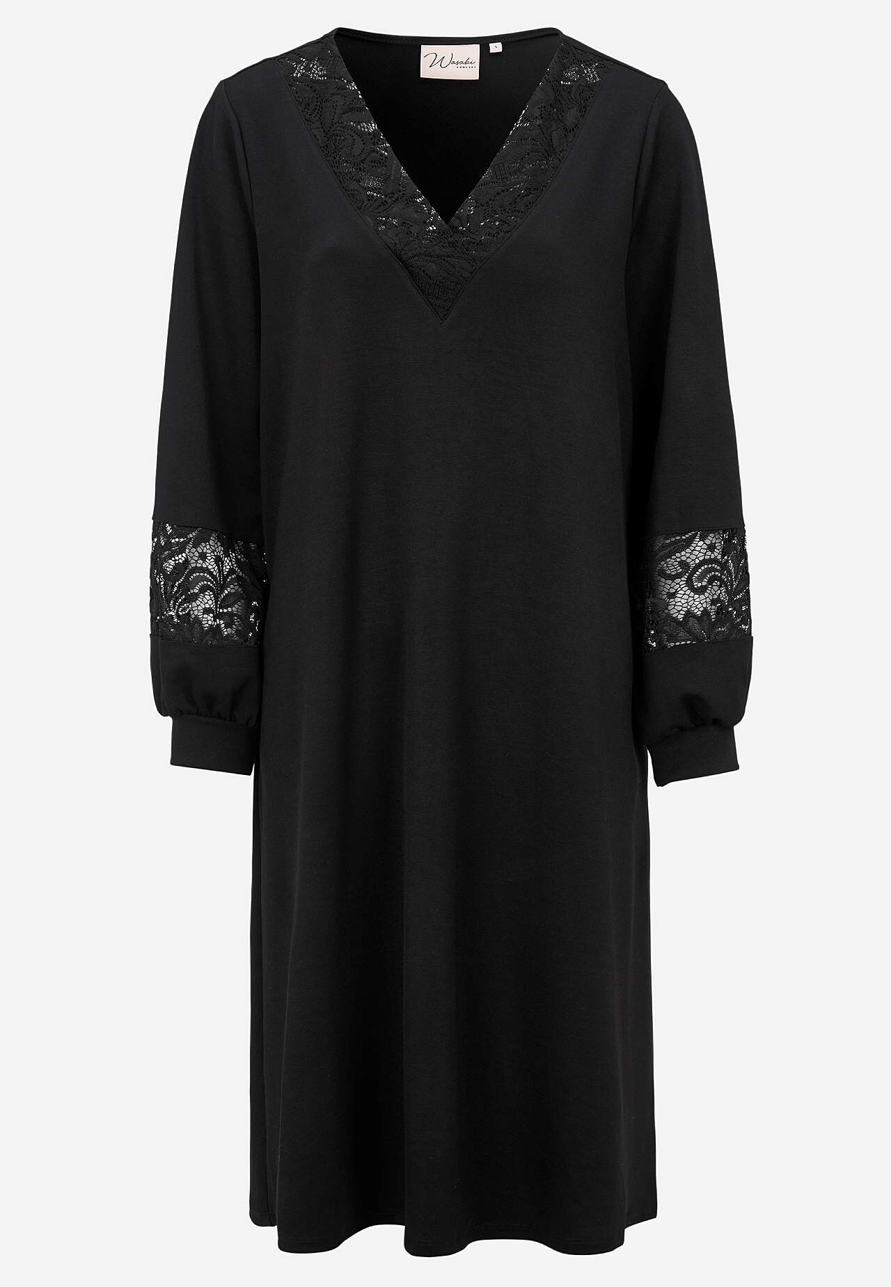 Īpaši mīksta un izturīga modāla maisījuma svētku kleita. Brīva piegriezuma A silueta modelis. V veida kakla izgriezums ar platu mežģīņu malu. Sānu vīlēs kabatas. Garas, platas piedurknes ar trikotāžas aproci un smalkām mežģīņu detaļām. Taisna apakšmala. Garums no pleca S (42./44.) izmēram apmēram 105 cm.