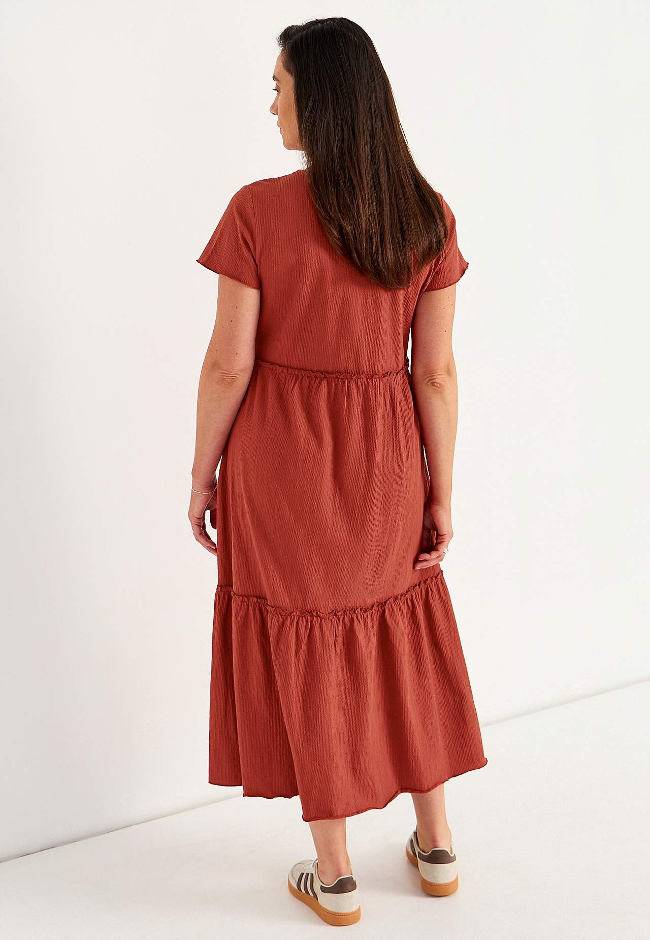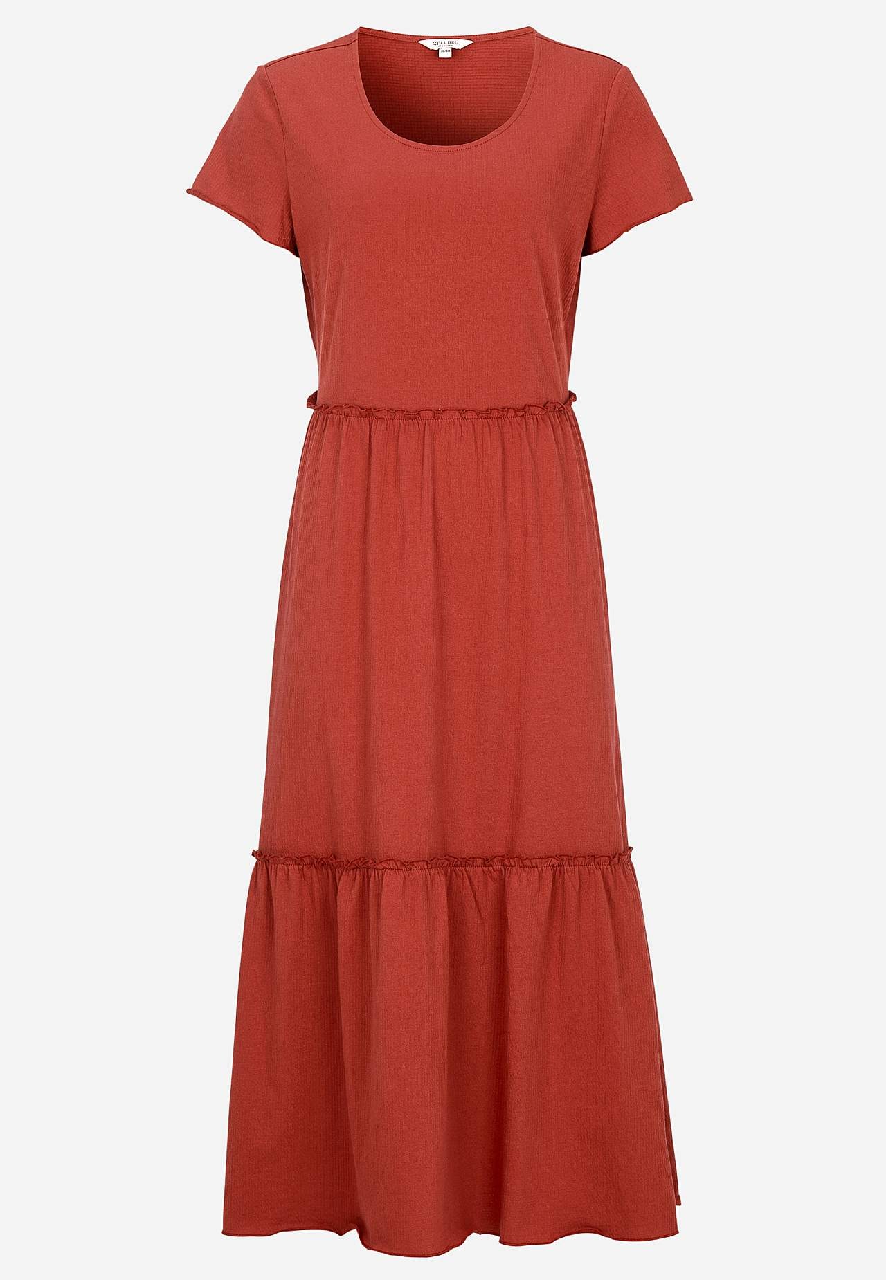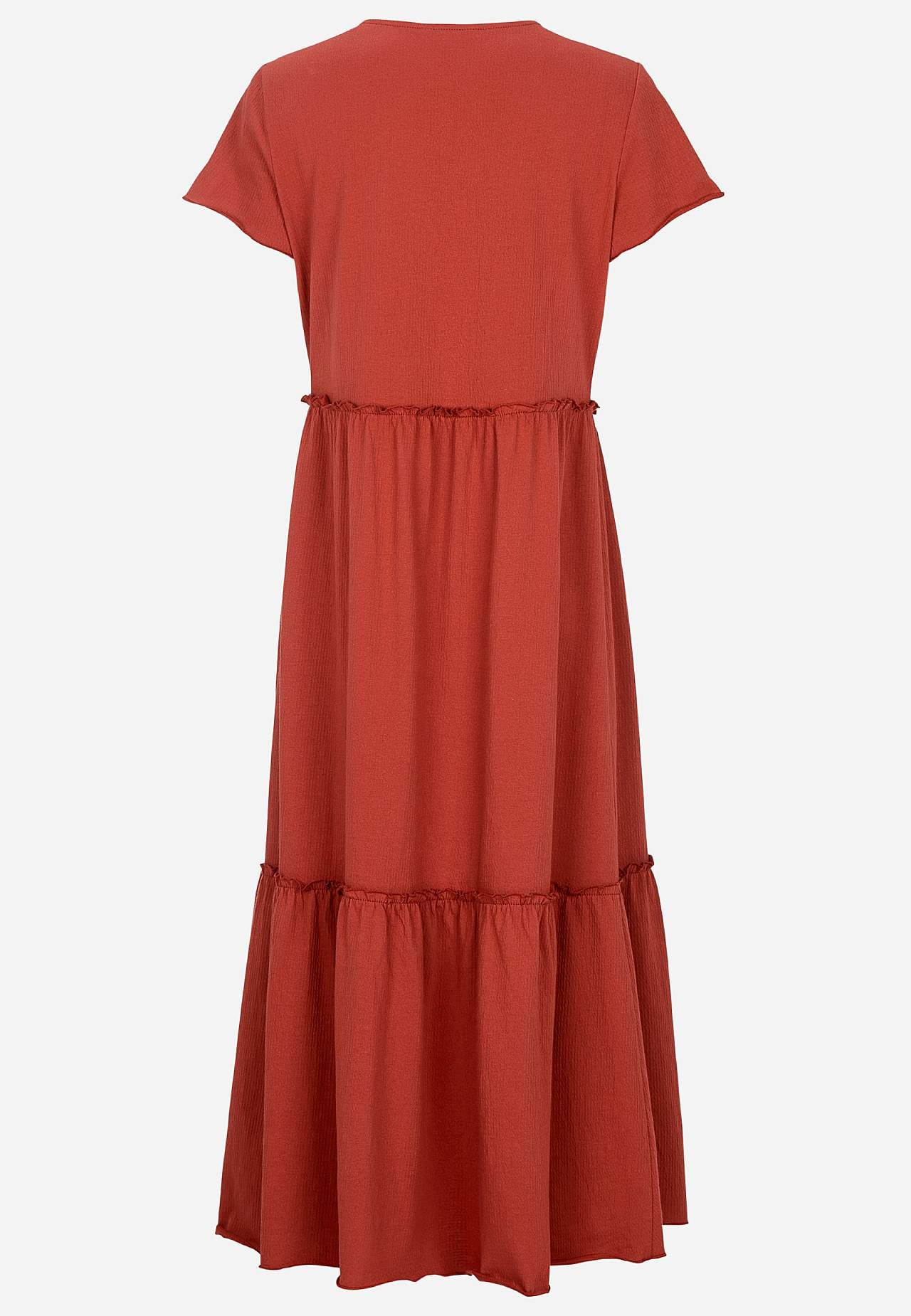 Elastīga, mīksta volānkleita ar viļņainu tekstūru. Brīvs A silueta piegriezums. Paplatināta svārku daļa. Šaura, viļņota overloka vīle apakšmalā, gar volāniem un piedurkņu galā. Apaļš kakla izgriezums. Īsas pagarinātas plecu līnijas piedurknes. Viegli noapaļota apakšmala. Garums mugurpusē visiem izmēriem aptuveni 128 cm.