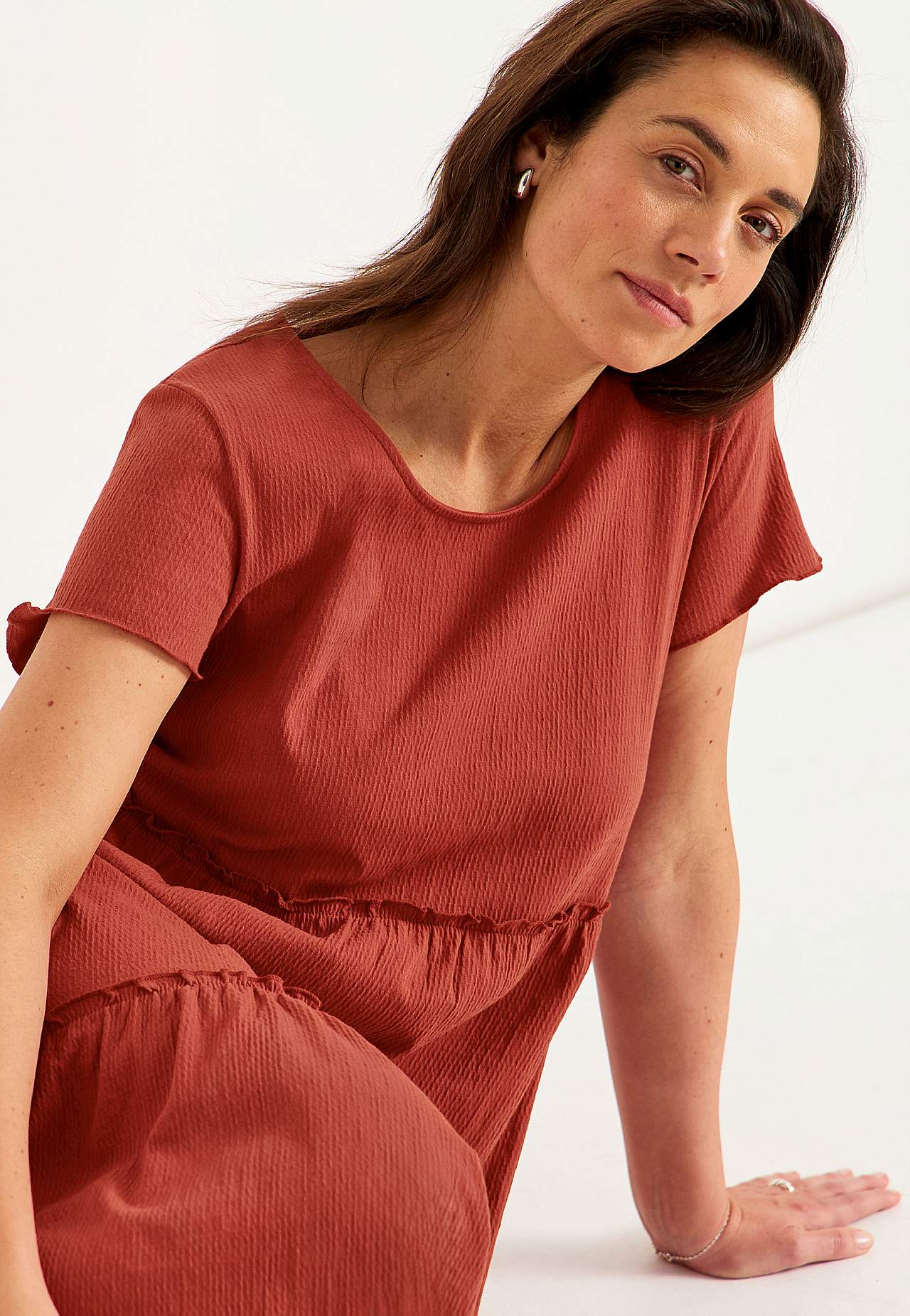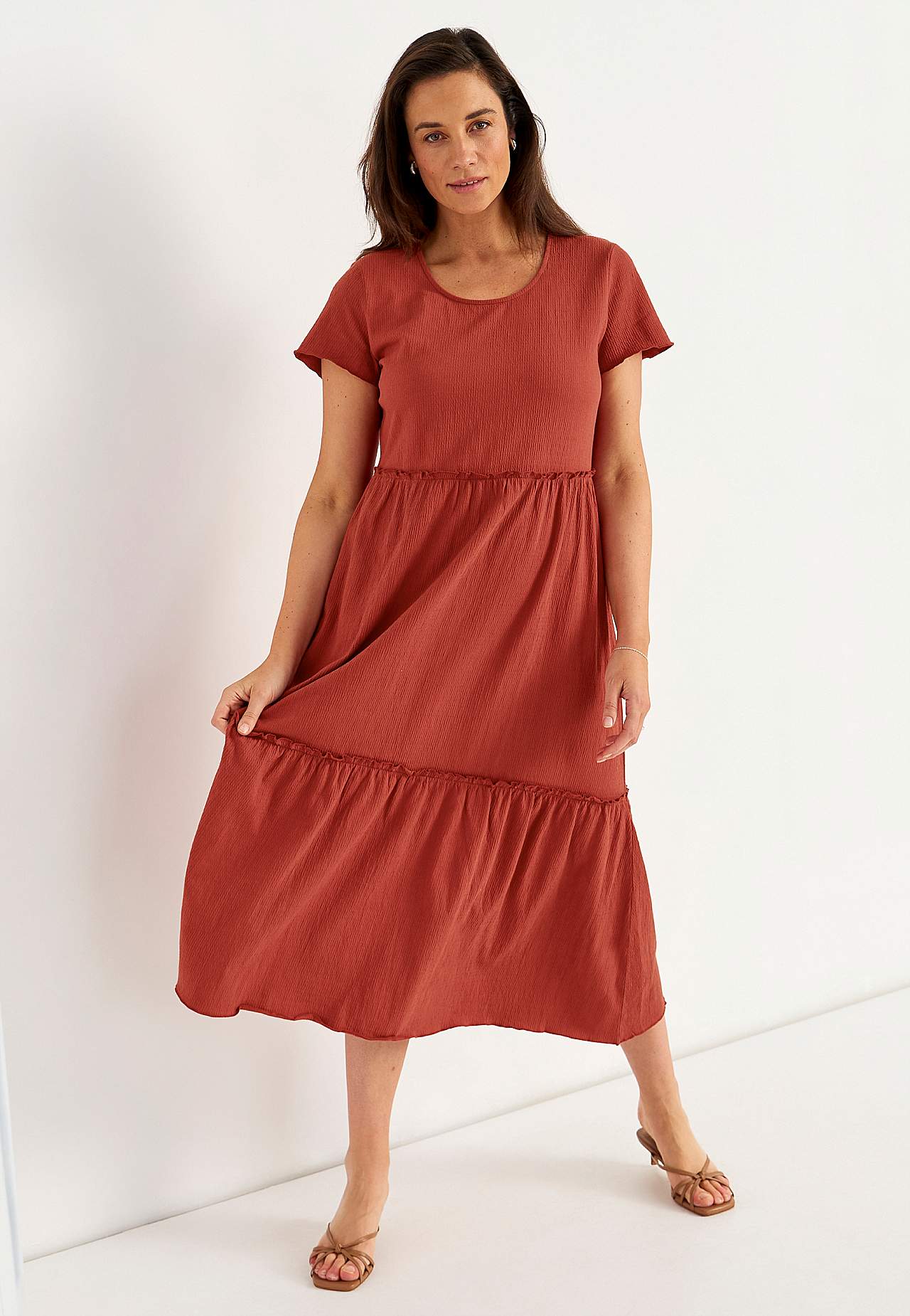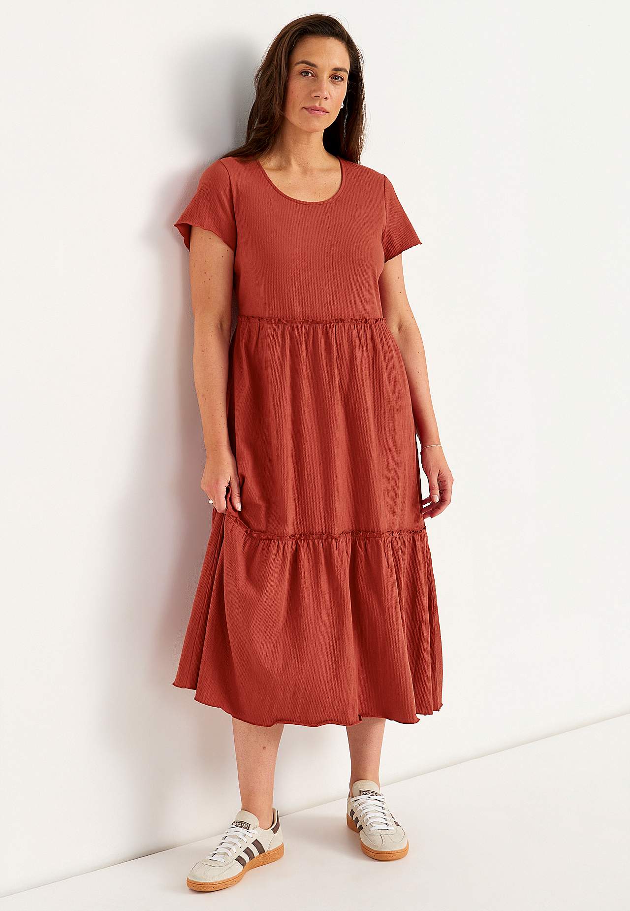 Elastīga, mīksta volānkleita ar viļņainu tekstūru. Brīvs A silueta piegriezums. Paplatināta svārku daļa. Šaura, viļņota overloka vīle apakšmalā, gar volāniem un piedurkņu galā. Apaļš kakla izgriezums. Īsas pagarinātas plecu līnijas piedurknes. Viegli noapaļota apakšmala. Garums mugurpusē visiem izmēriem aptuveni 128 cm.