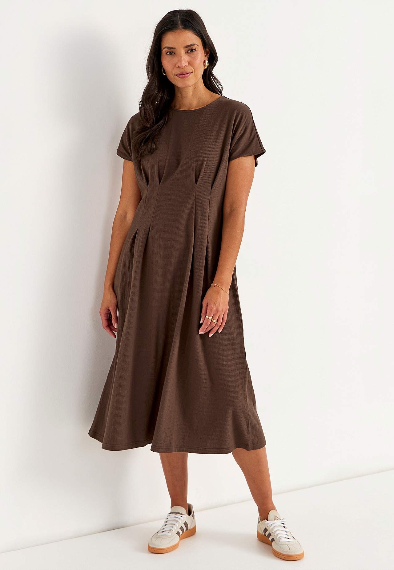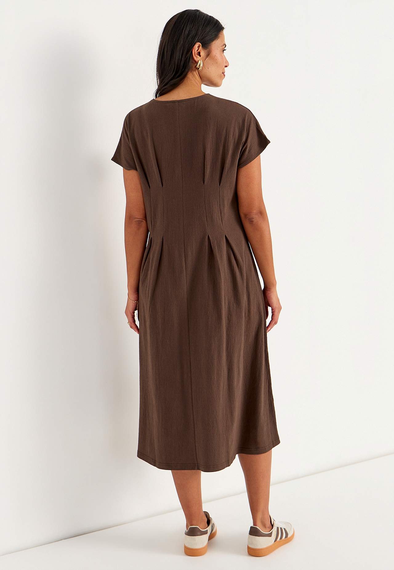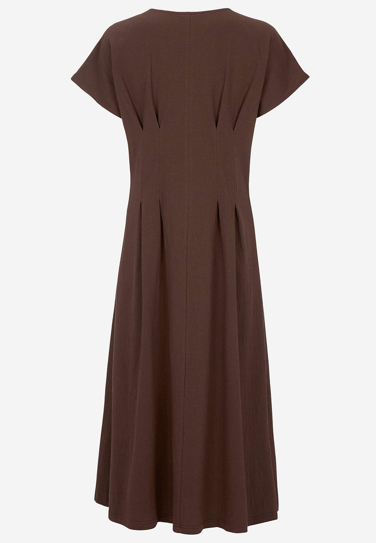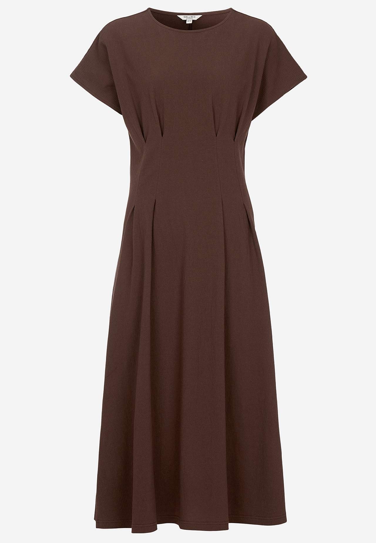 Sievišķīga kleita ar viļņotu tekstūru. Mīksts, elastīgs audums. Standarta piegriezums ar izteikti akcentētu jostasvietu un paplatinātu svārku daļu. Apaļš kakla izgriezums. Īsas pagarinātas plecu līnijas piedurknes. Viduklī vizuāli slaidinošas iešuves gan priekšpusē, gan mugurpusē. Viegli noapaļota apakšmala. Garums mugurpus... Lasīt vairāk