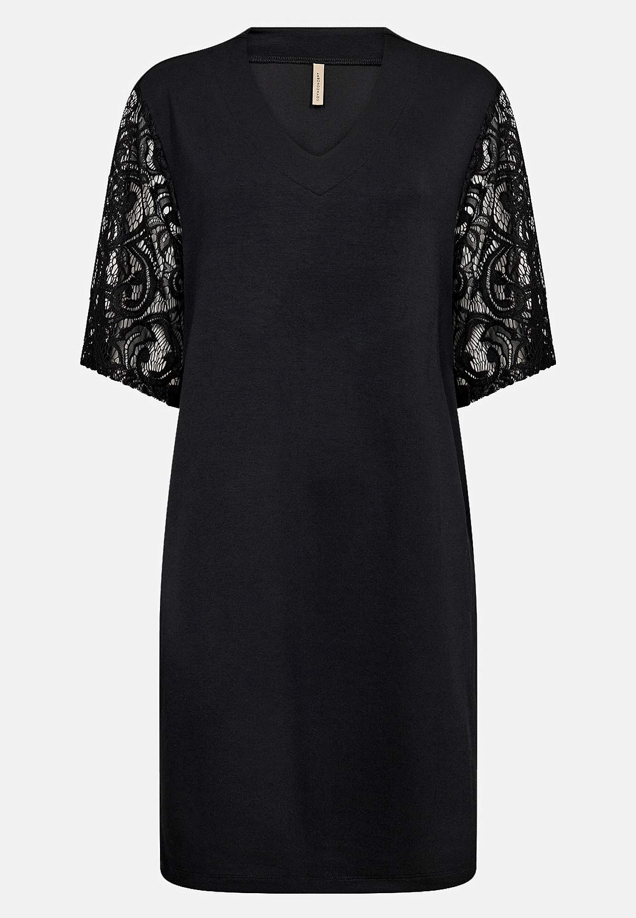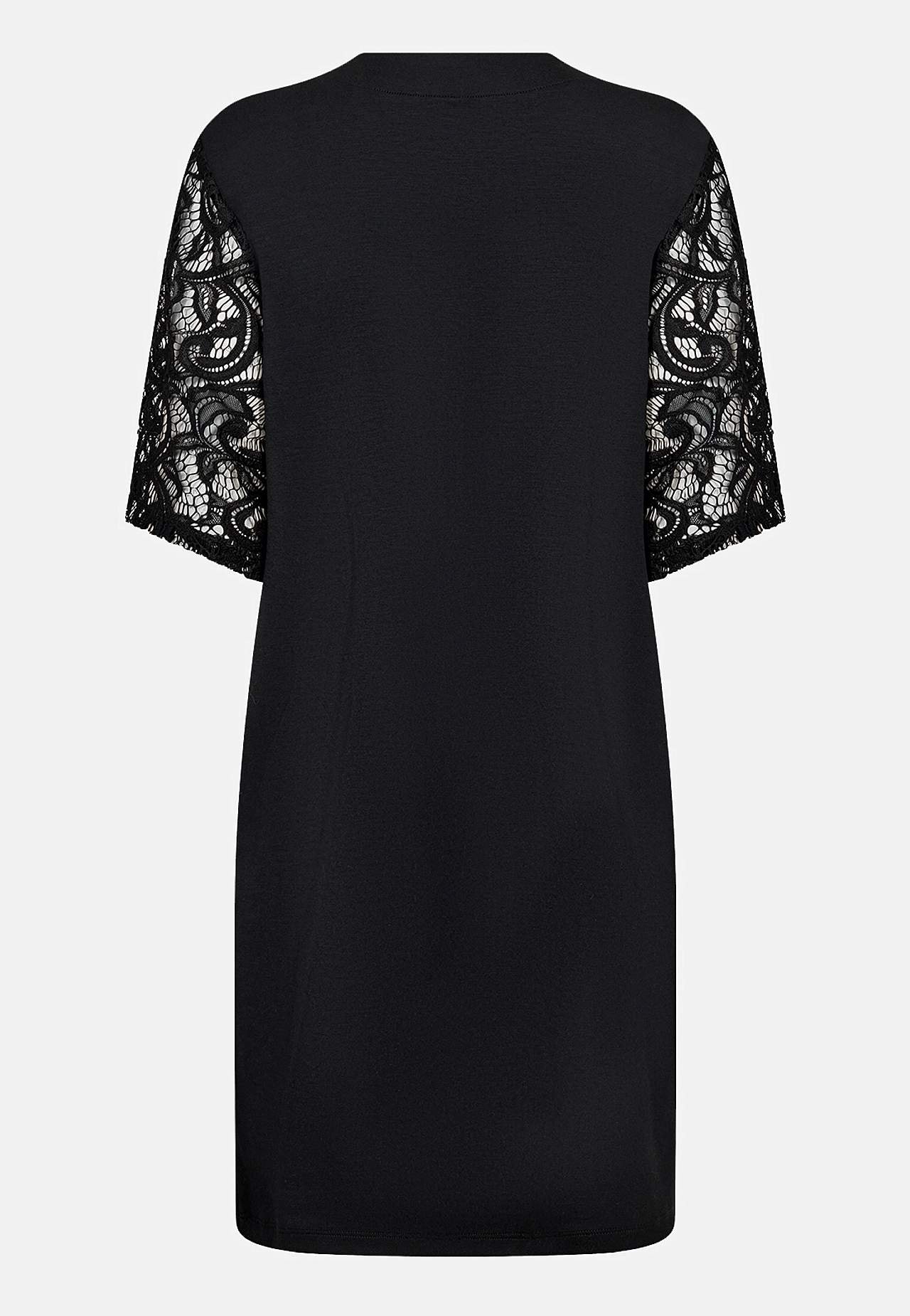 Patīkami mīksta modāla maisījuma un pabiezas trikotāžas kleita. Taisns piegriezums. Īss modelis. V veida kakla izgriezums. Sānos kabatas. Elegantas 3/4 garuma mežģīņu piedurknes. Taisna apakšmala. Garums no pleca S (38.) izmēram apm. 98 cm.