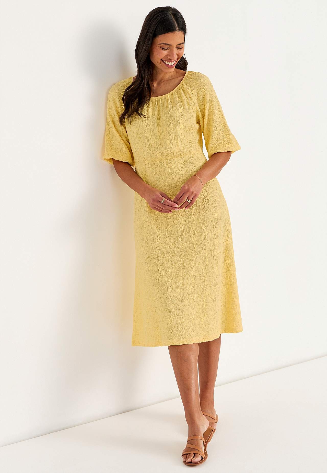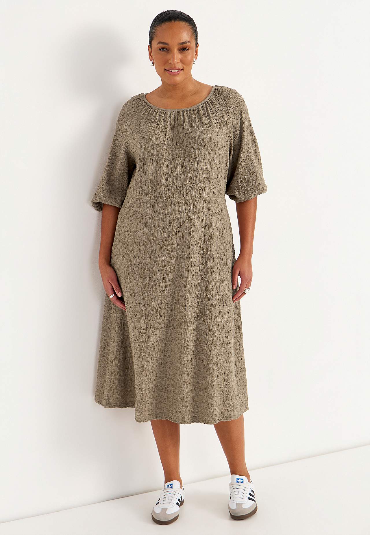 Kleita no patīkami ērta, elastīga kokvilnas maisījuma ar tekstūru. Standarta piegriezums. Nedaudz pieguļoša augšdaļa, paplatināta svārku daļa. Apaļš, plats kakla izgriezums ar krokojumu visapkārt. Platas 3/4 garuma reglāna piedurknes ar krokojumu un šauru apmalīti galā. Griezuma līnija jostasvietā ar slēptu elastīgu vīli un... Lasīt vairāk