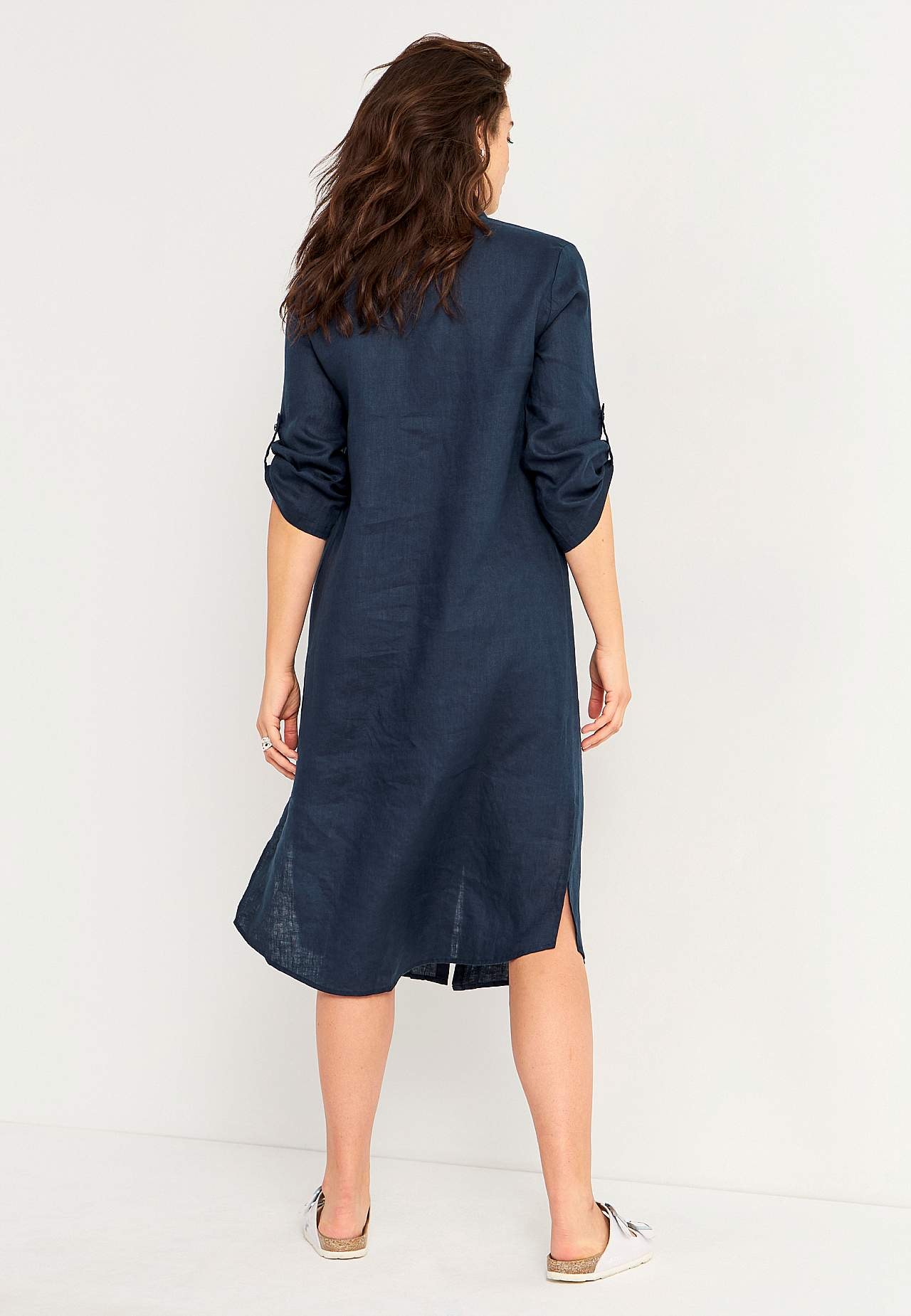Kreklkleita no 100% lina. Brīvs, taisns piegriezums. Pogu aizdare visā garumā. Garas, atlokāmas piedurknes, fiksējamas ar pogas aizdari. Krūšu iešuves, lai nodrošinātu labu piegulšanu augumam. Perfekta kleita ikdienas gaitām. Garums no pleca atkarībā no izmēra: apmēram 116-124 cm.