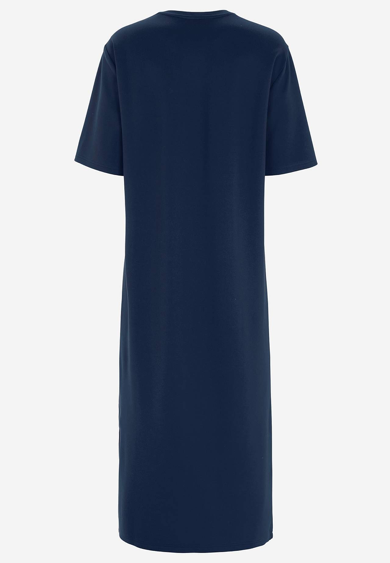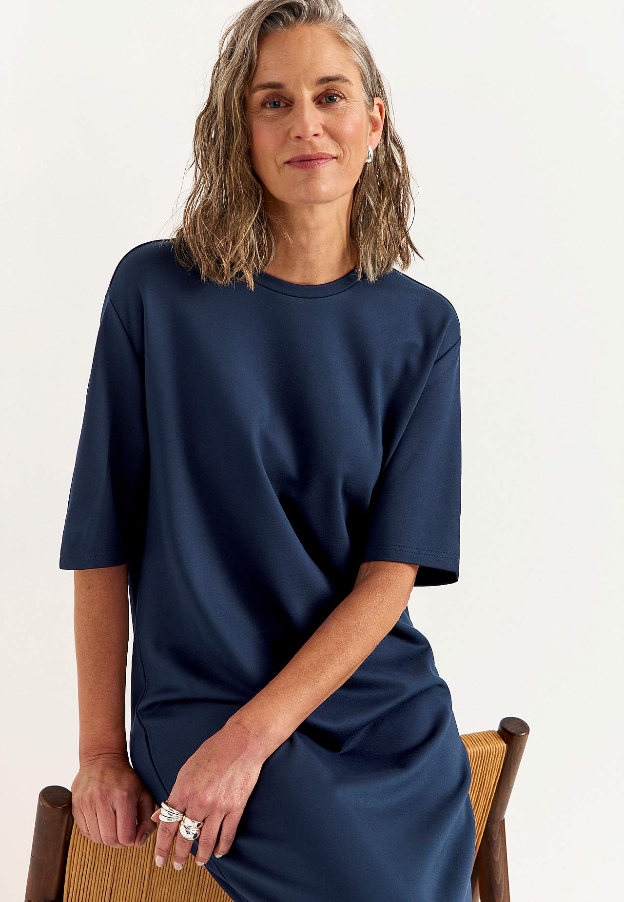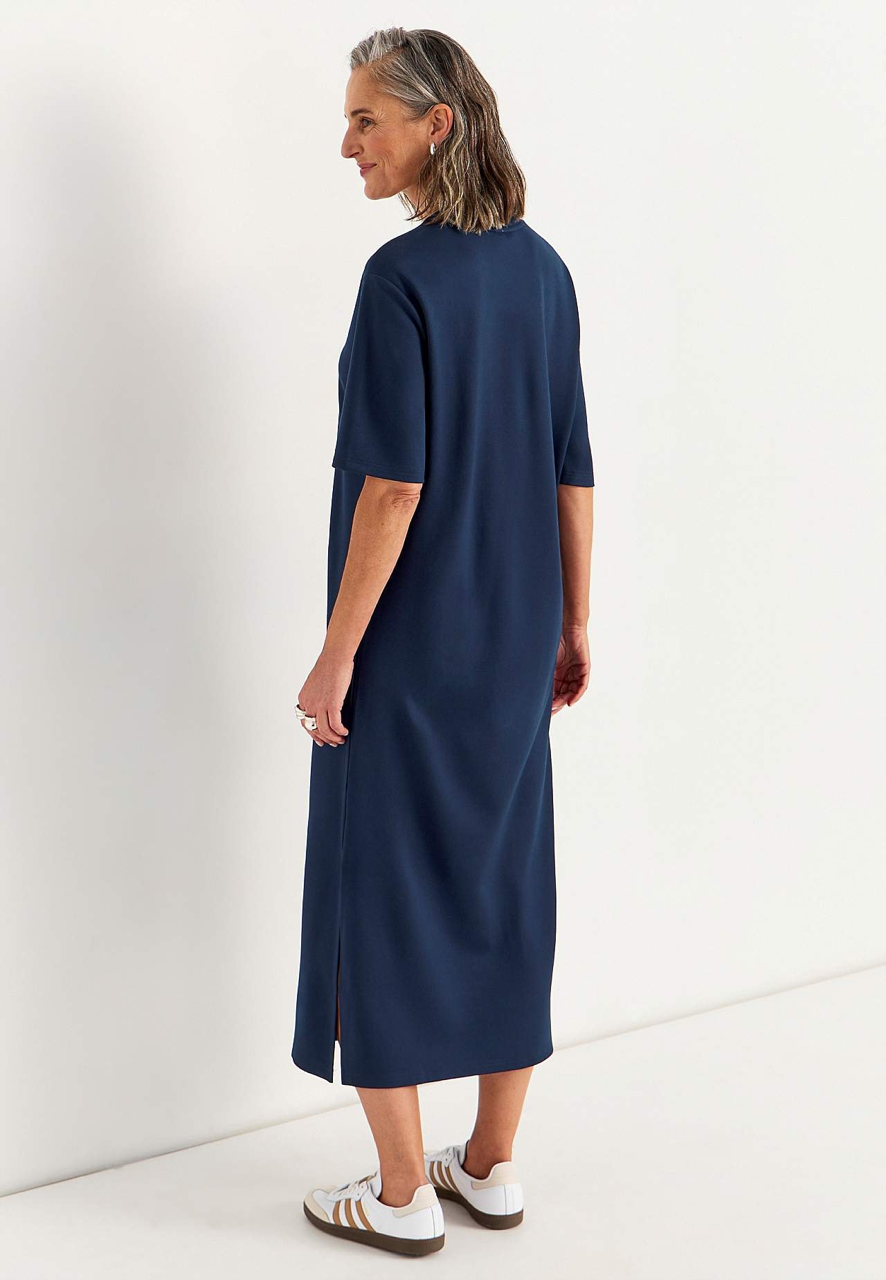 Mīksta stingras un elastīgas trikotāžas kleita. Taisns, brīvs piegriezums. Apaļš kakla izgriezums. Pazemināta plecu līnija. Īsas piedurknes. Taisna apakšmala ar augstu šķēlumu sānos. Garums no pleca apm. 121 cm visiem izmēriem.