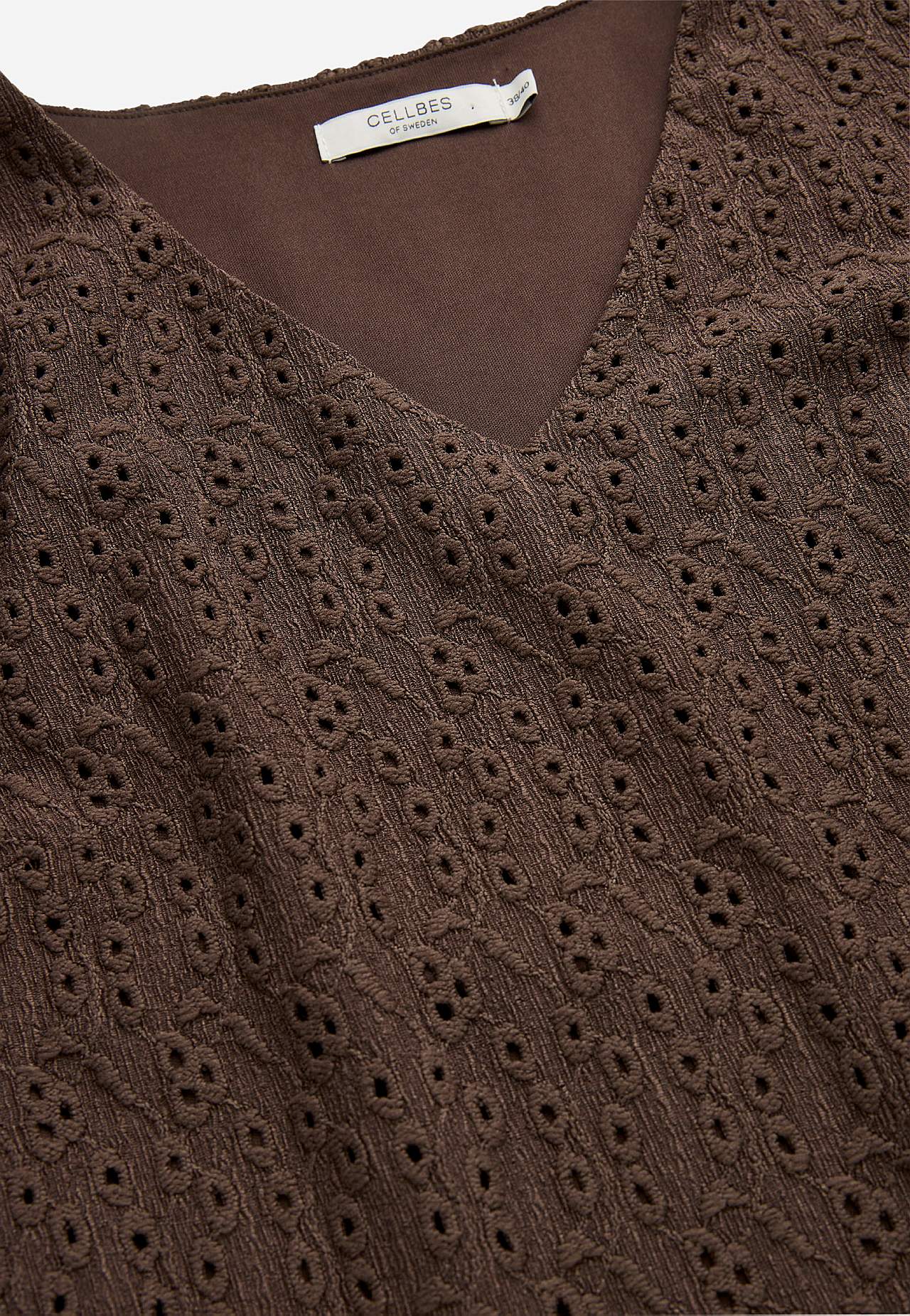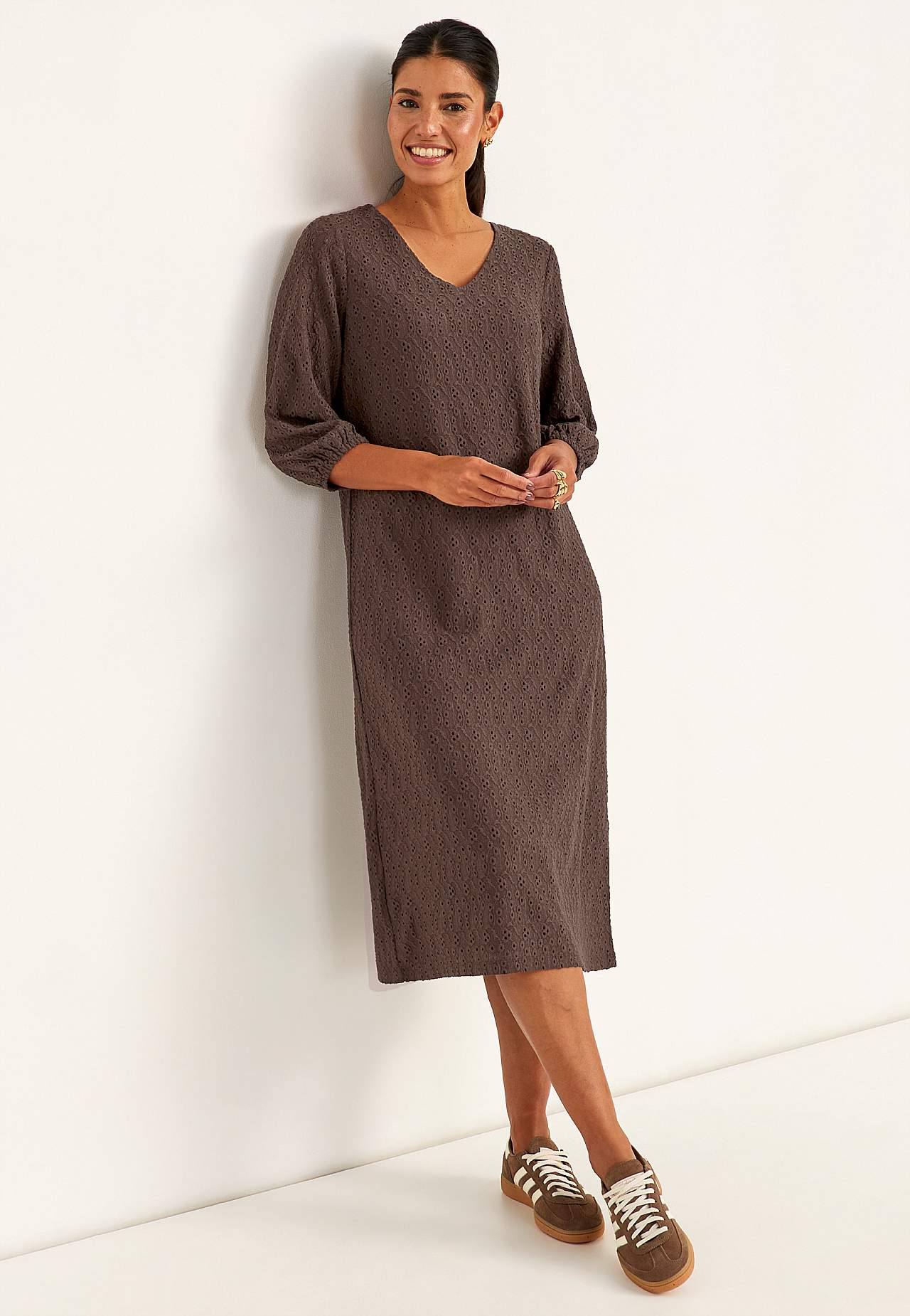 Oderēta kleita ar teksturētu caurumiņu raksta izšuvumu. Ērts, elastīgs materiāls. Viegla A silueta piegriezums. V veida kakla izgriezums. Krūšu iešuves. Neoderētas 3/4 garuma piedurknes ar gumiju galā. Taisna apakšmala. Garums mugurpusē aptuveni 120 cm visiem izmēriem.