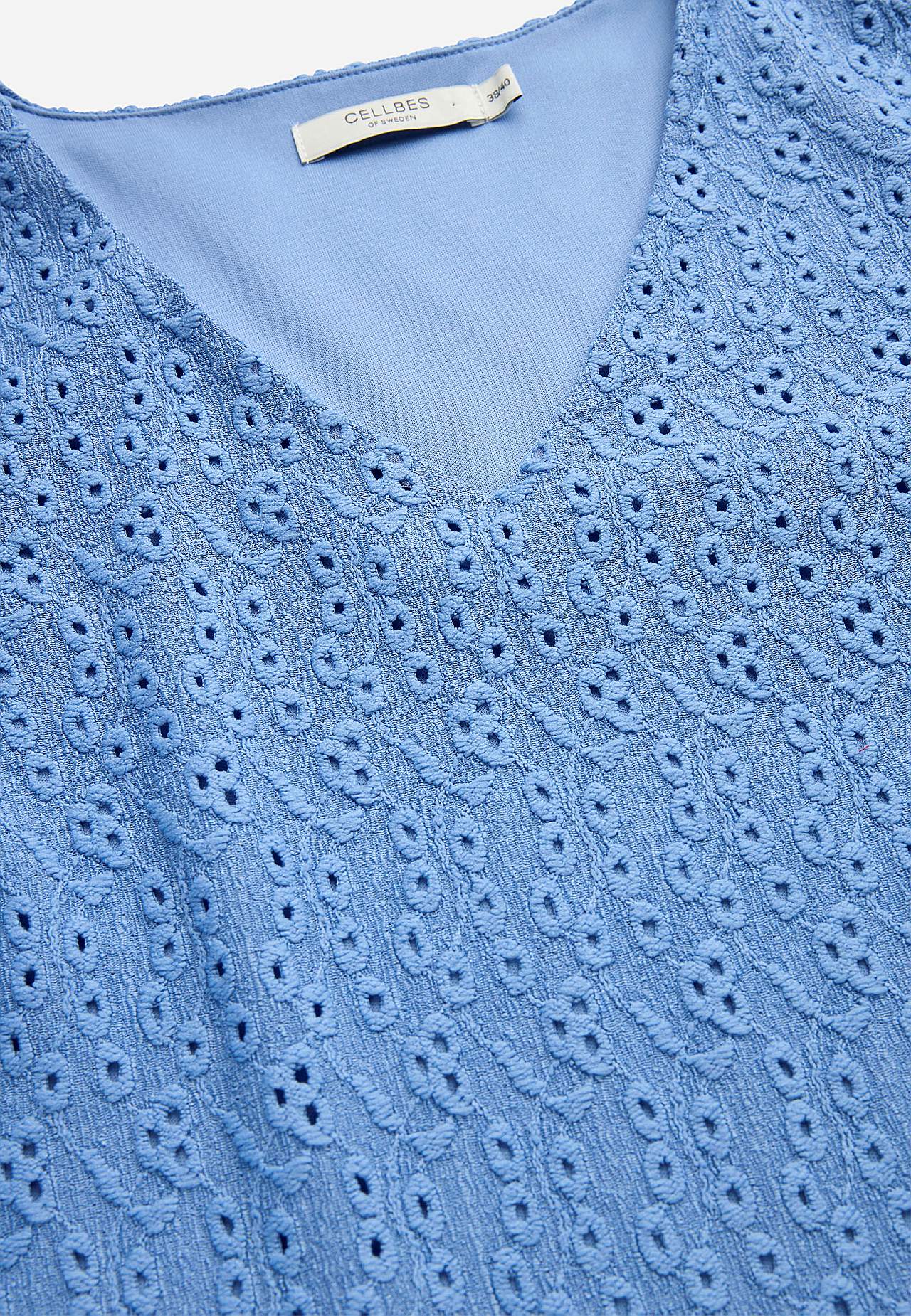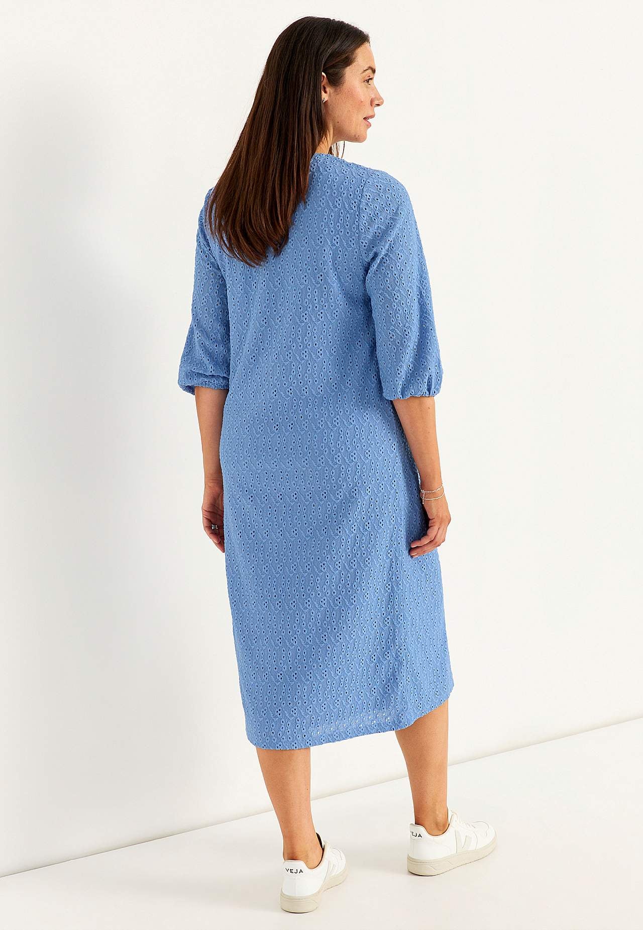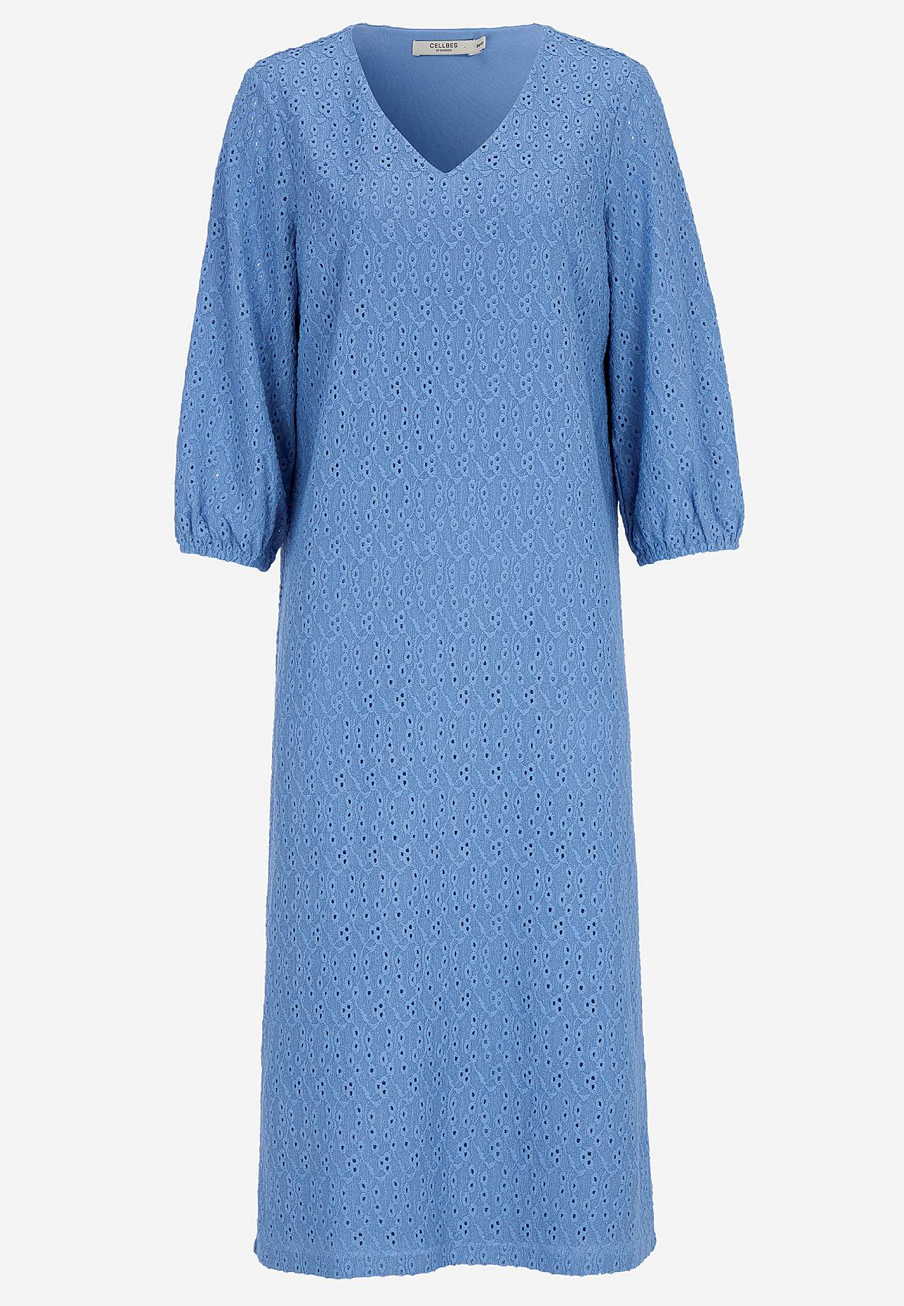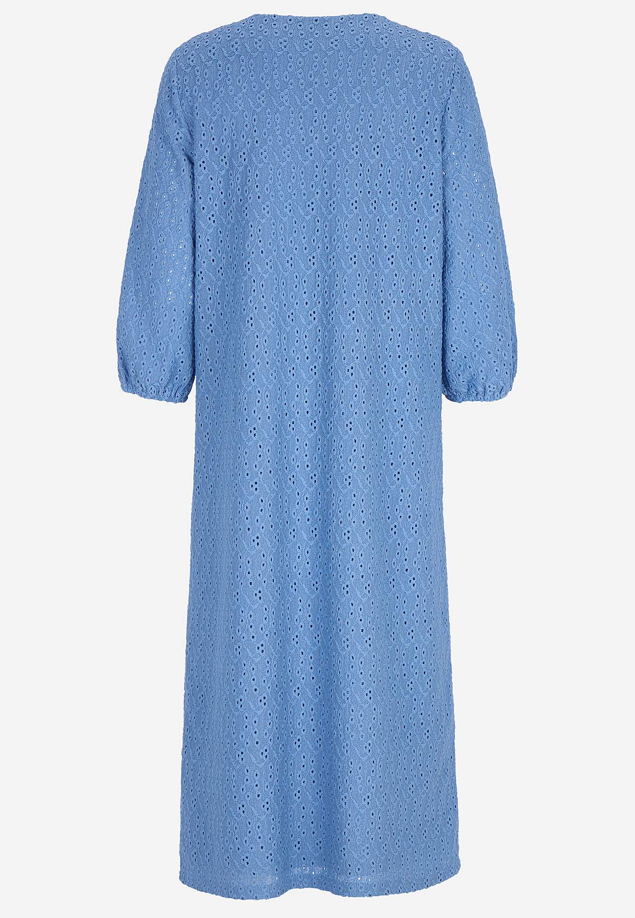 Oderēta kleita ar teksturētu caurumiņu raksta izšuvumu. Ērts, elastīgs materiāls. Viegla A silueta piegriezums. V veida kakla izgriezums. Krūšu iešuves. Neoderētas 3/4 garuma piedurknes ar gumiju galā. Taisna apakšmala. Garums mugurpusē aptuveni 120 cm visiem izmēriem.