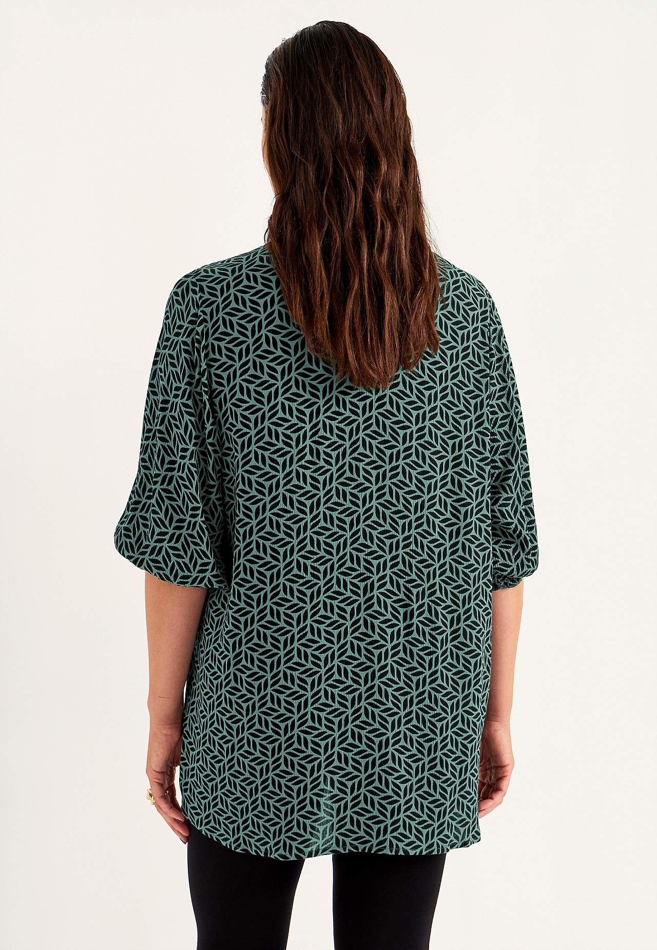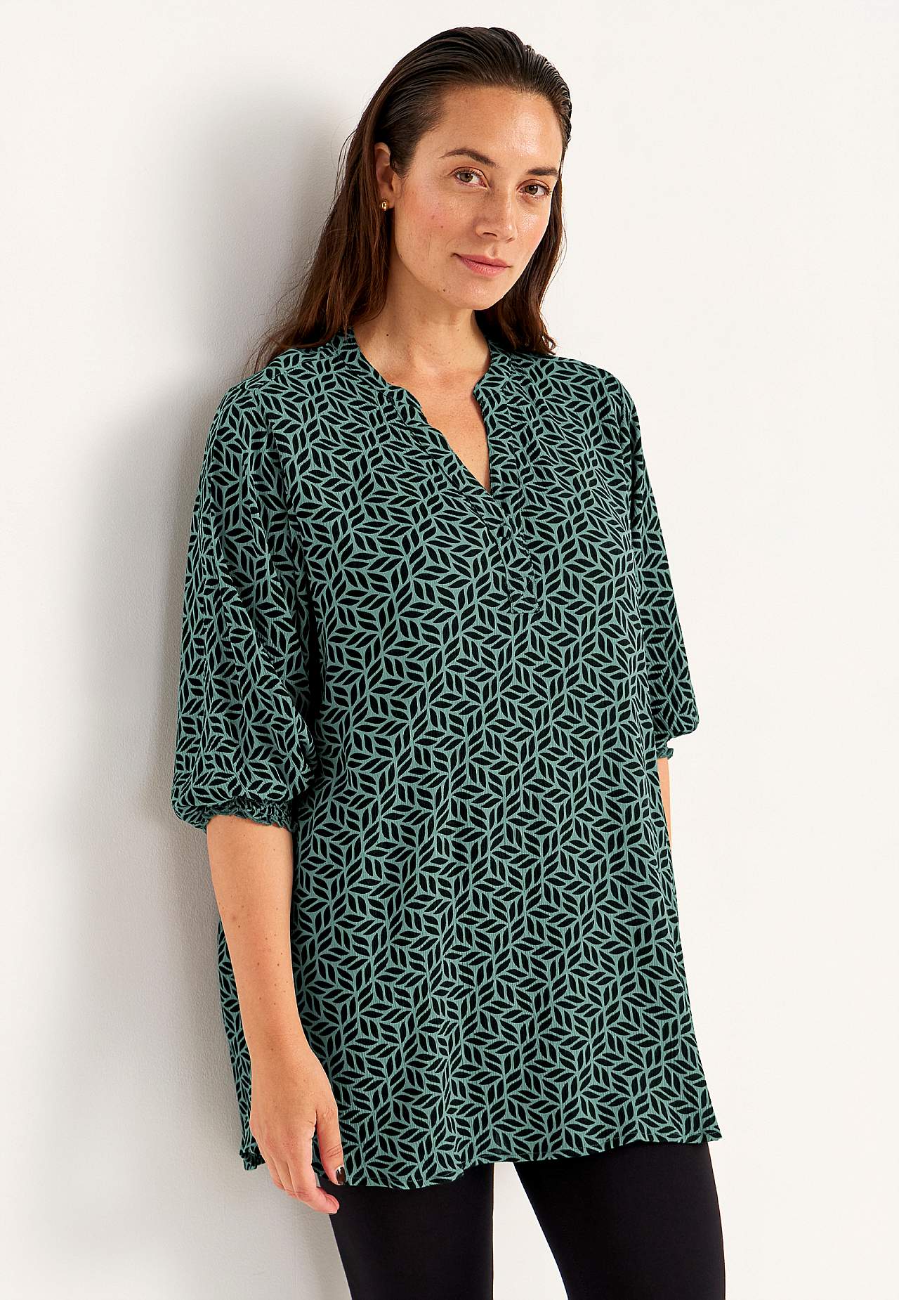 Austa krepauduma blūze. Plats piegriezums. 3/4 garuma piedurknes ar savilkumu piedurkņu galos. Garums no pleca atkarībā no izmēra: apmēram 78–88 cm.