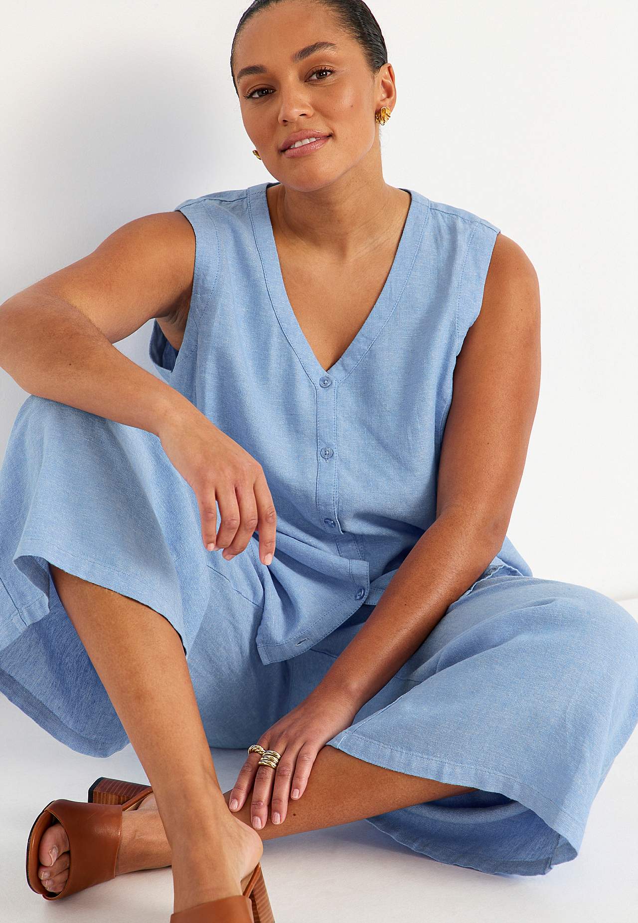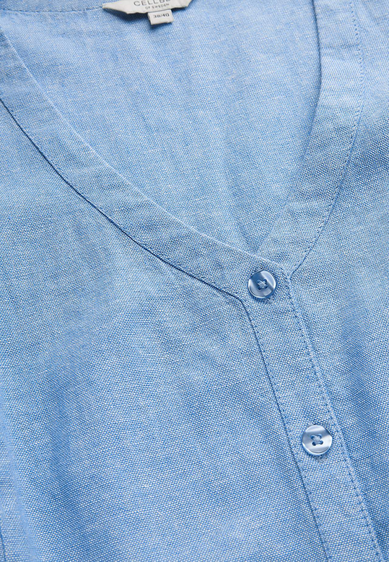 Bezpiedurkņu blūze no gaisīga lina un viskozes maisījuma. Standarta piegriezums. Pieguļošs piegriezums priekšpusē un mugurpusē. Noapaļota apakšmala. Iesakām saskaņot ar 702563. Garums mugurpusē atkarībā no izmēra: aptuveni 62–74 cm.