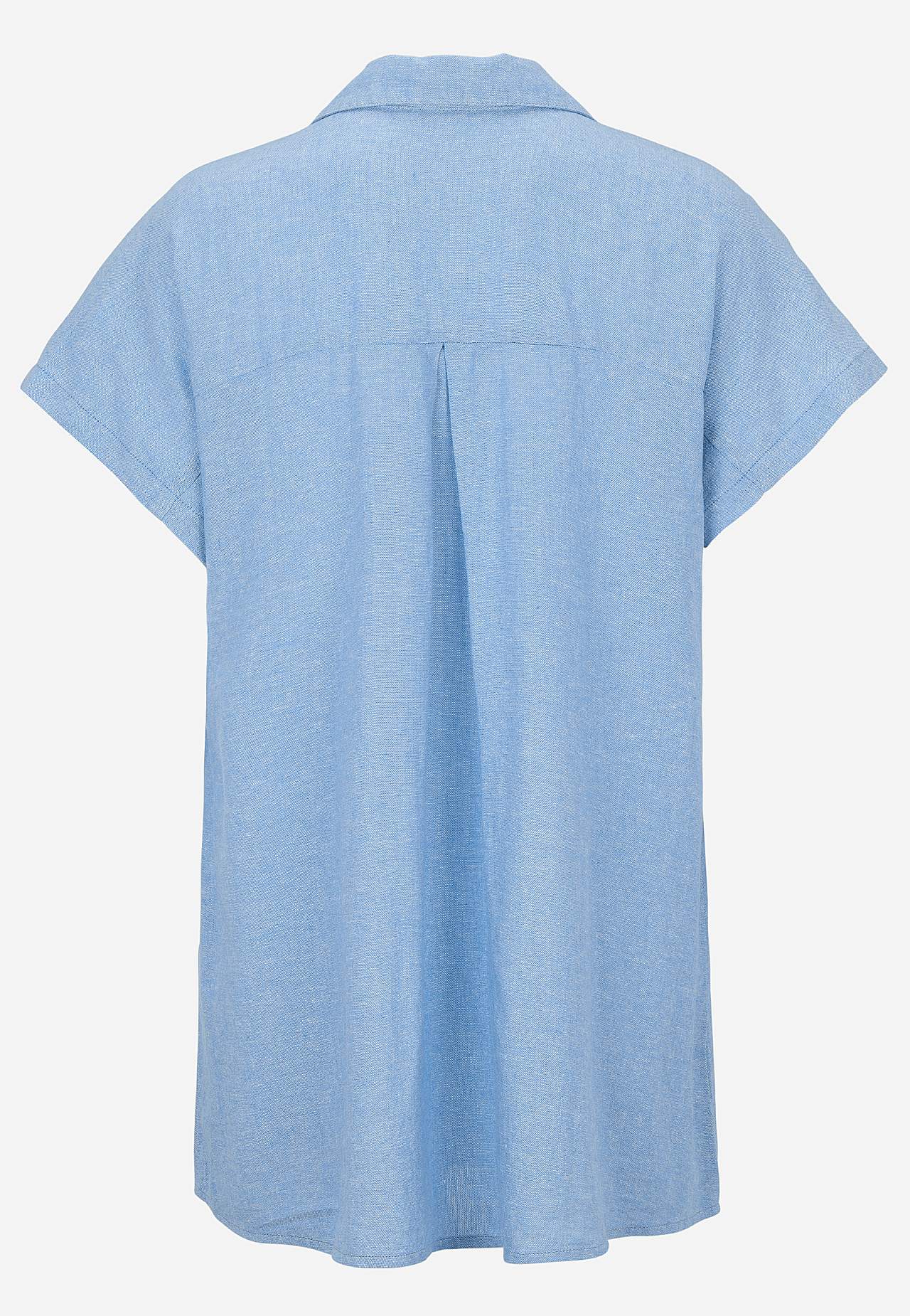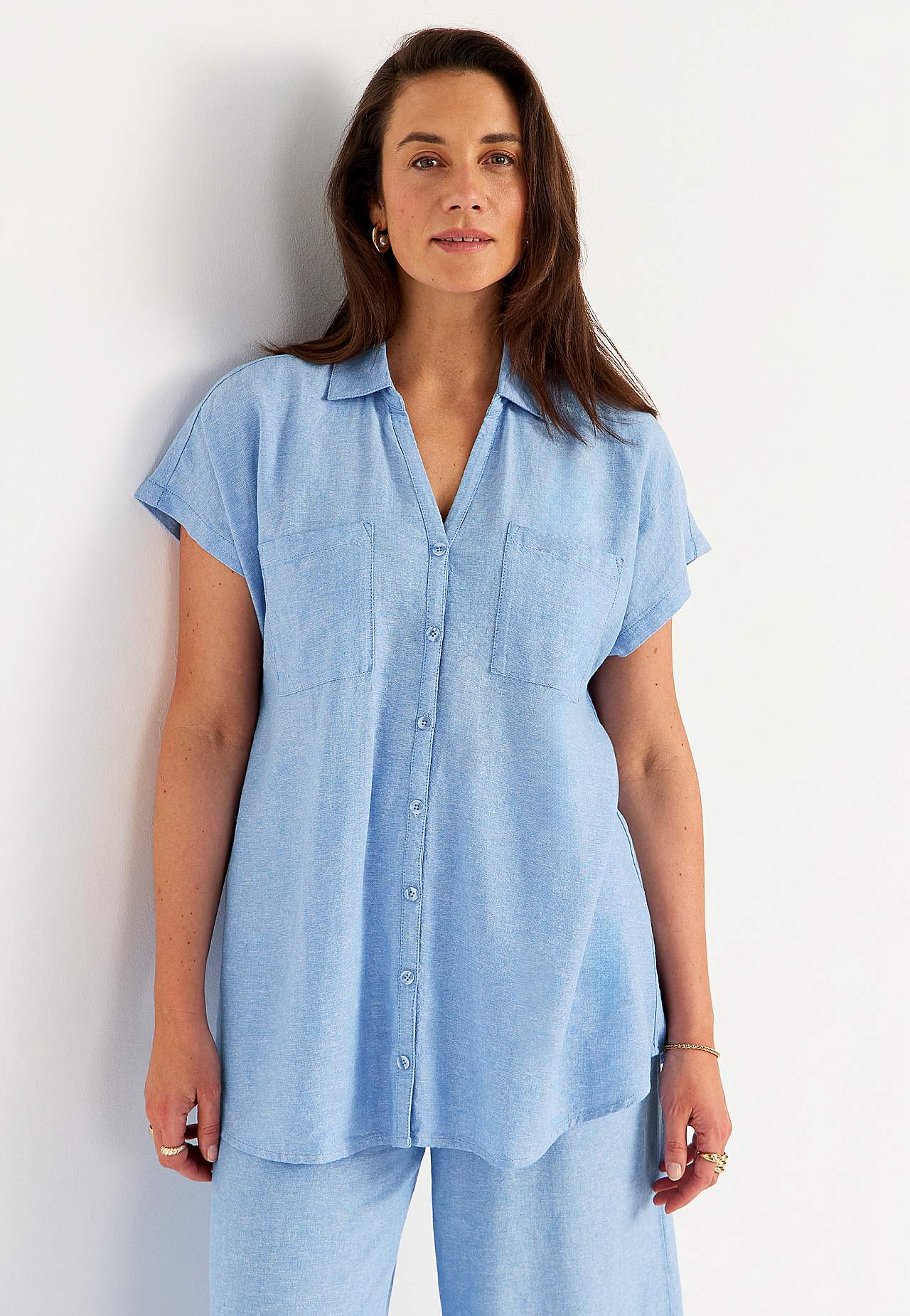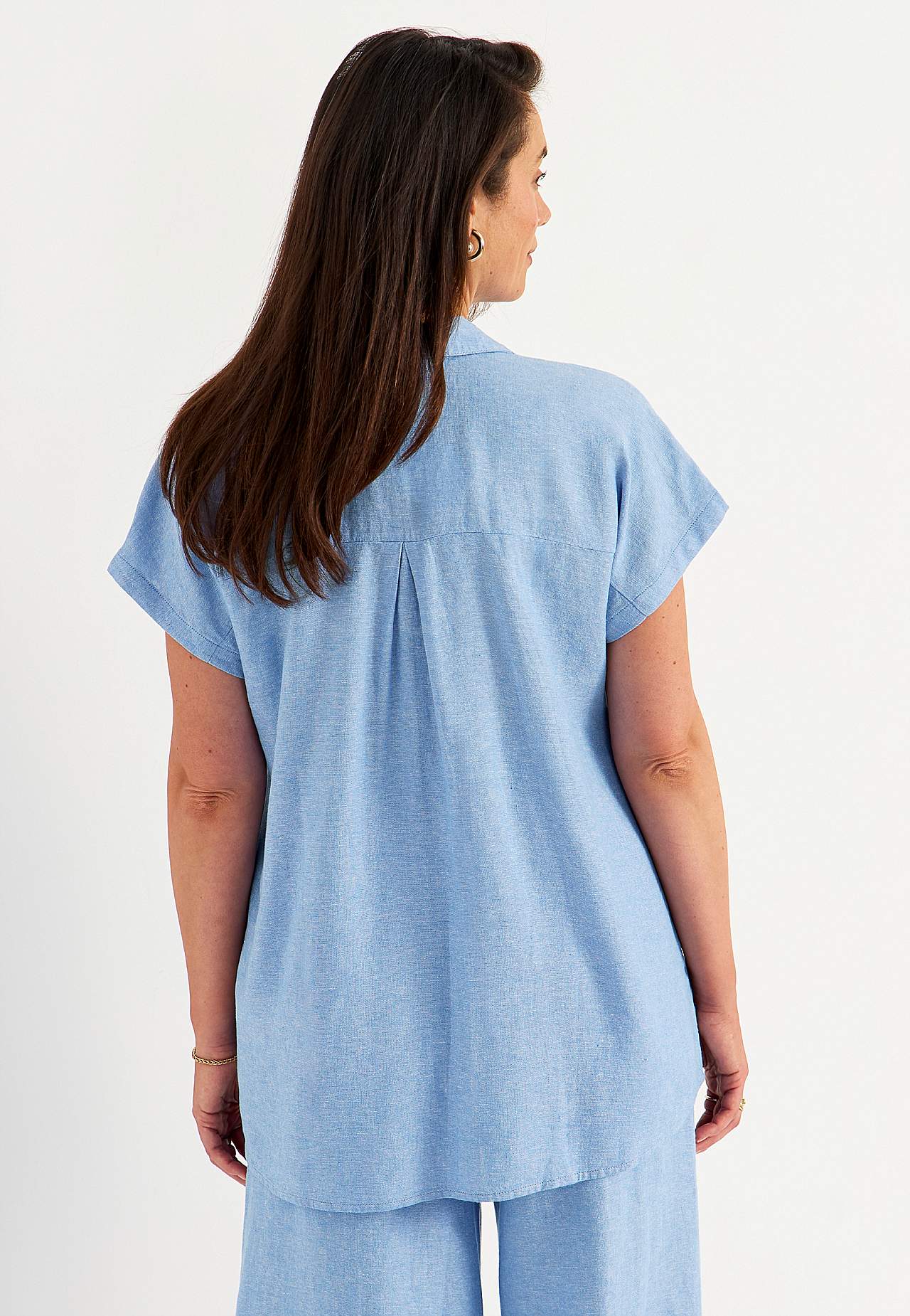 Garš krekls no gaisīga lina un viskozes maisījuma. Brīvs piegriezums. Krūšu kabatas. Atdaļa ar dekoratīvu ieloci mugurpusē. Noapaļota apakšmala. Garums no pleca atkarībā no izmēra: apmēram 77–84 cm.