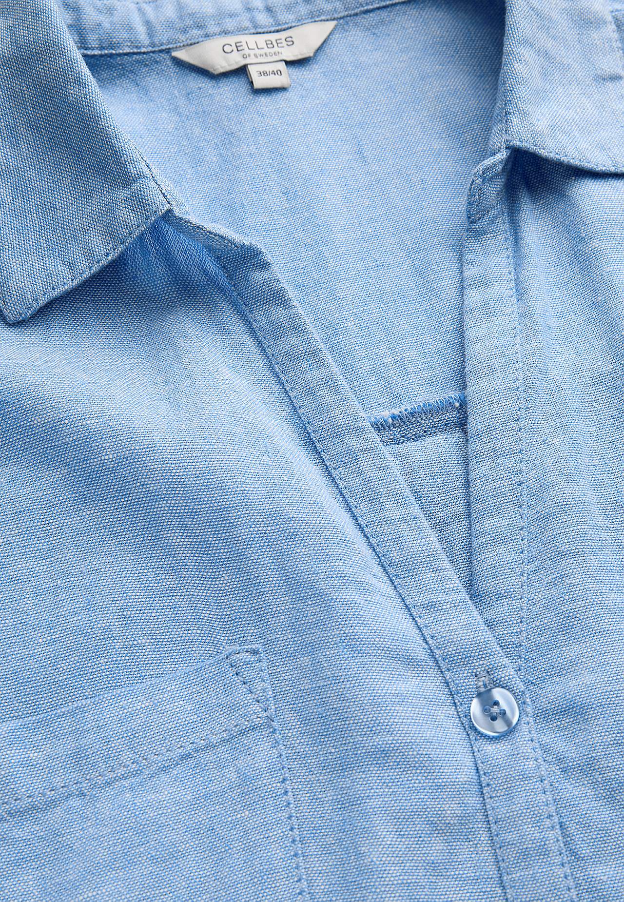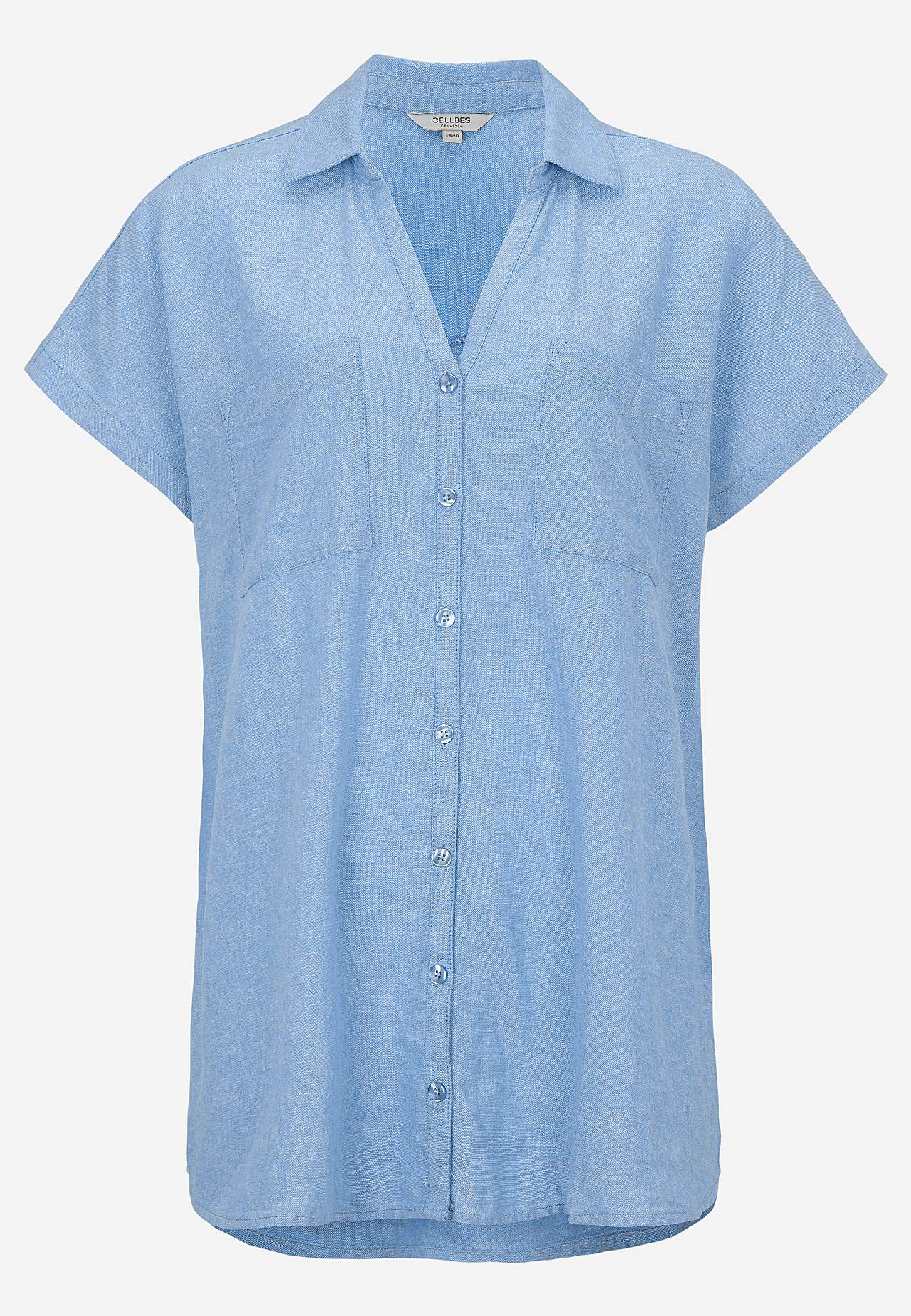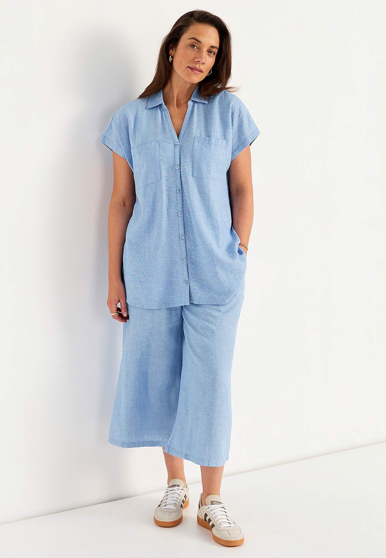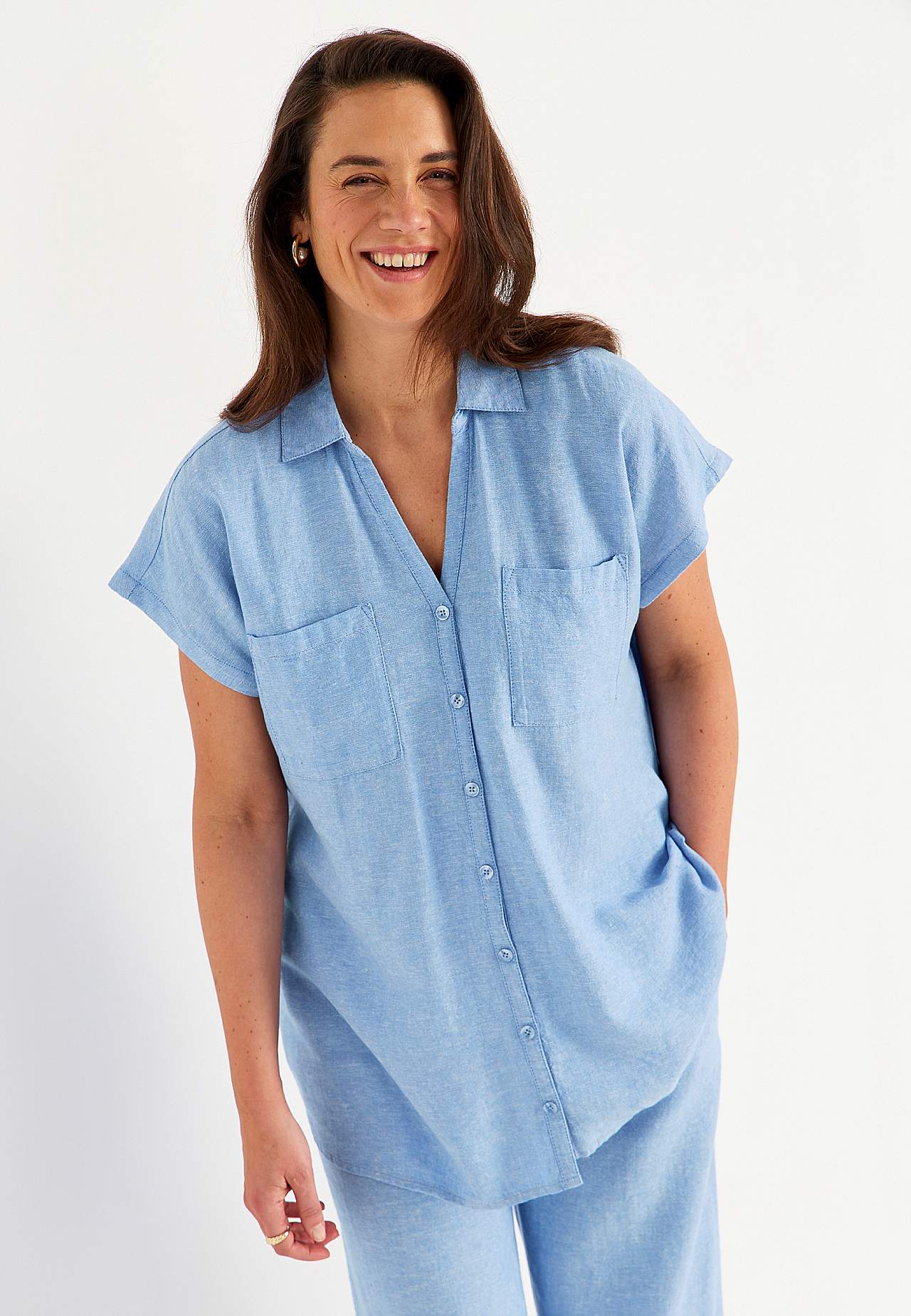Garš krekls no gaisīga lina un viskozes maisījuma. Brīvs piegriezums. Krūšu kabatas. Atdaļa ar dekoratīvu ieloci mugurpusē. Noapaļota apakšmala. Garums no pleca atkarībā no izmēra: apmēram 77–84 cm.