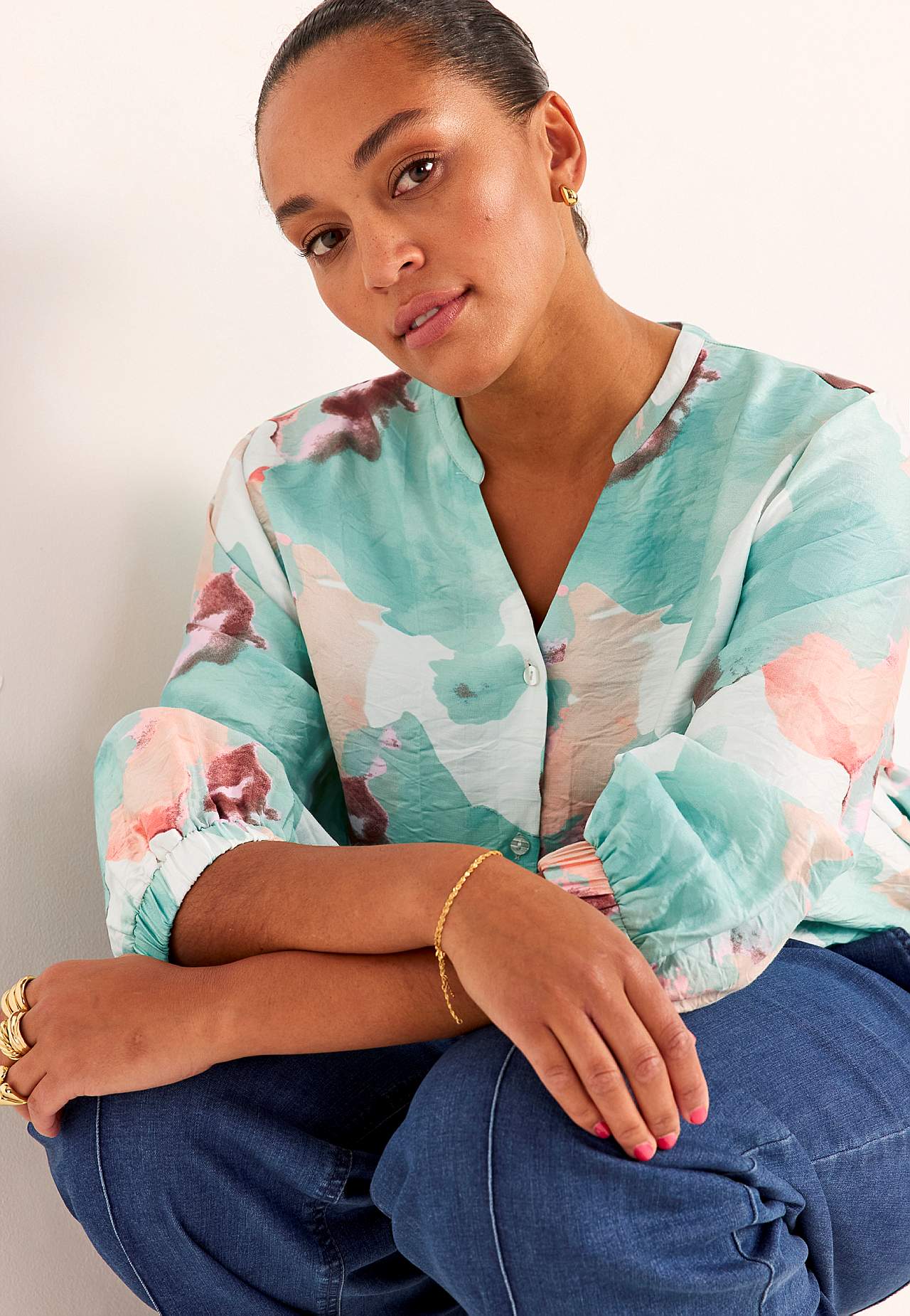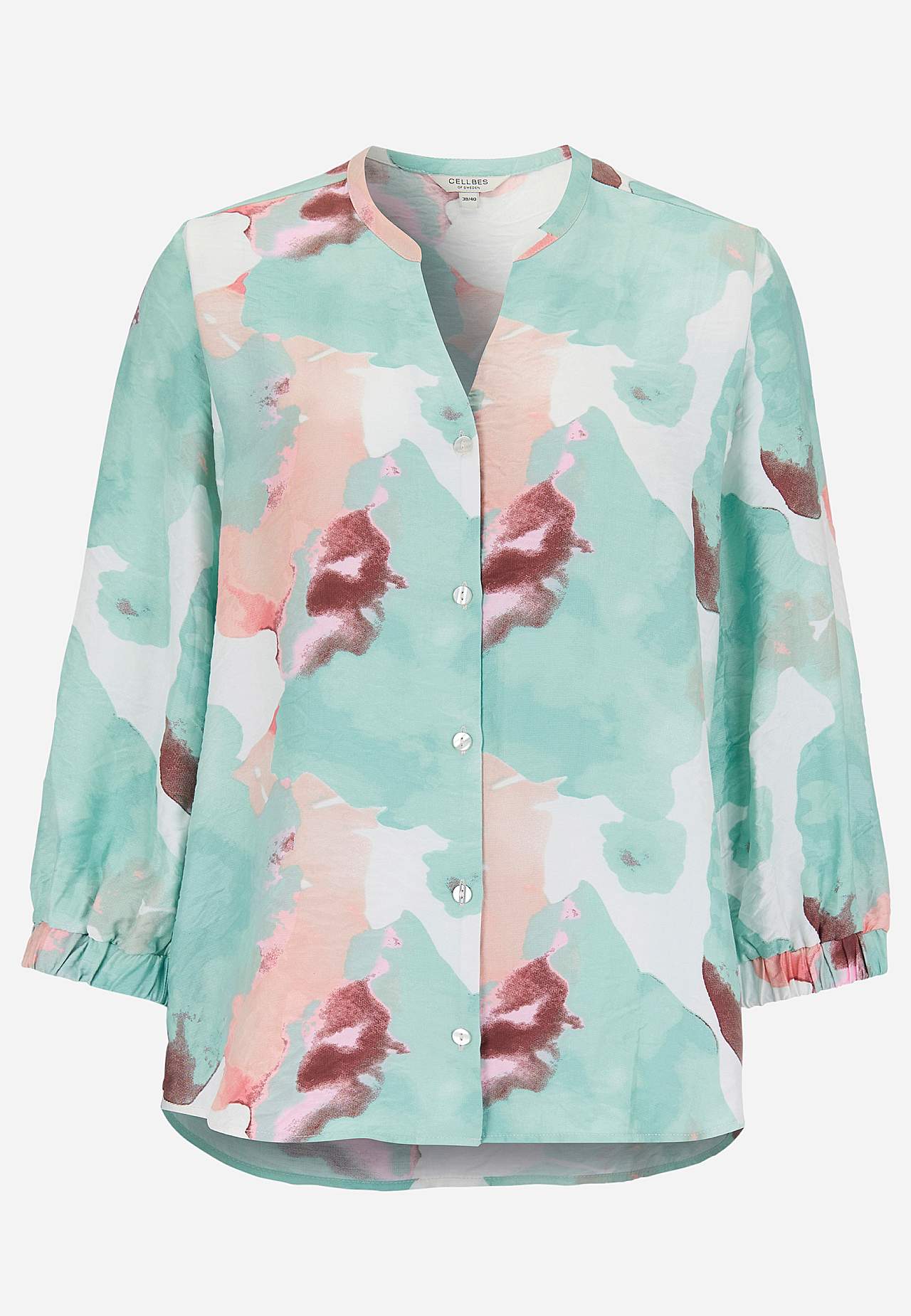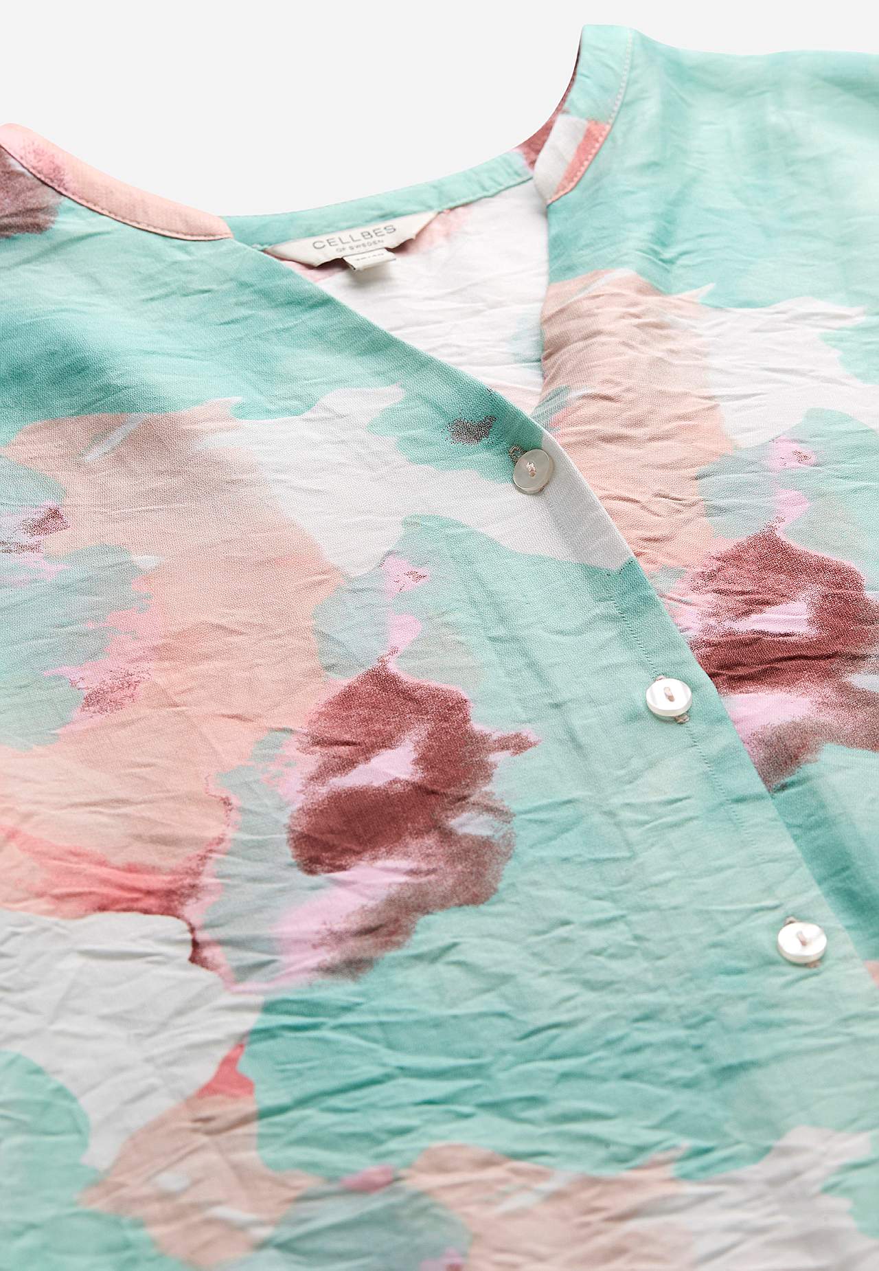 Nedaudz spīdīga teksturēta viskozes auduma blūze. Jauks kritums un atvēsinoša sajūta. Standarta piegriezums. Apaļš kakla izgriezums ar V veida atvērumu priekšpusē. Aizdare ar piecām glītām pogām. Nedaudz noapaļota apakšmala. Garums no pleca atbilstīgi izmēram aptuveni 62-76 cm.