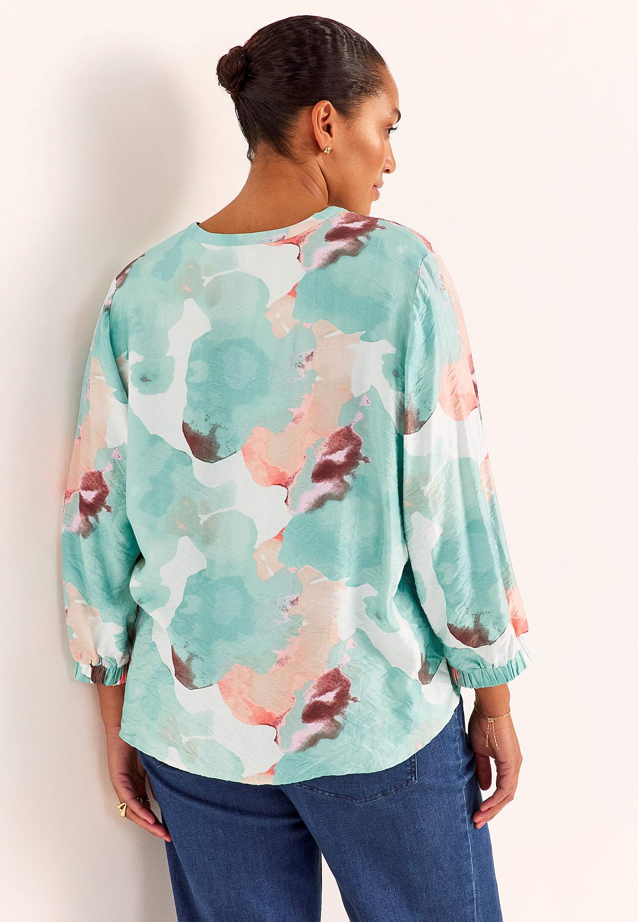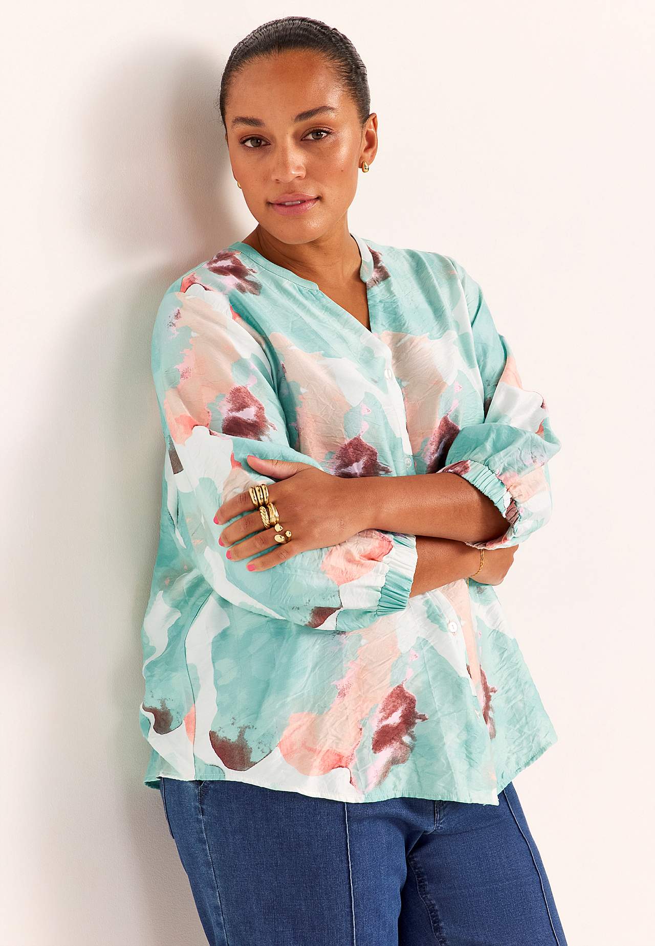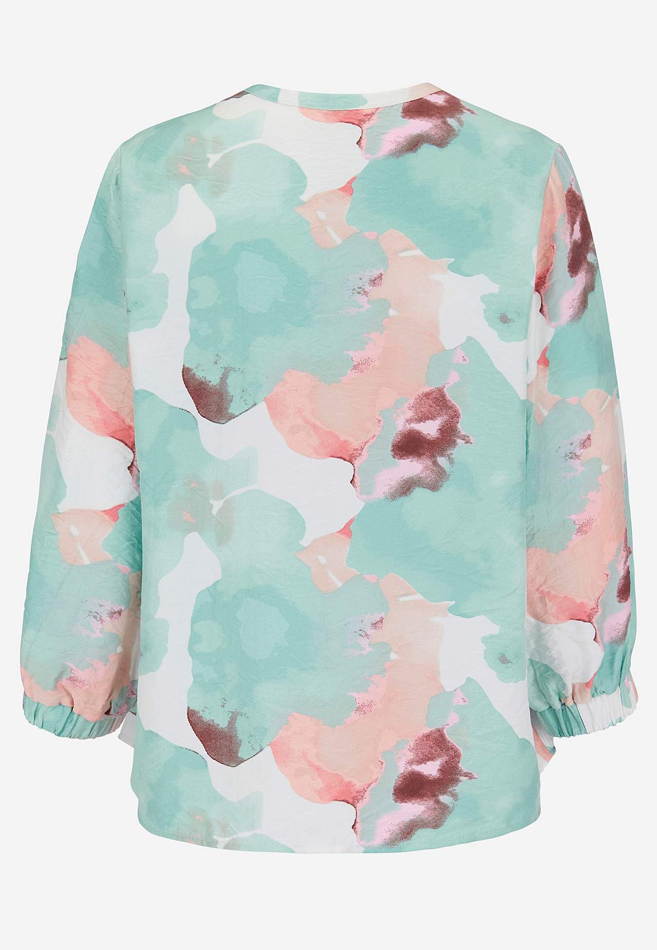 Nedaudz spīdīga teksturēta viskozes auduma blūze. Jauks kritums un atvēsinoša sajūta. Standarta piegriezums. Apaļš kakla izgriezums ar V veida atvērumu priekšpusē. Aizdare ar piecām glītām pogām. Nedaudz noapaļota apakšmala. Garums no pleca atbilstīgi izmēram aptuveni 62-76 cm.