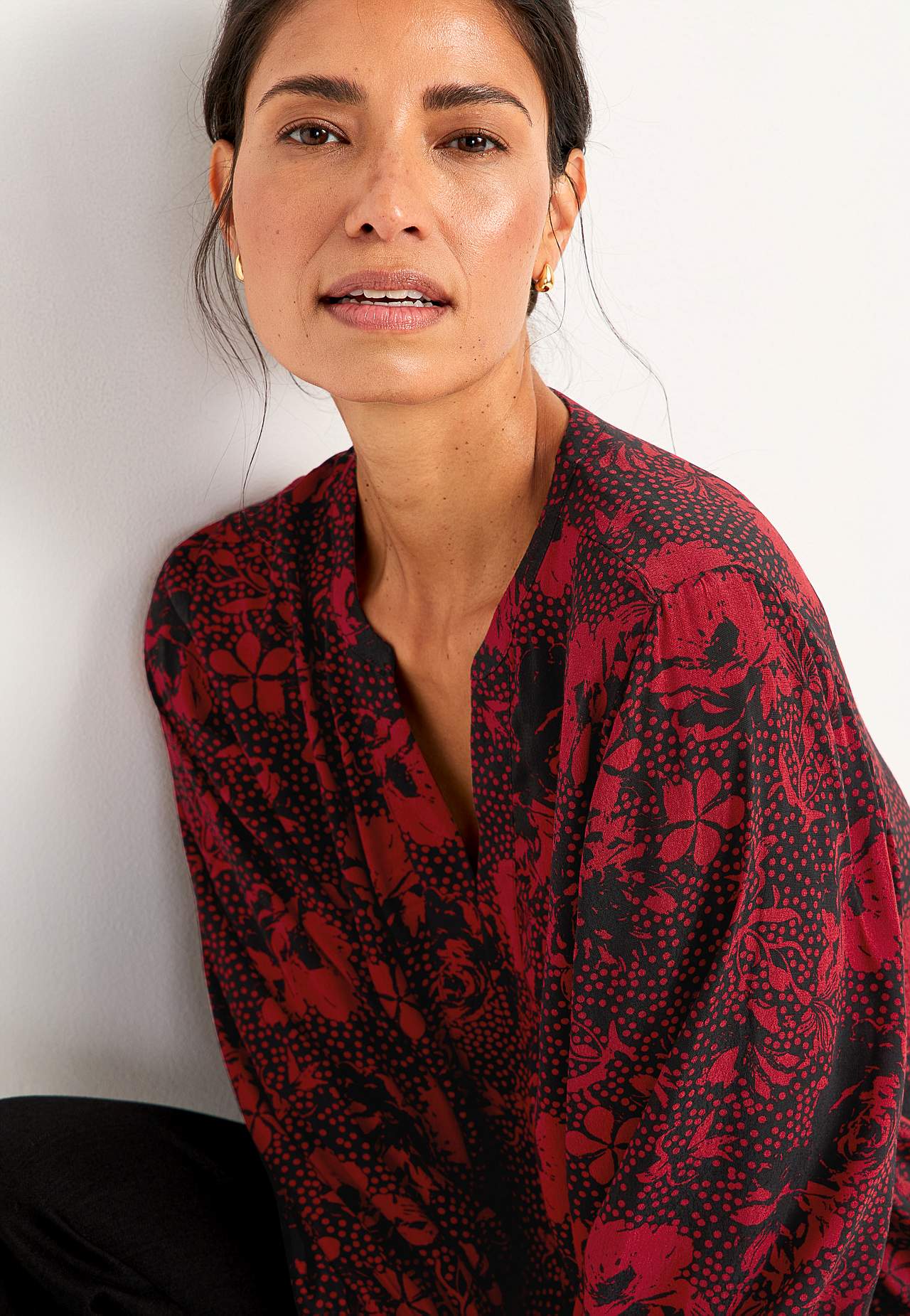 Mīksta padevīga auduma blūze. Standarta piegriezums. Viegla A silueta modelis. V veida kakla izgriezums. Noapaļota apakšmala. Garums no pleca atbilstīgi izmēram aptuveni 61-79 cm.