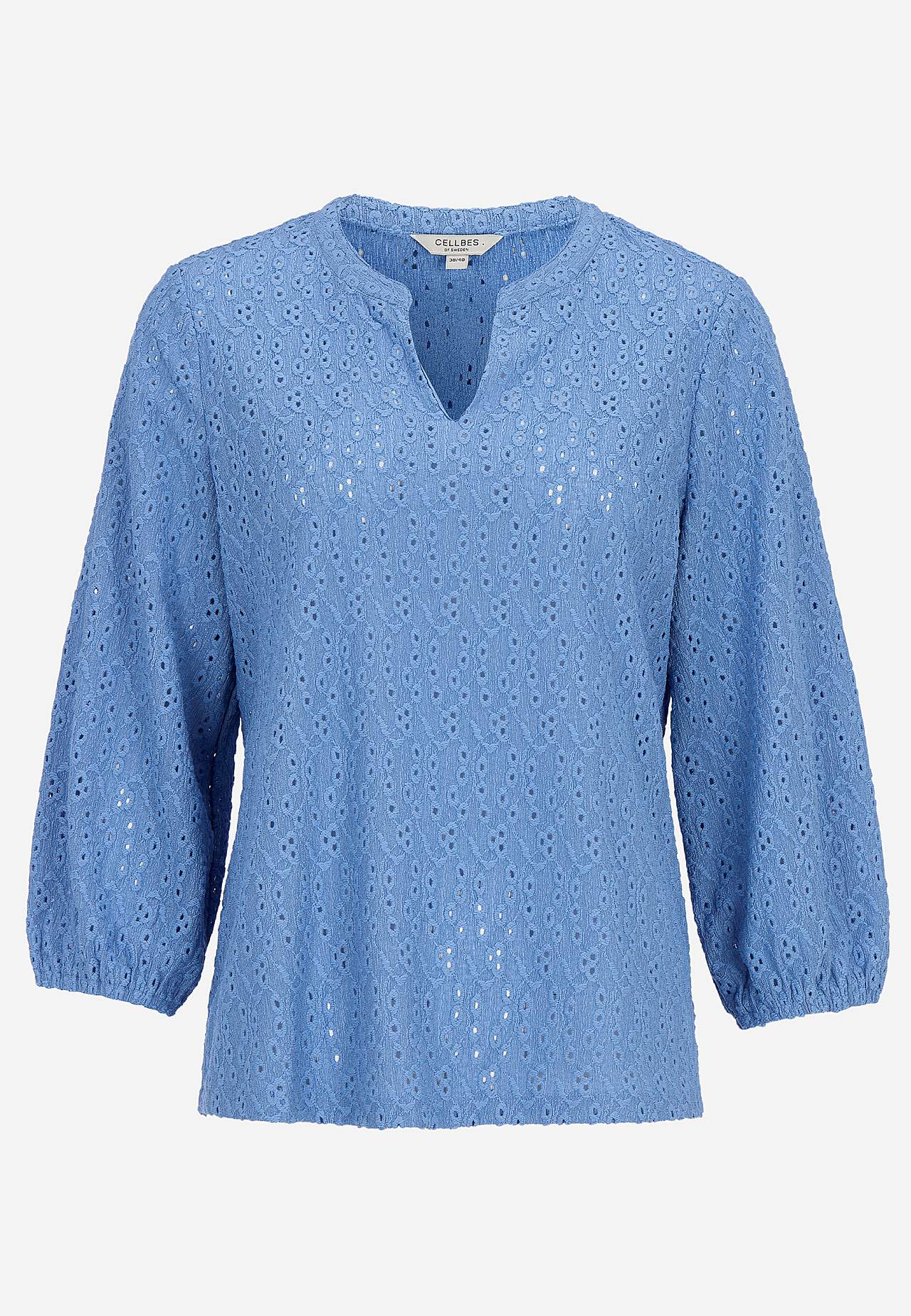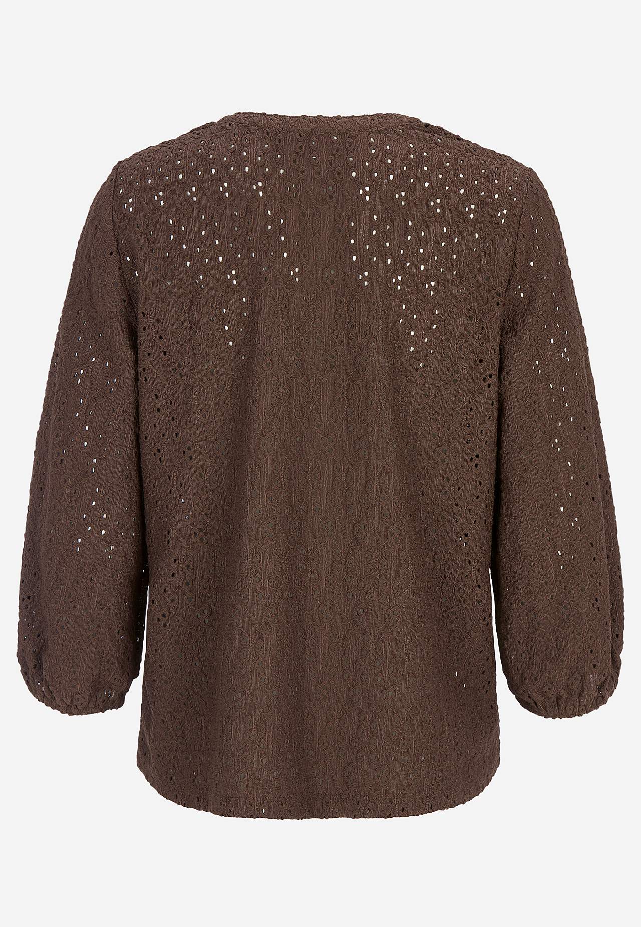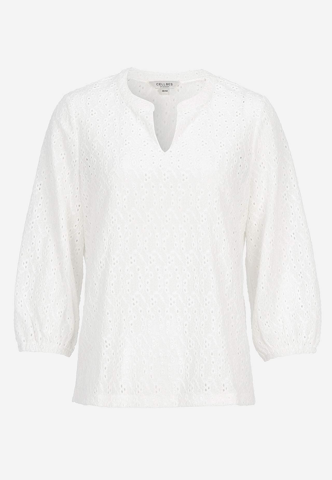 Elastīgs tops ar teksturētu caurumiņu raksta izšuvumu. Standarta piegriezums, viegls A siluets. Apaļš kakla izgriezums ar V veida atvērumu priekšpusē. Platas 3/4 garuma piedurknes ar gumiju galā. Nedaudz noapaļota apakšmala. Garums mugurpusē atbilstīgi izmēram aptuveni 61-75 cm.
