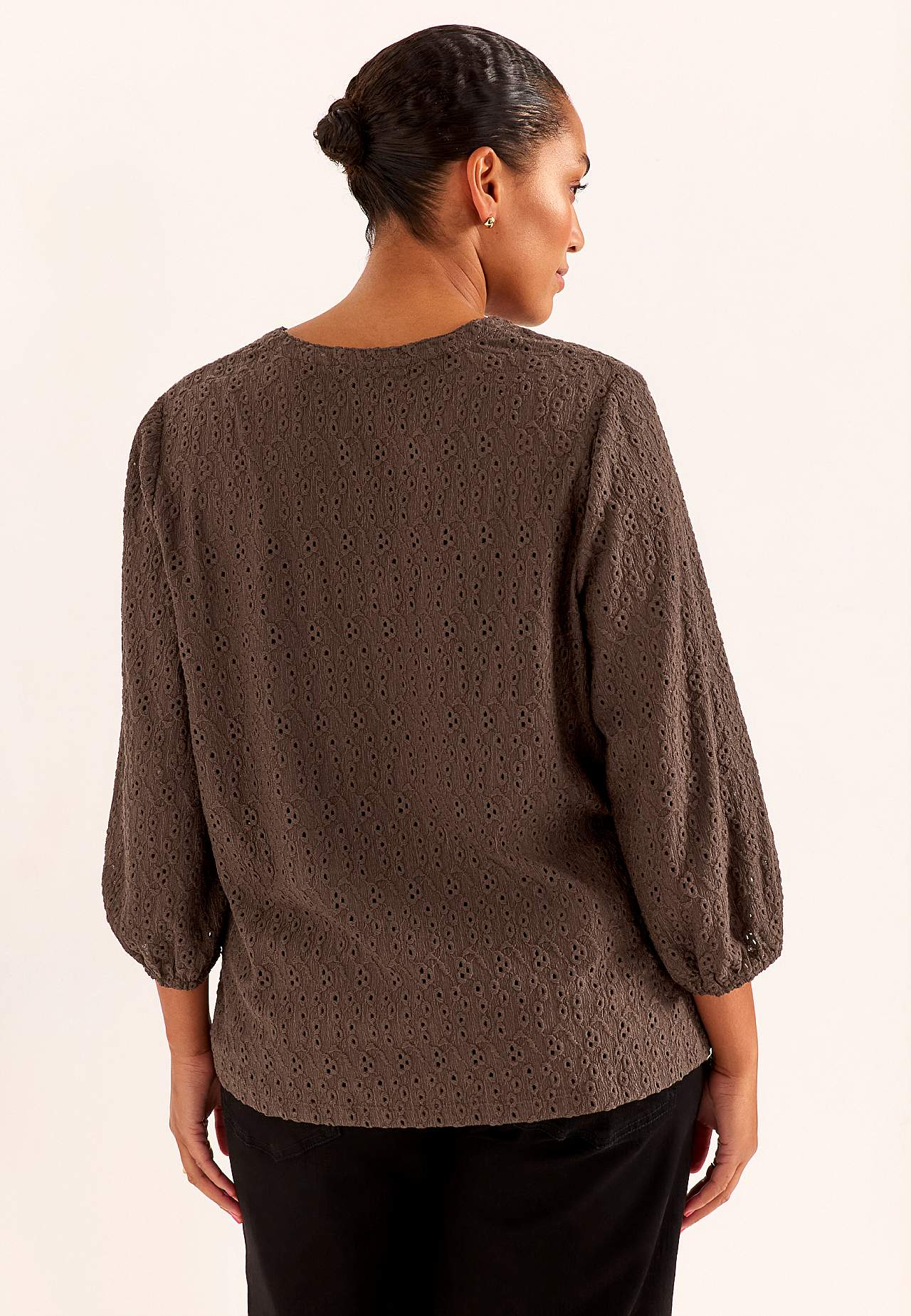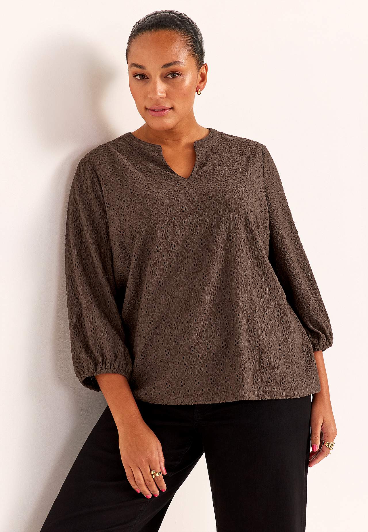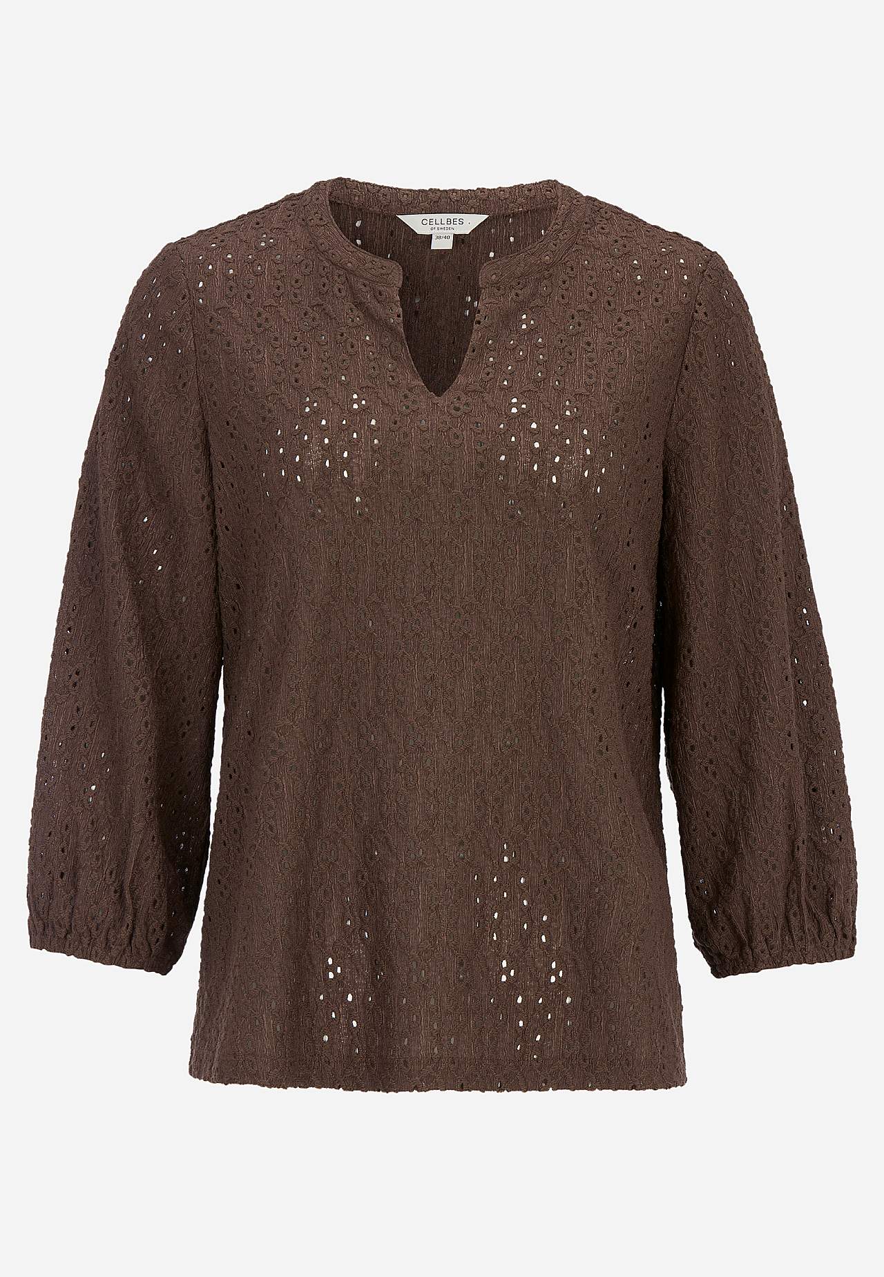 Elastīgs tops ar teksturētu caurumiņu raksta izšuvumu. Standarta piegriezums, viegls A siluets. Apaļš kakla izgriezums ar V veida atvērumu priekšpusē. Platas 3/4 garuma piedurknes ar gumiju galā. Nedaudz noapaļota apakšmala. Garums mugurpusē atbilstīgi izmēram aptuveni 61-75 cm.