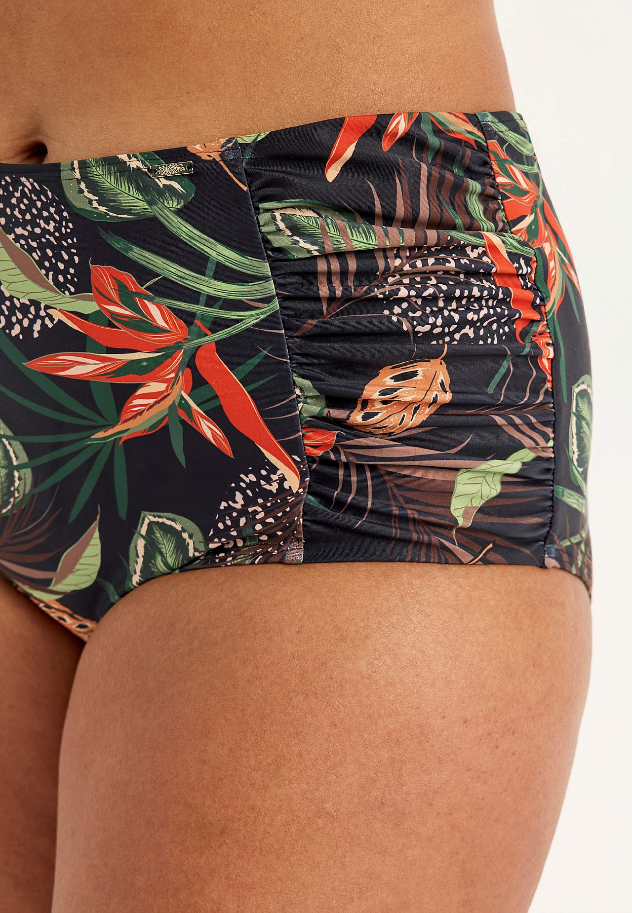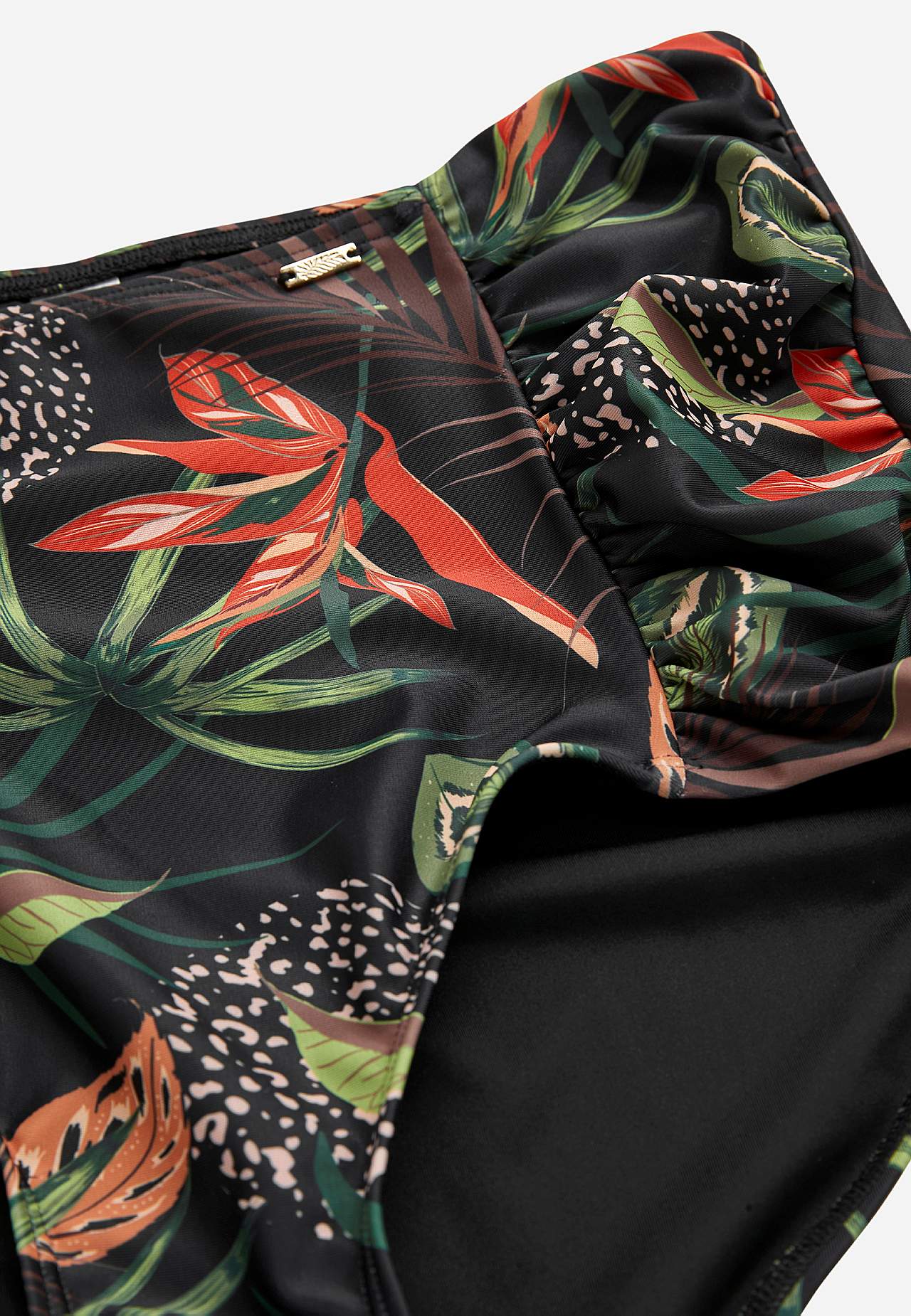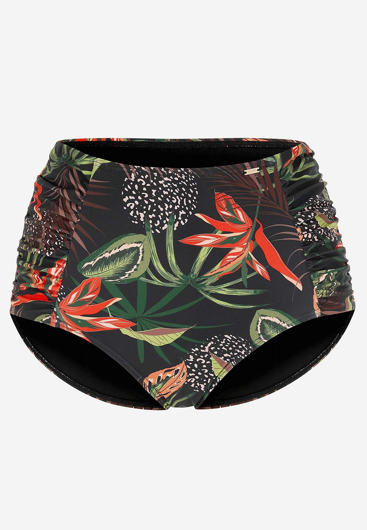 Bikini biksītes no pārstrādāta poliestera. Augsta jostasvieta. Skaists raksts gan priekšpusē, gan mugurpusē. Dekoratīvs krokojums sānos. Pilnībā oderēta iekšpuse.