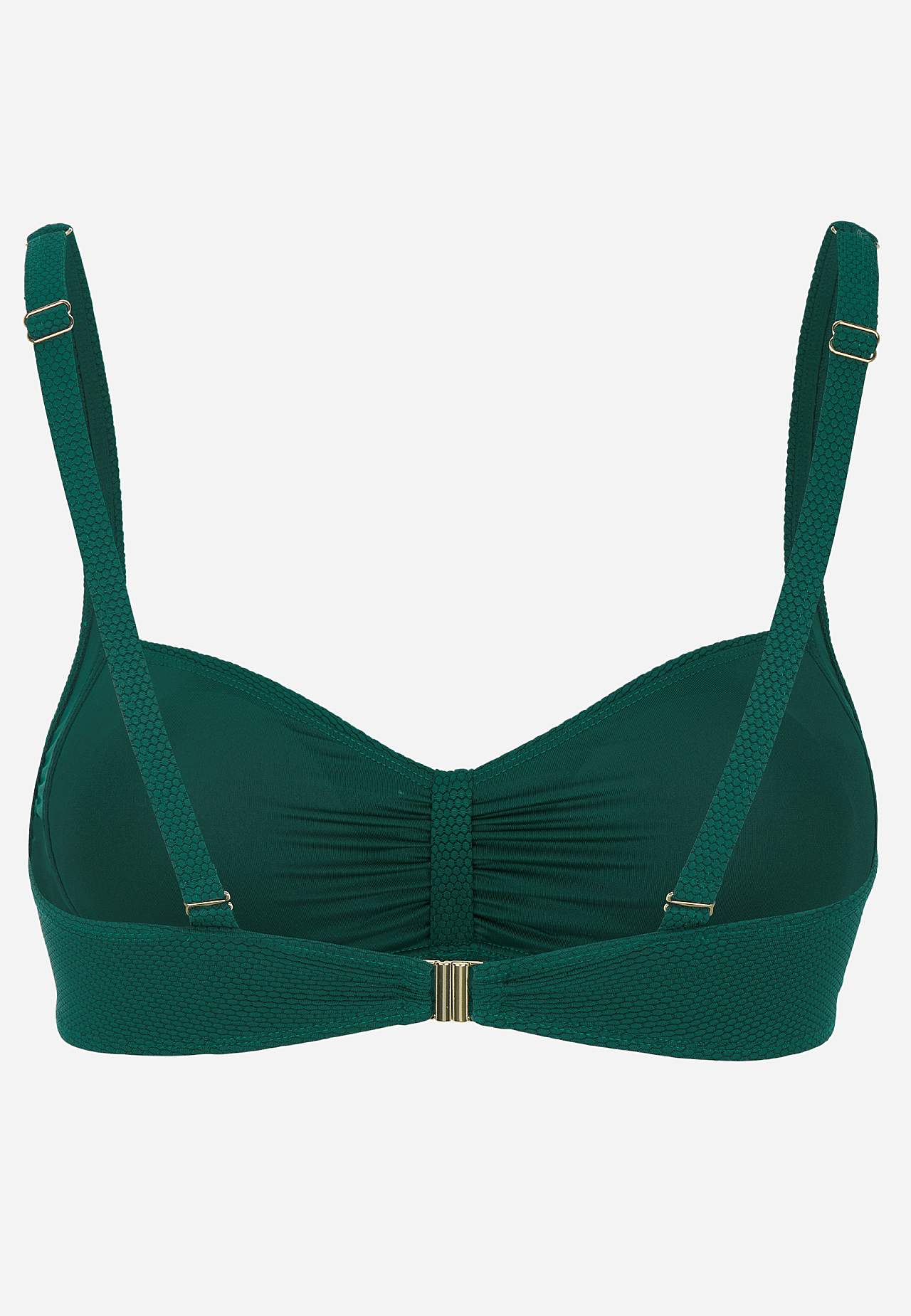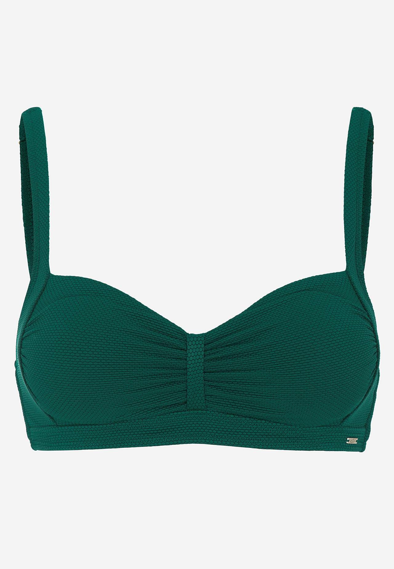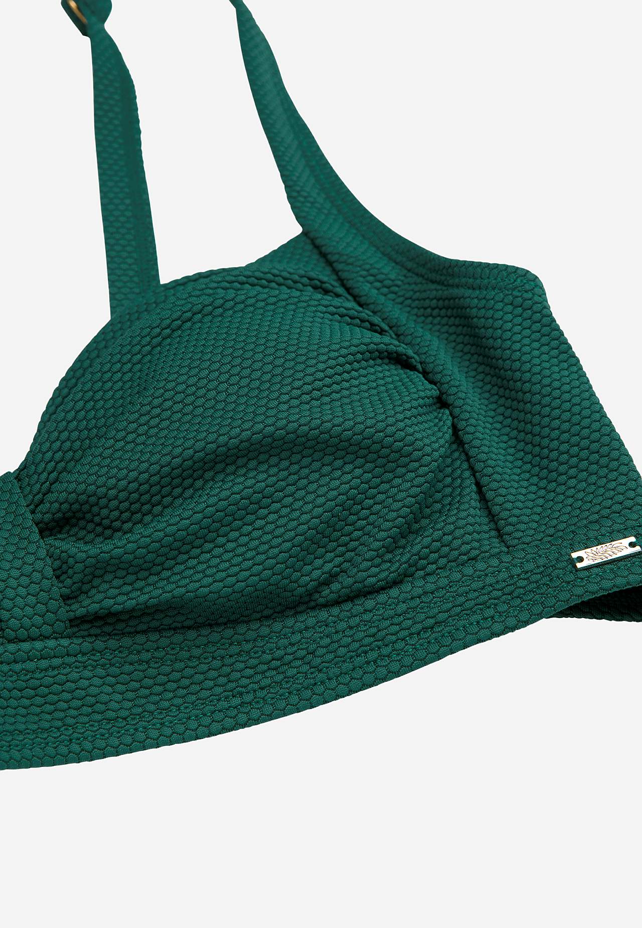 Teksturēta bikini augšdaļa ar krokojumu pāri krūtīm. Mīksts modelis bez stīpiņām, ar balstošu sānu daļu. Pārstrādāta poliestera materiāls. Bļodiņas ar izņemamu polsterējumu. Regulējamas plecu lencītes. Viegli aiztaisāma metāla sprādze mugurpusē.