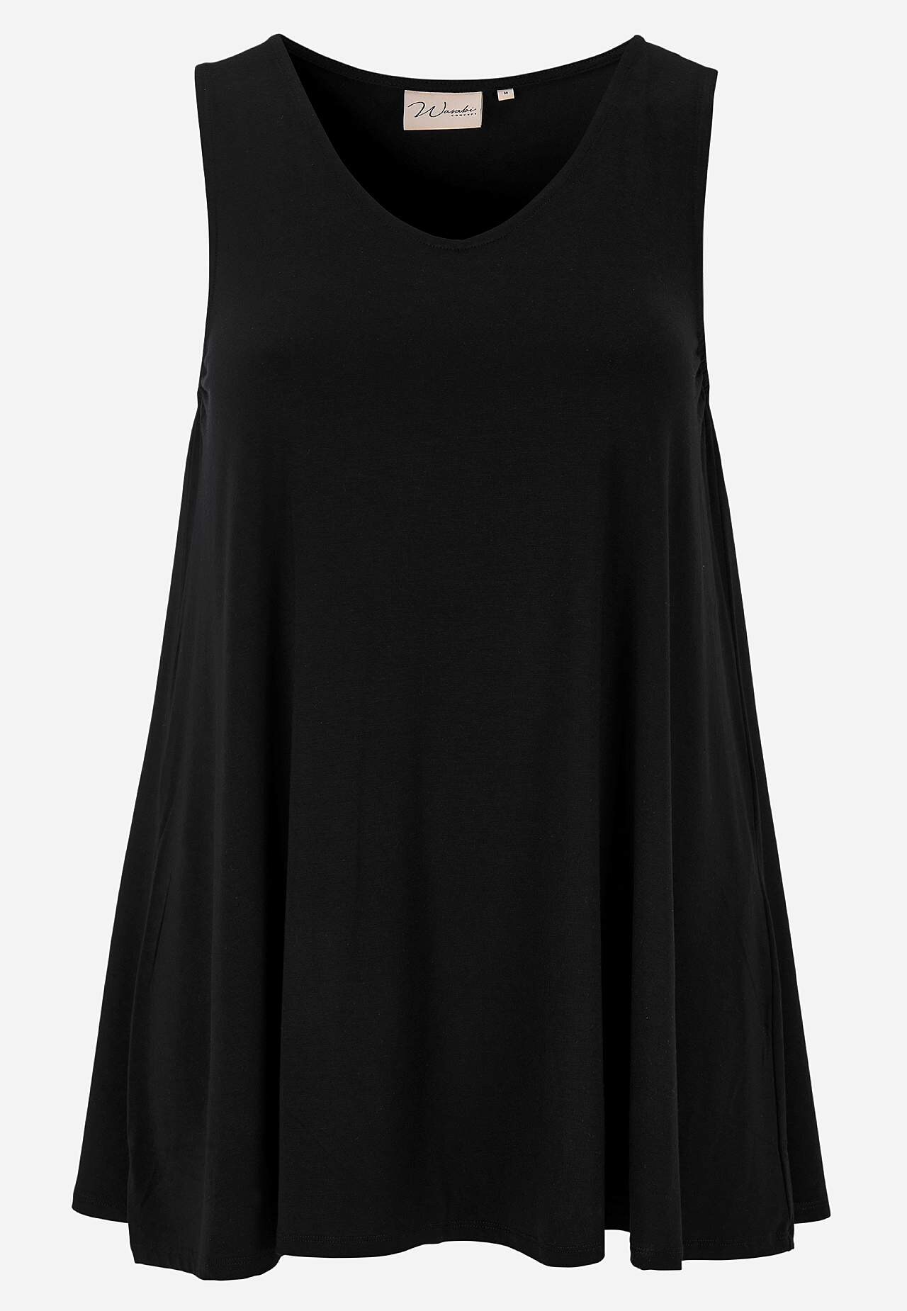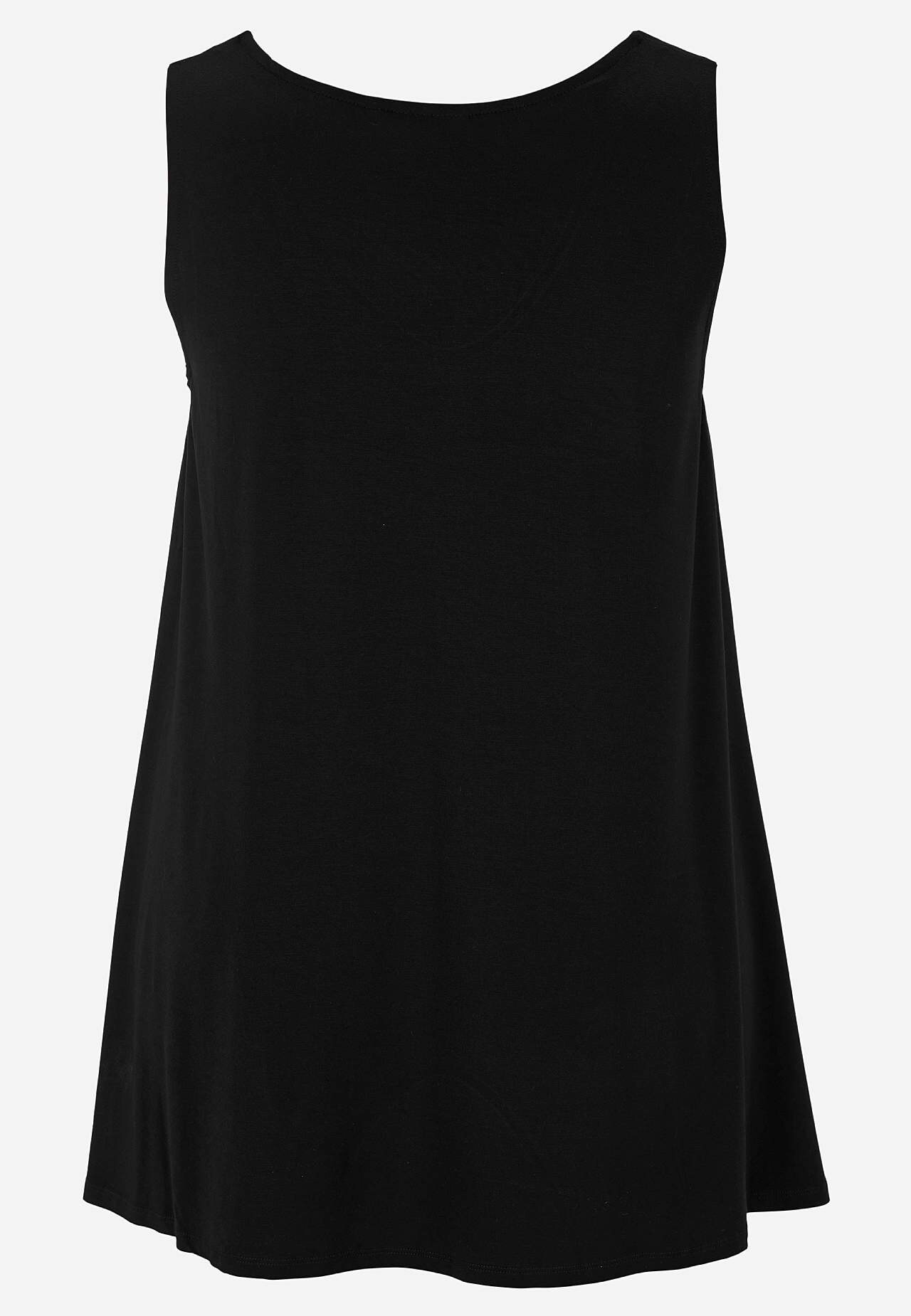 Mīksts elastīga liocela tops bez piedurknēm. A siluets. Noapaļots kakla izgriezums. Gumija zem rokriņķiem nodrošina ērtu valkāšanu. Noapaļota apakšmala. Iesakām saskaņot ar 700916. M (46./48.) izmēra garums apm. 84 cm.